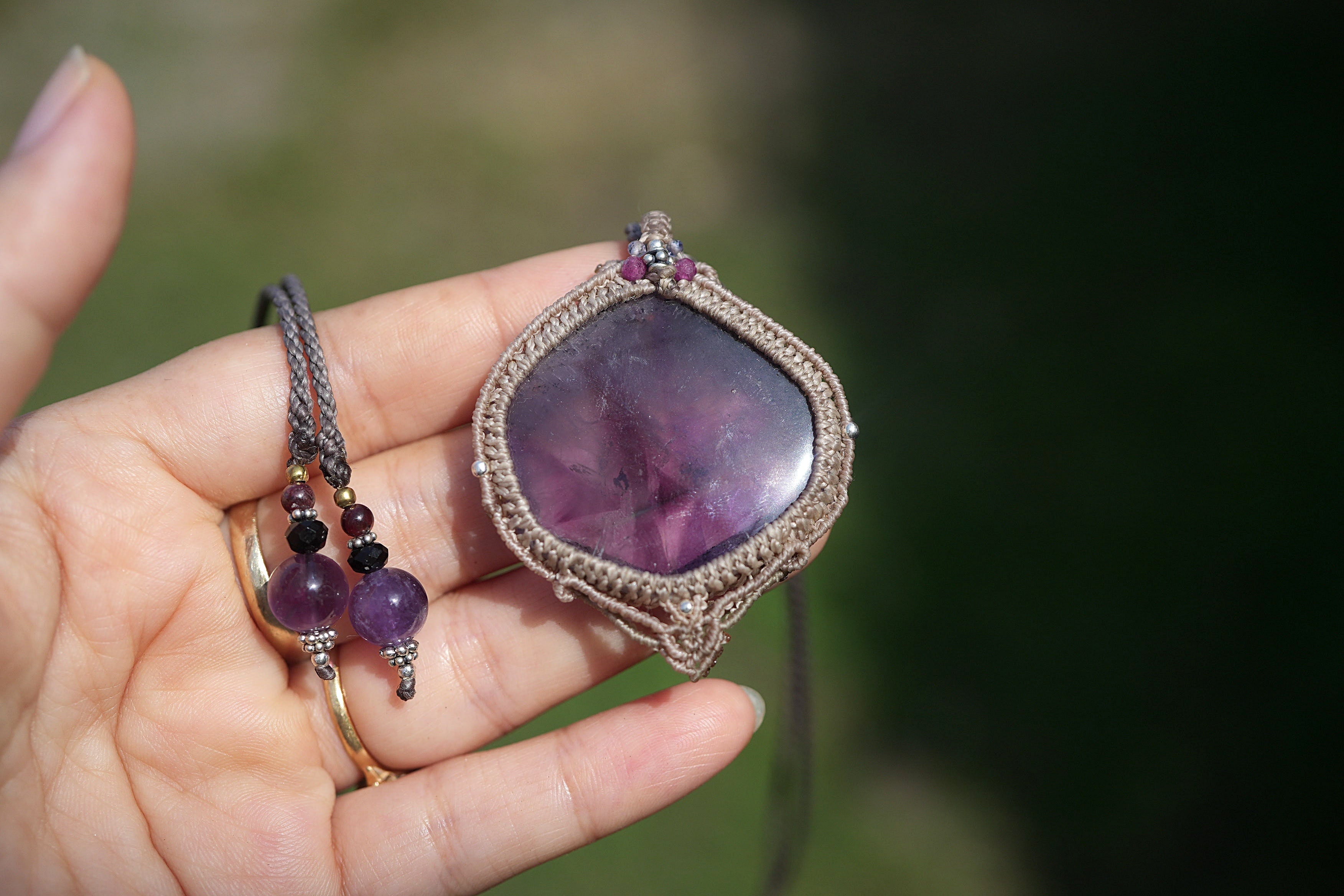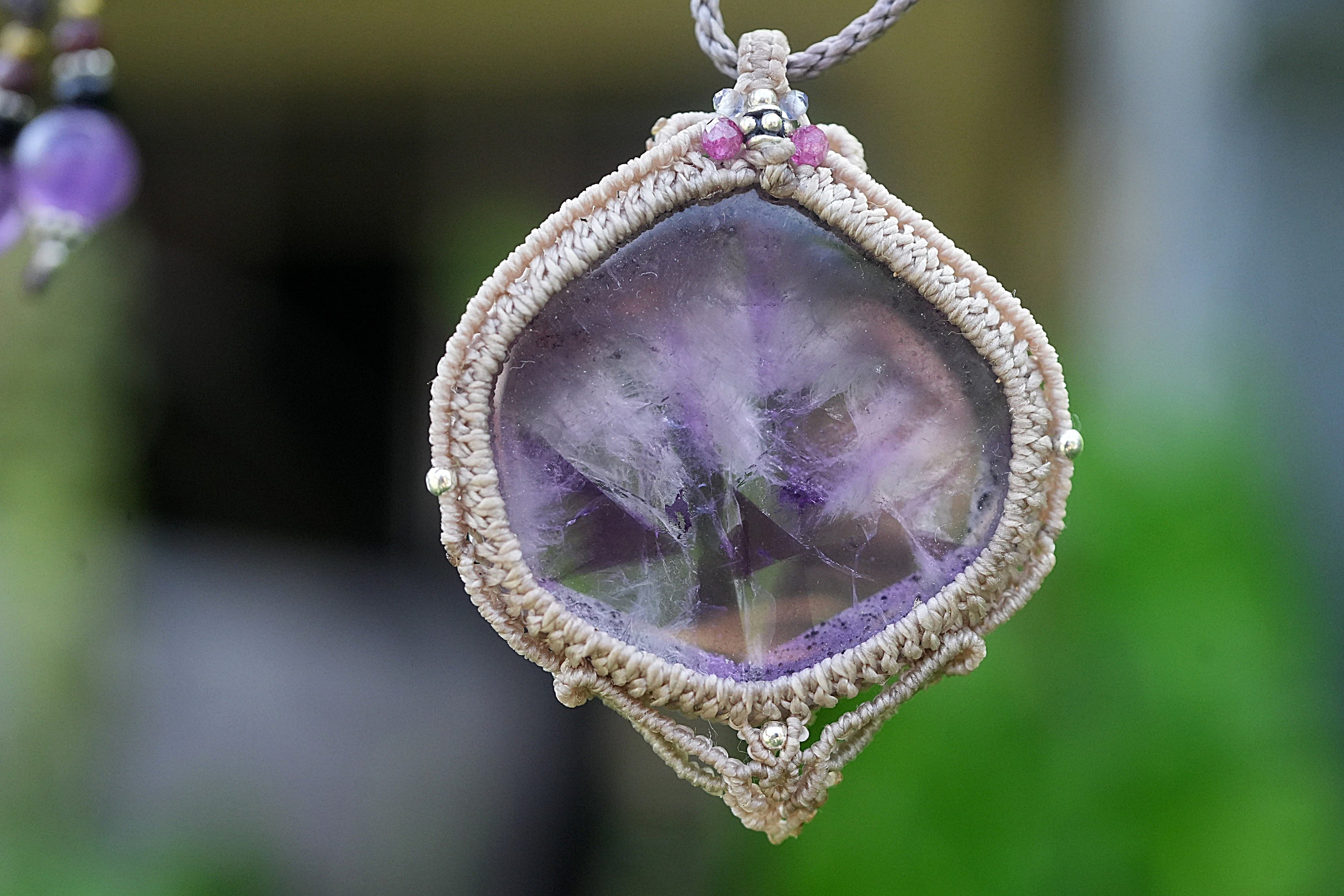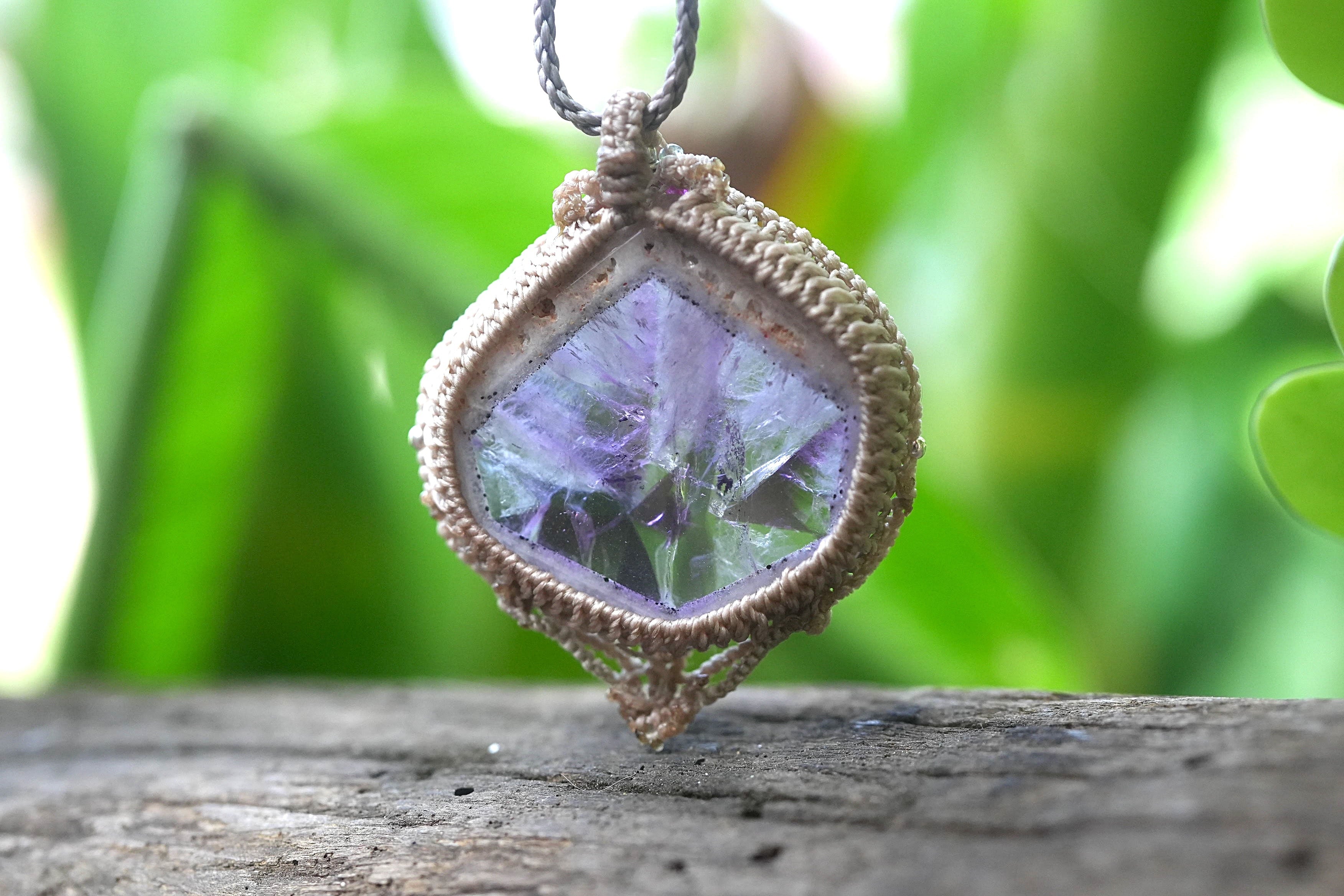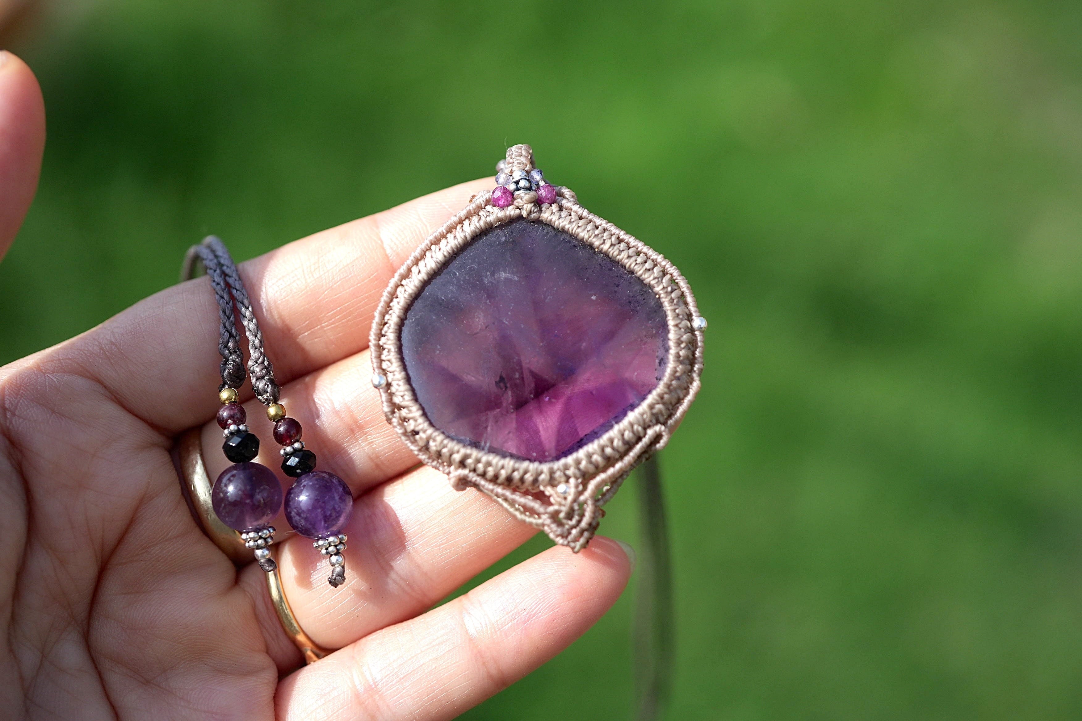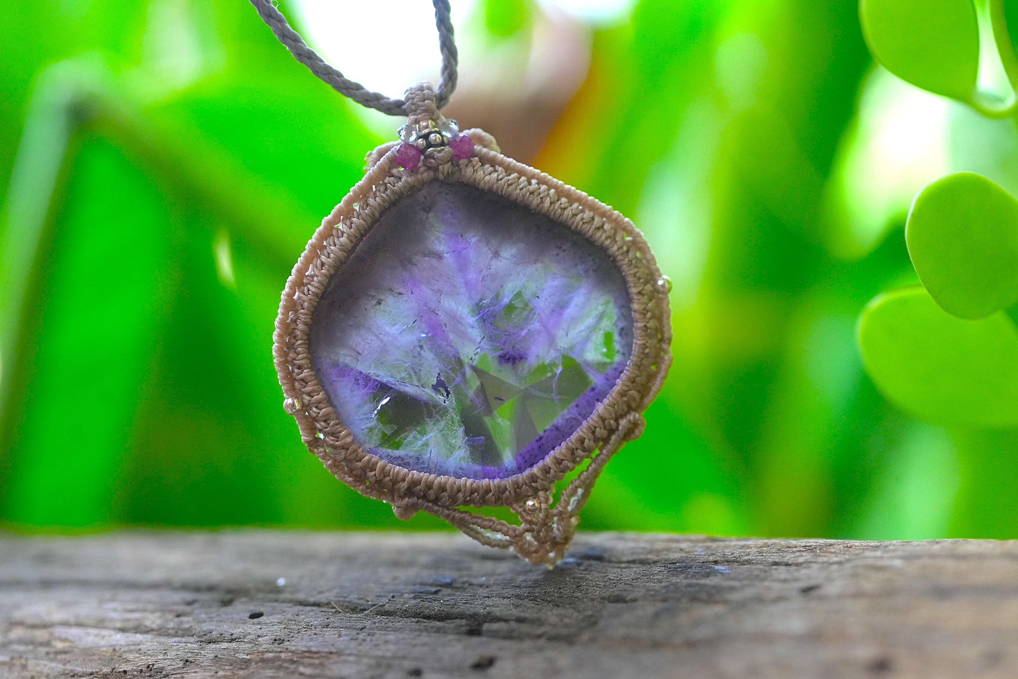 石の周りをマクラメ編み装飾。