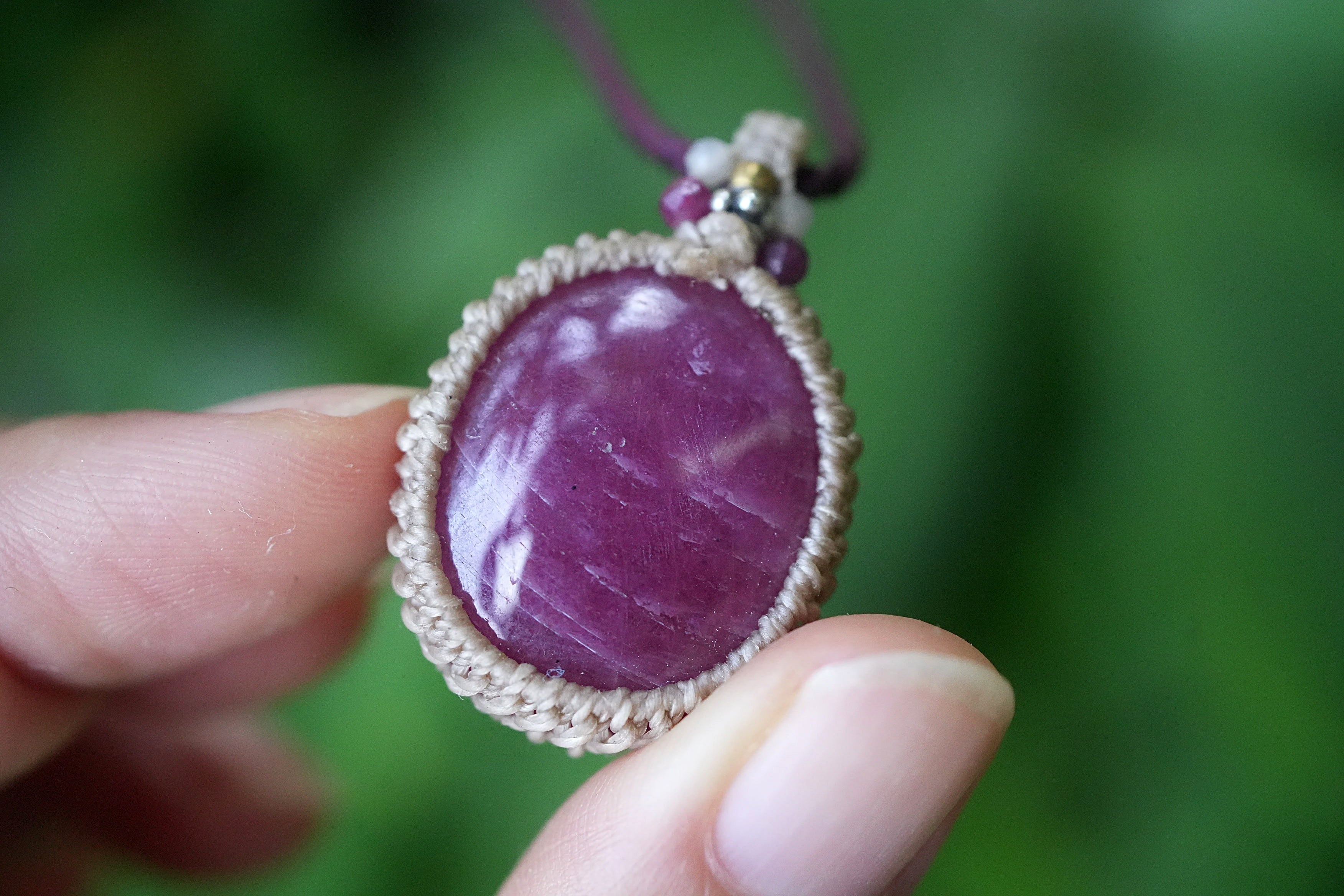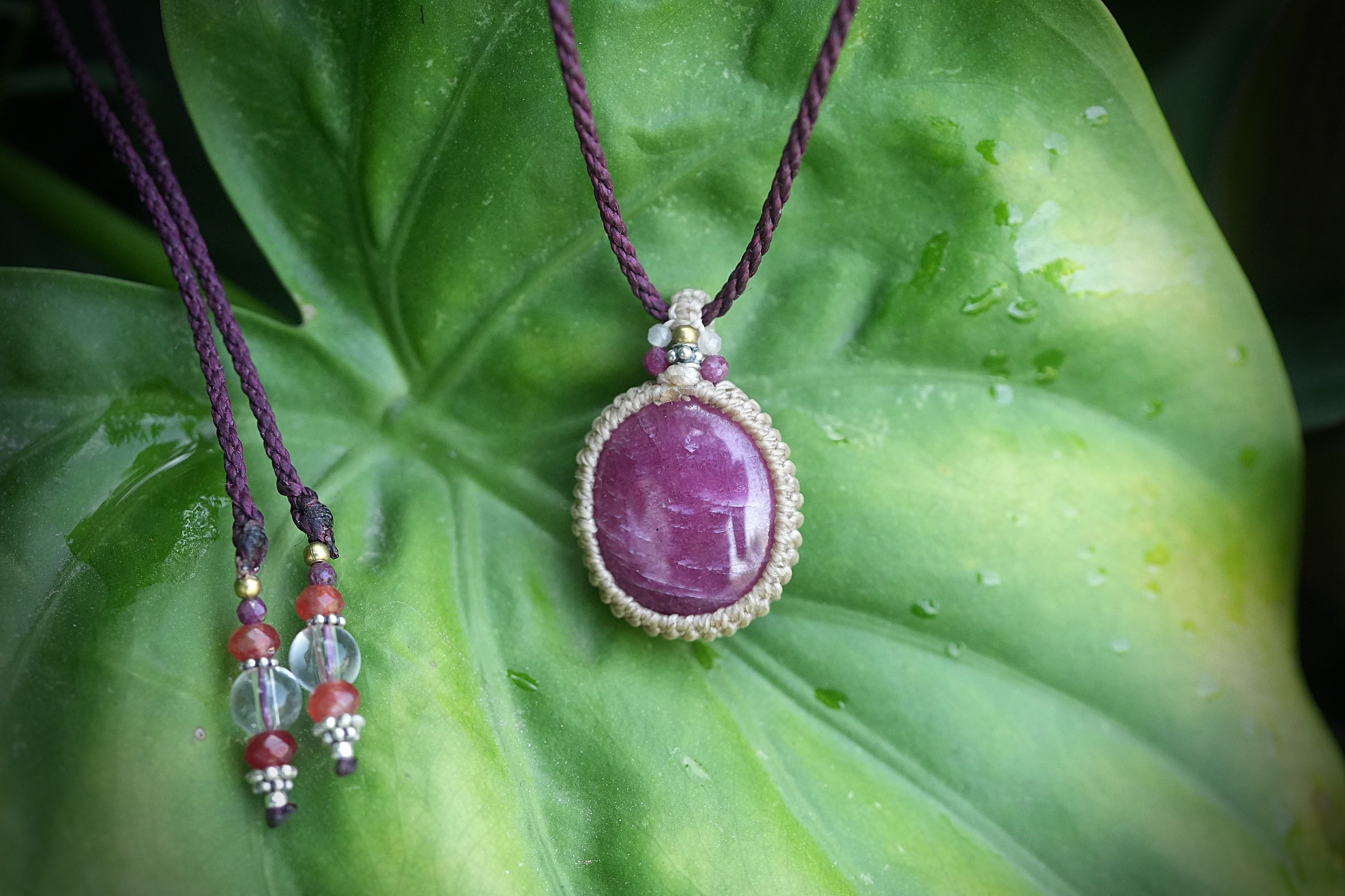 ◆このたびはキナリ、ダブグレイ色の蝋引き糸を使用しマクラメ編み装飾を施しました。