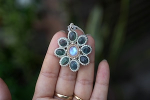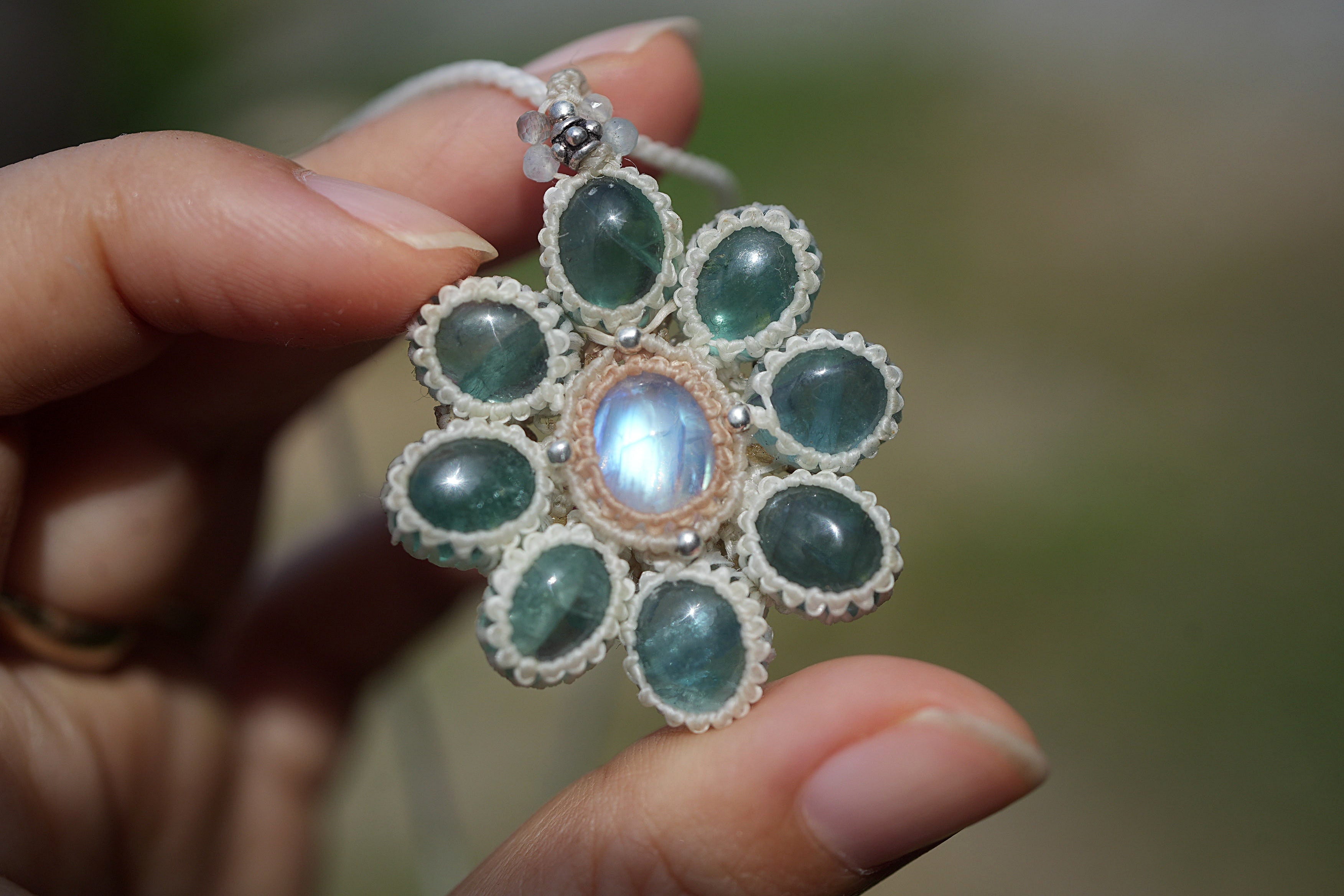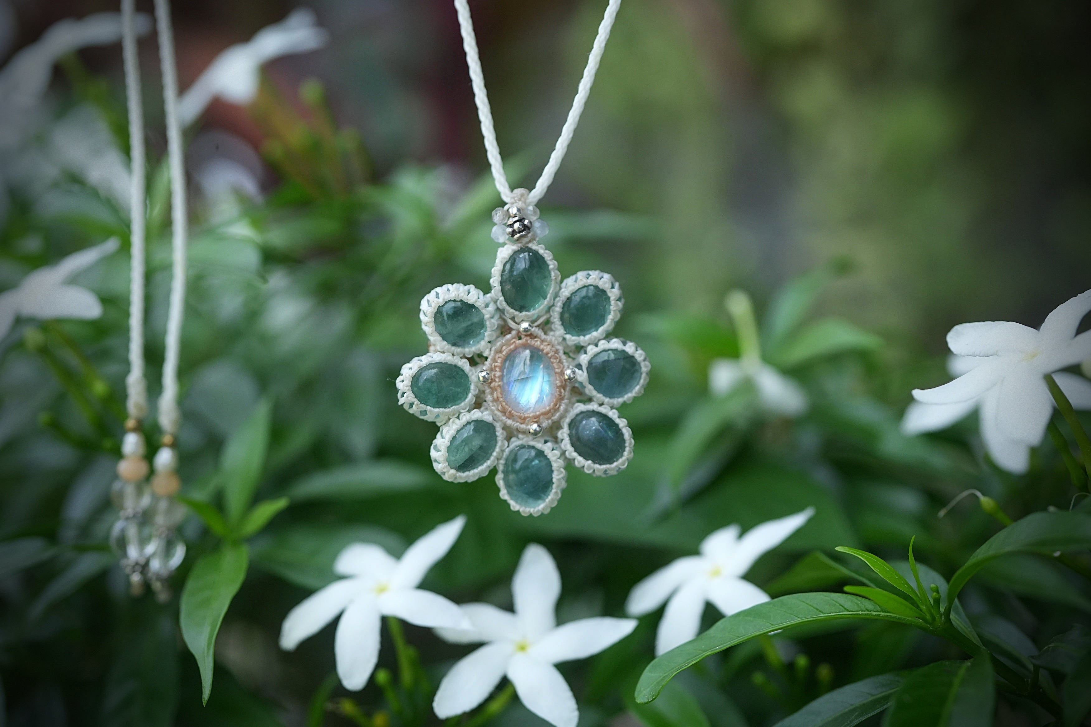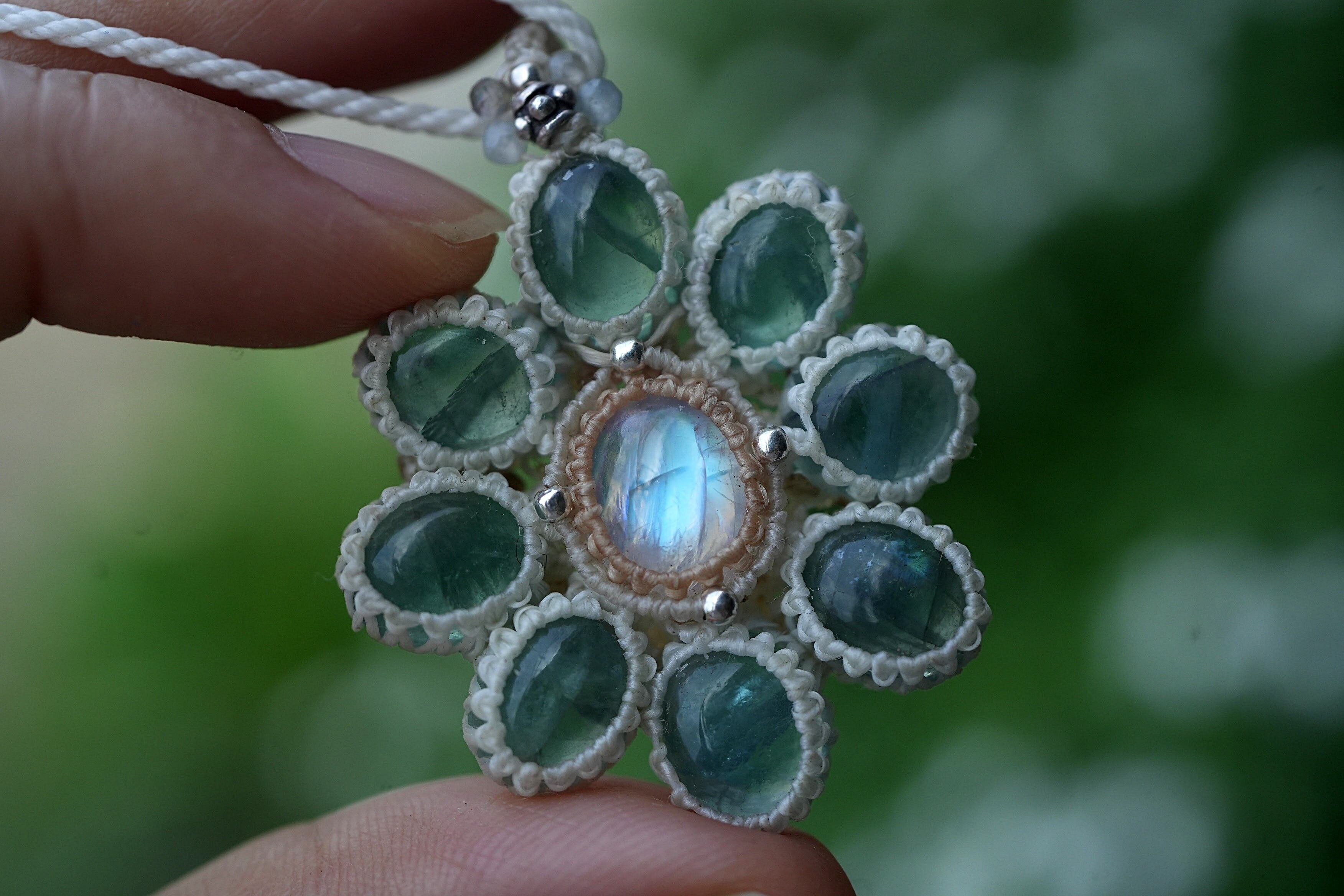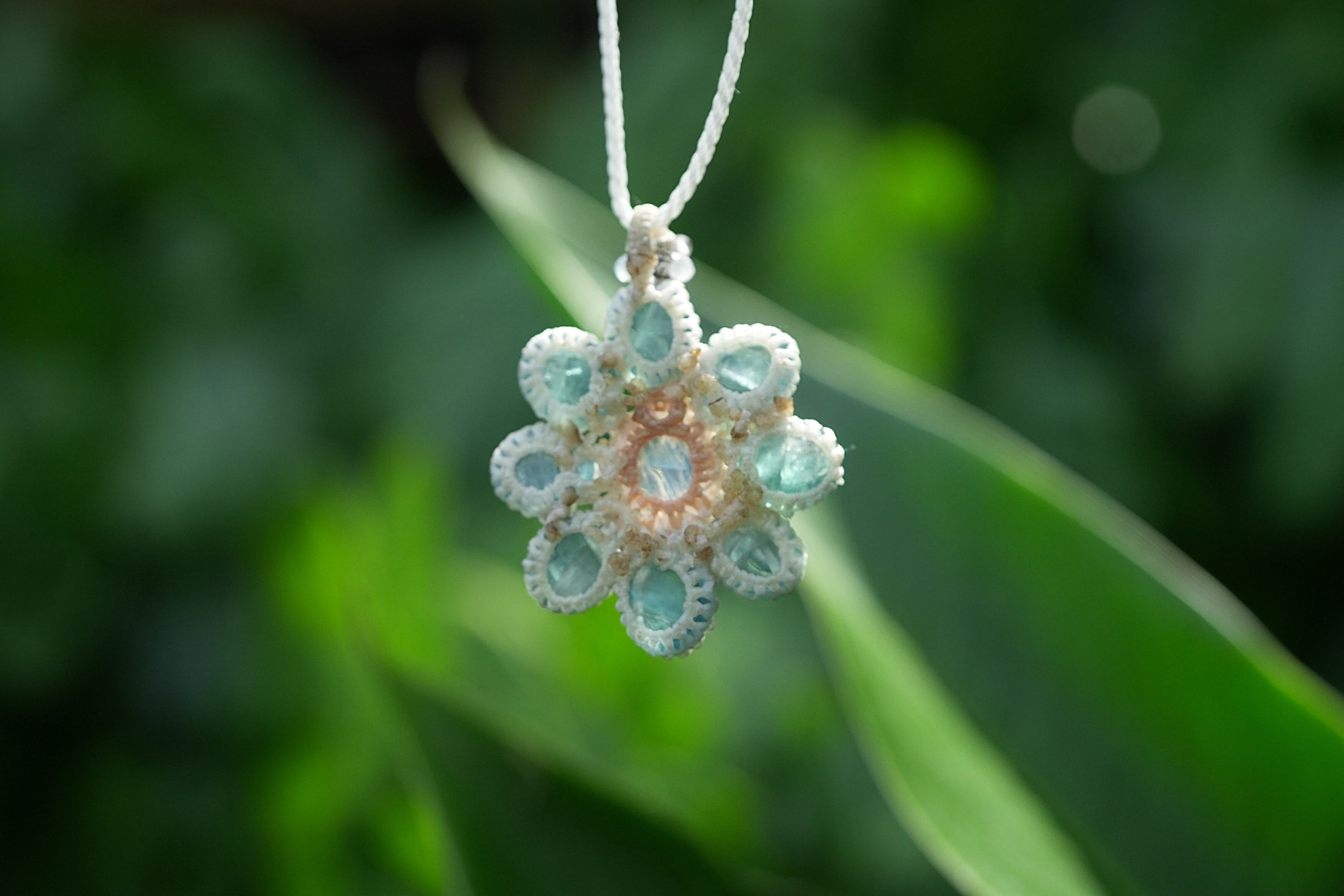 ブルー花★moonstone フローライトお花 マクラメネックレス1816
