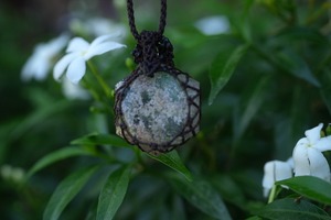 ◆このたびはダークブラウン色の蝋引き糸を使用しマクラメ編み装飾を施しました。