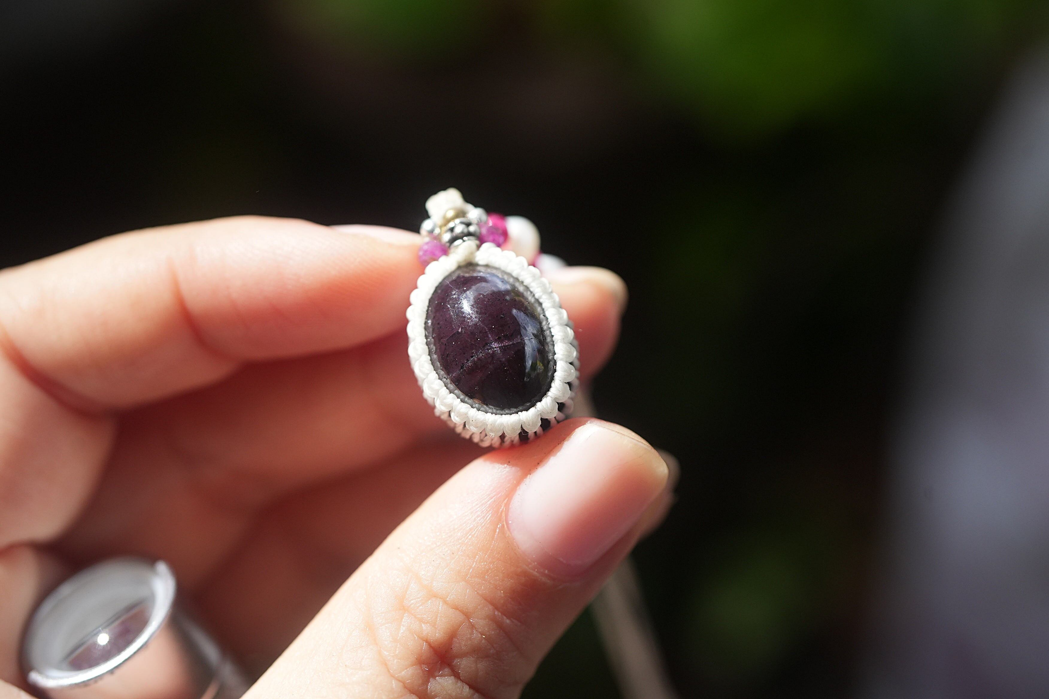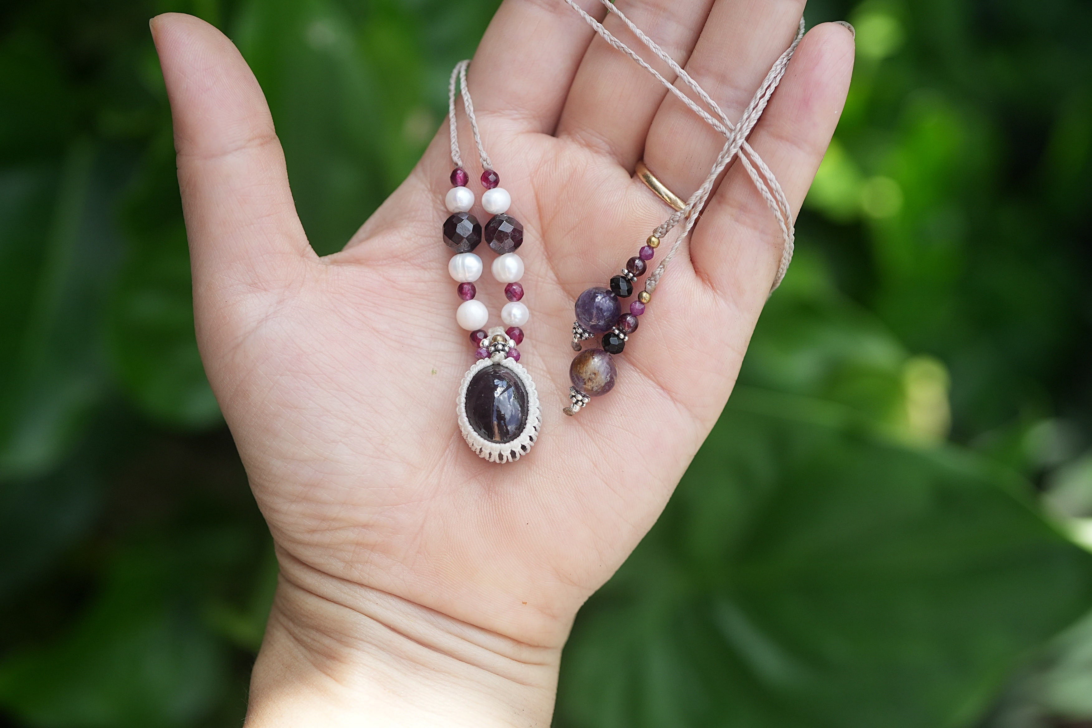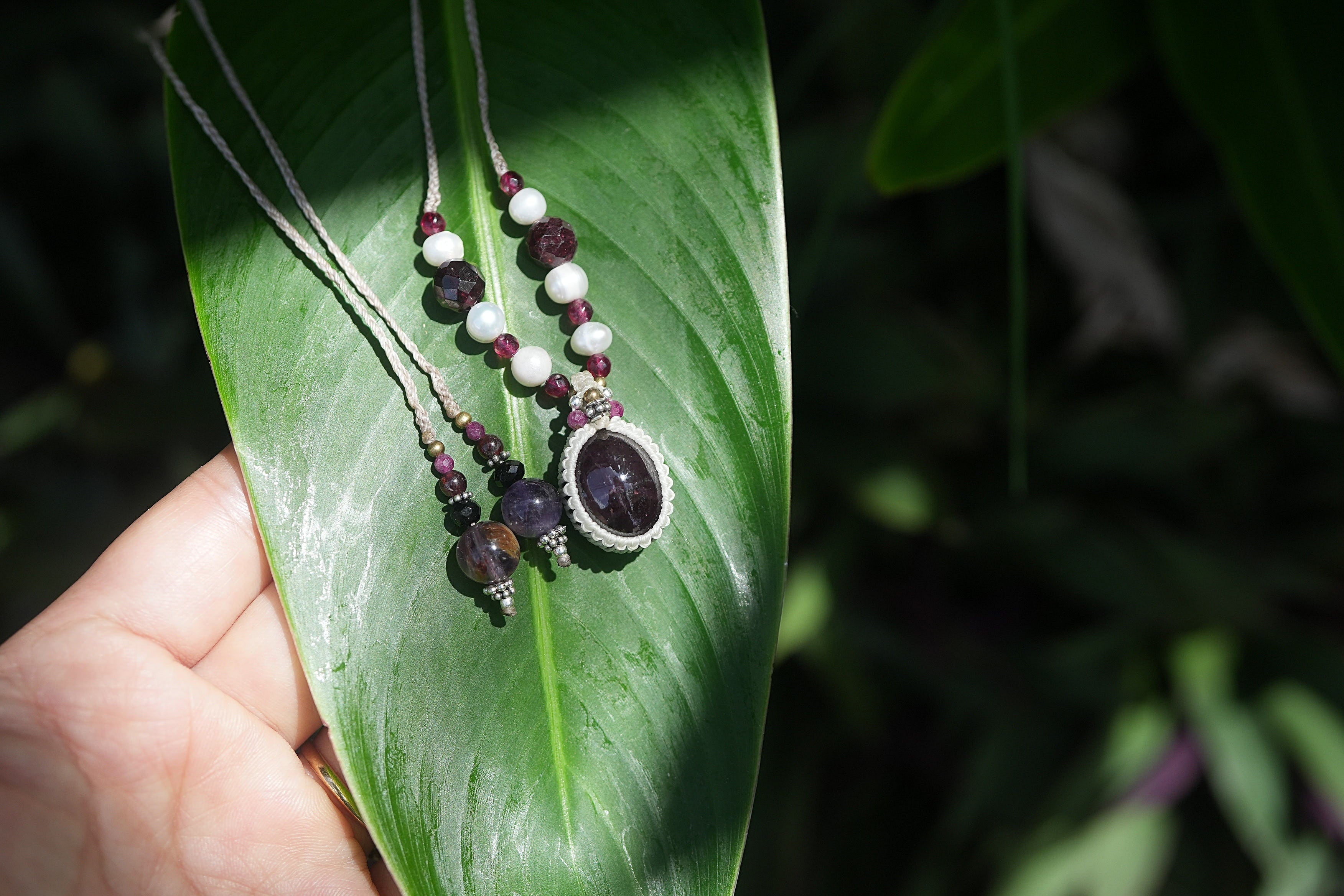 マクラメ編み装飾と天然ビーズを掛け合わせた