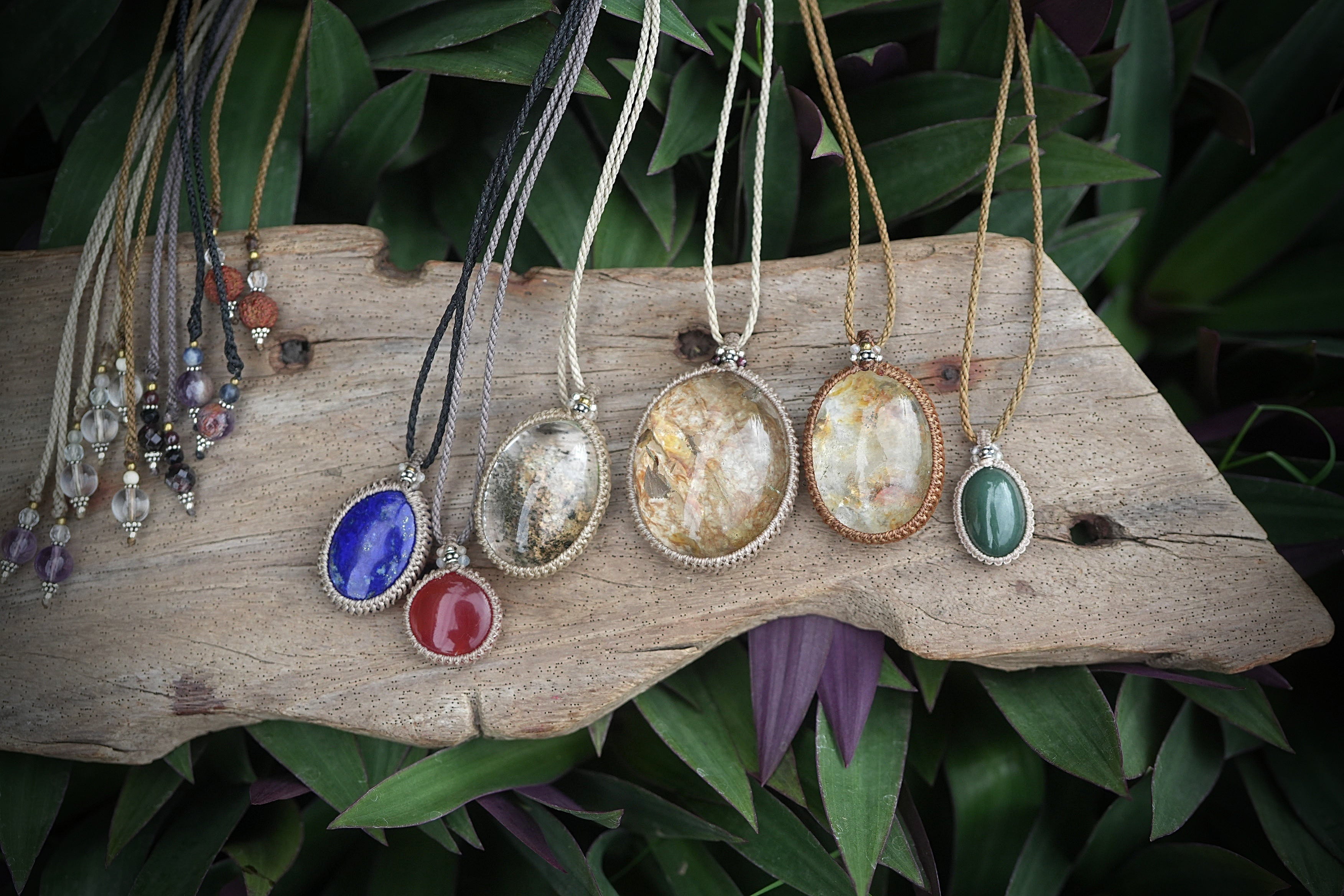 ◆このたびはゴールドブラウン色の蝋引き糸を使用しマクラメ編み装飾を施しました。