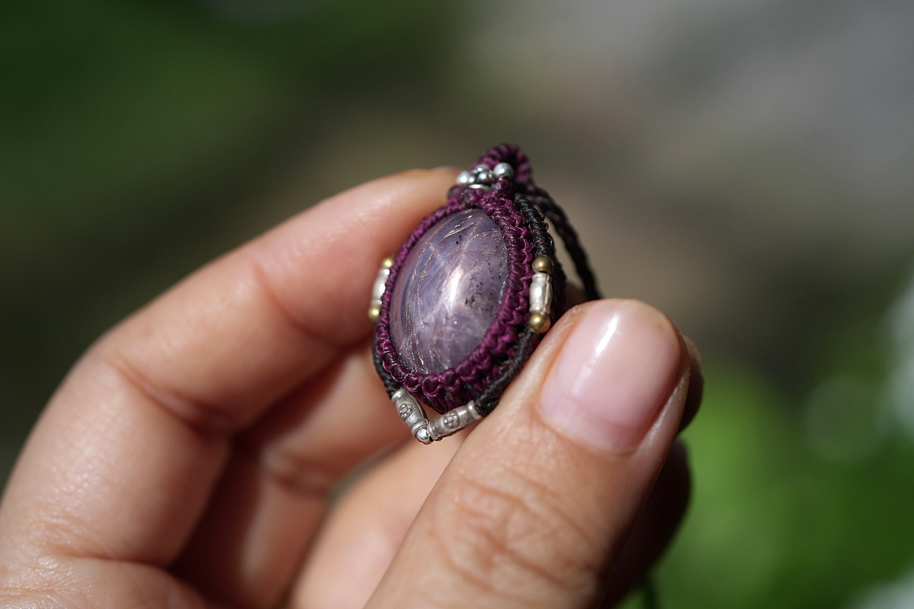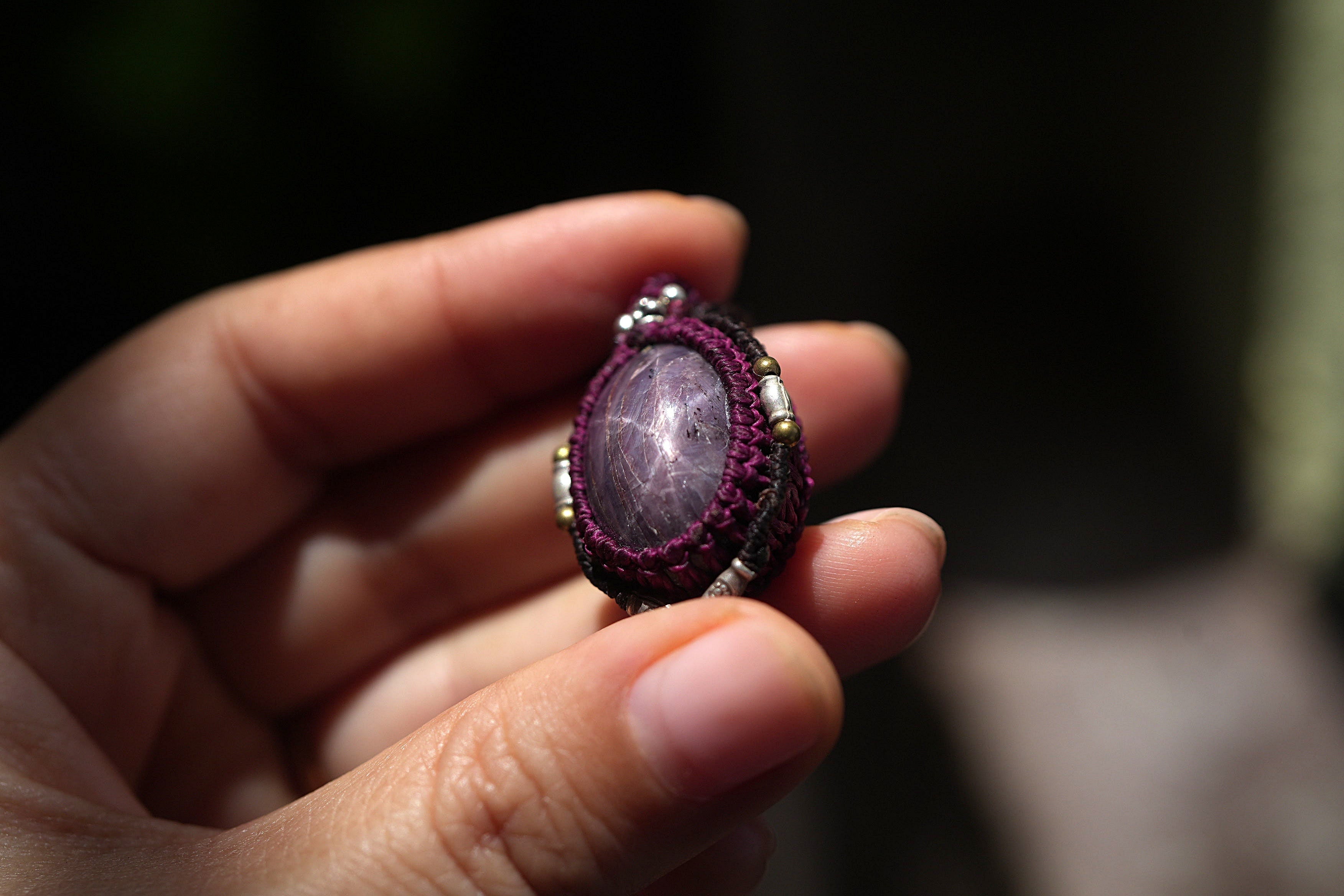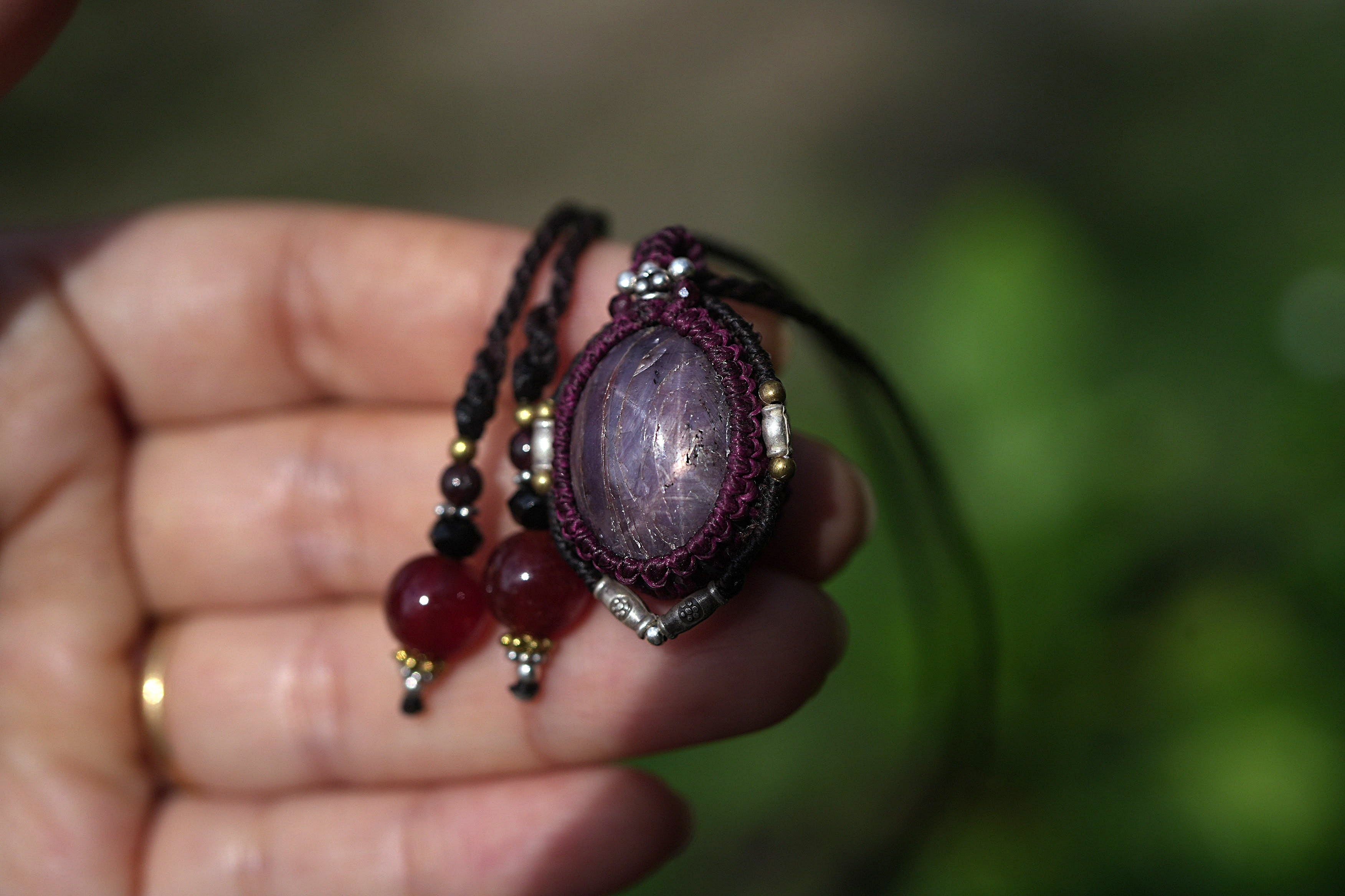 ◆このたびはボルドー、ダークブラウン色の蝋引き糸を使用しマクラメ編み装飾を施しました。