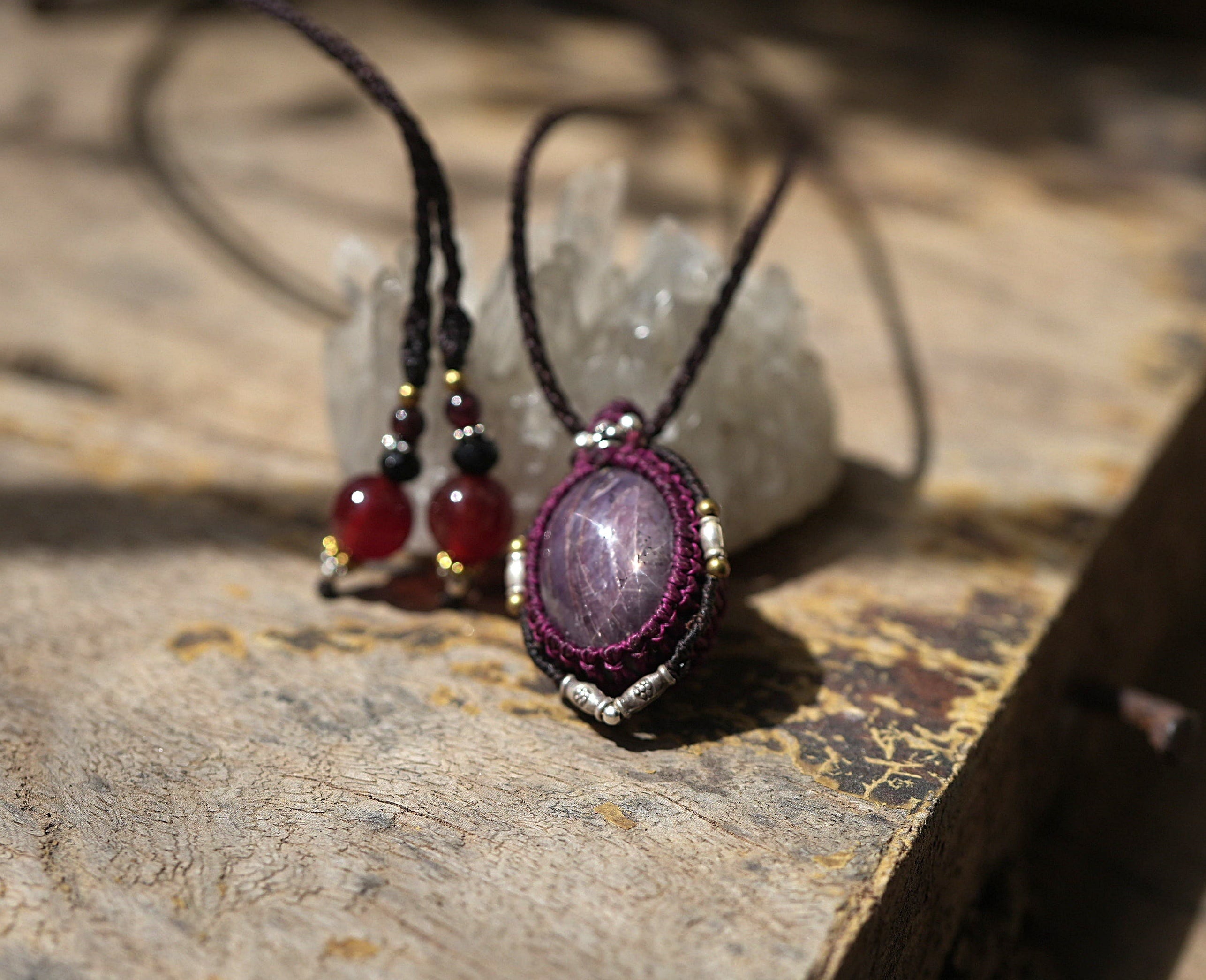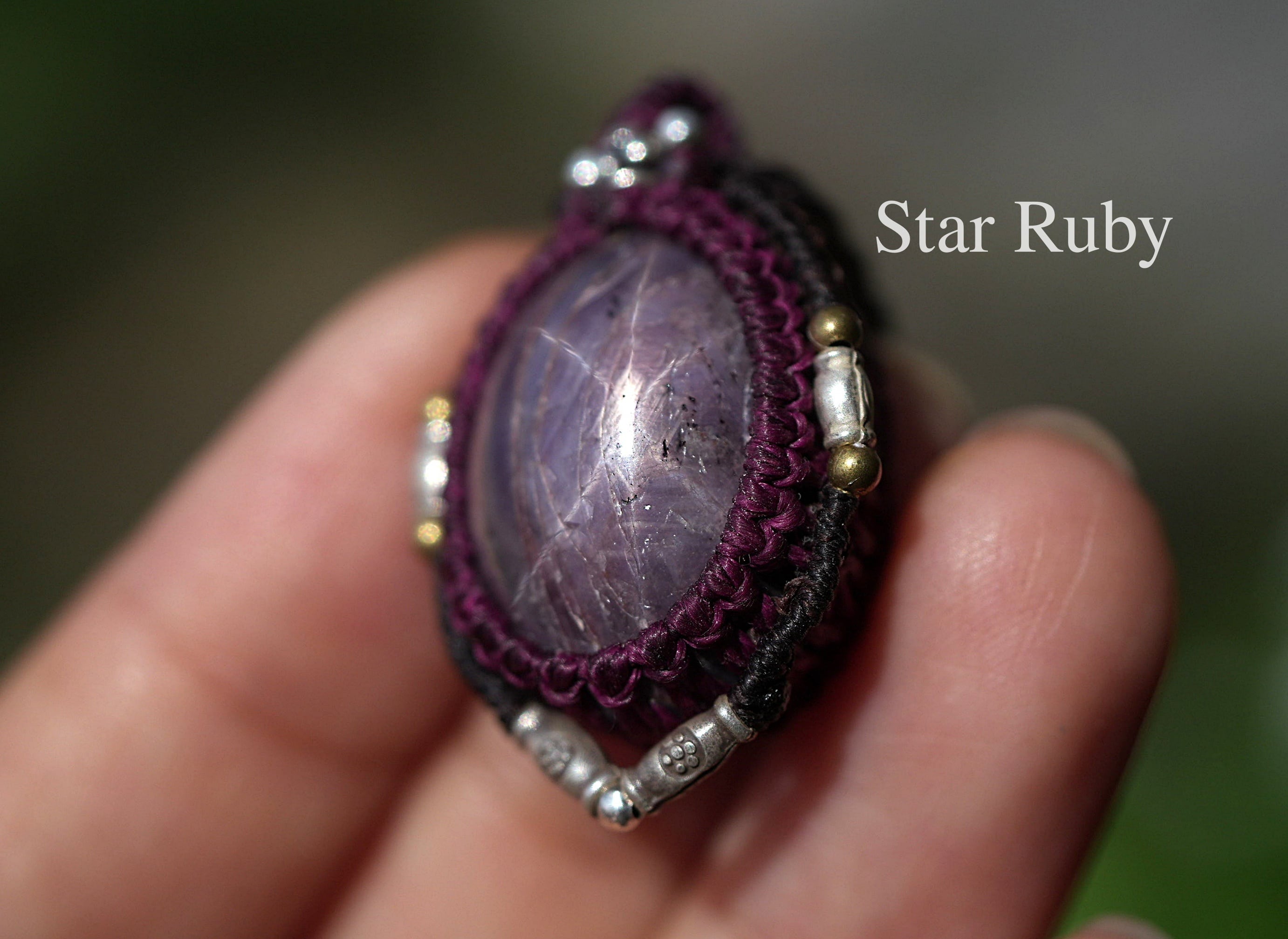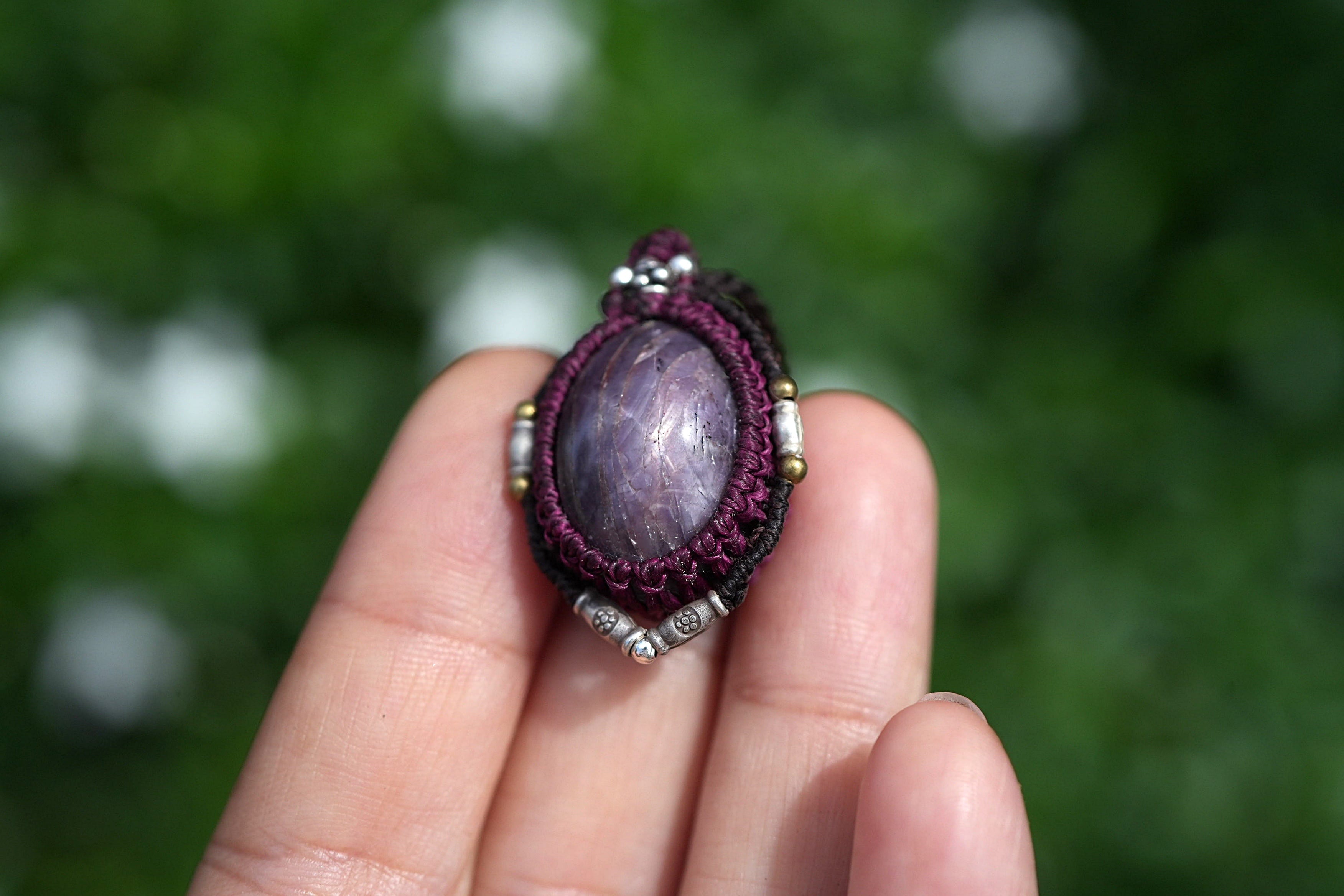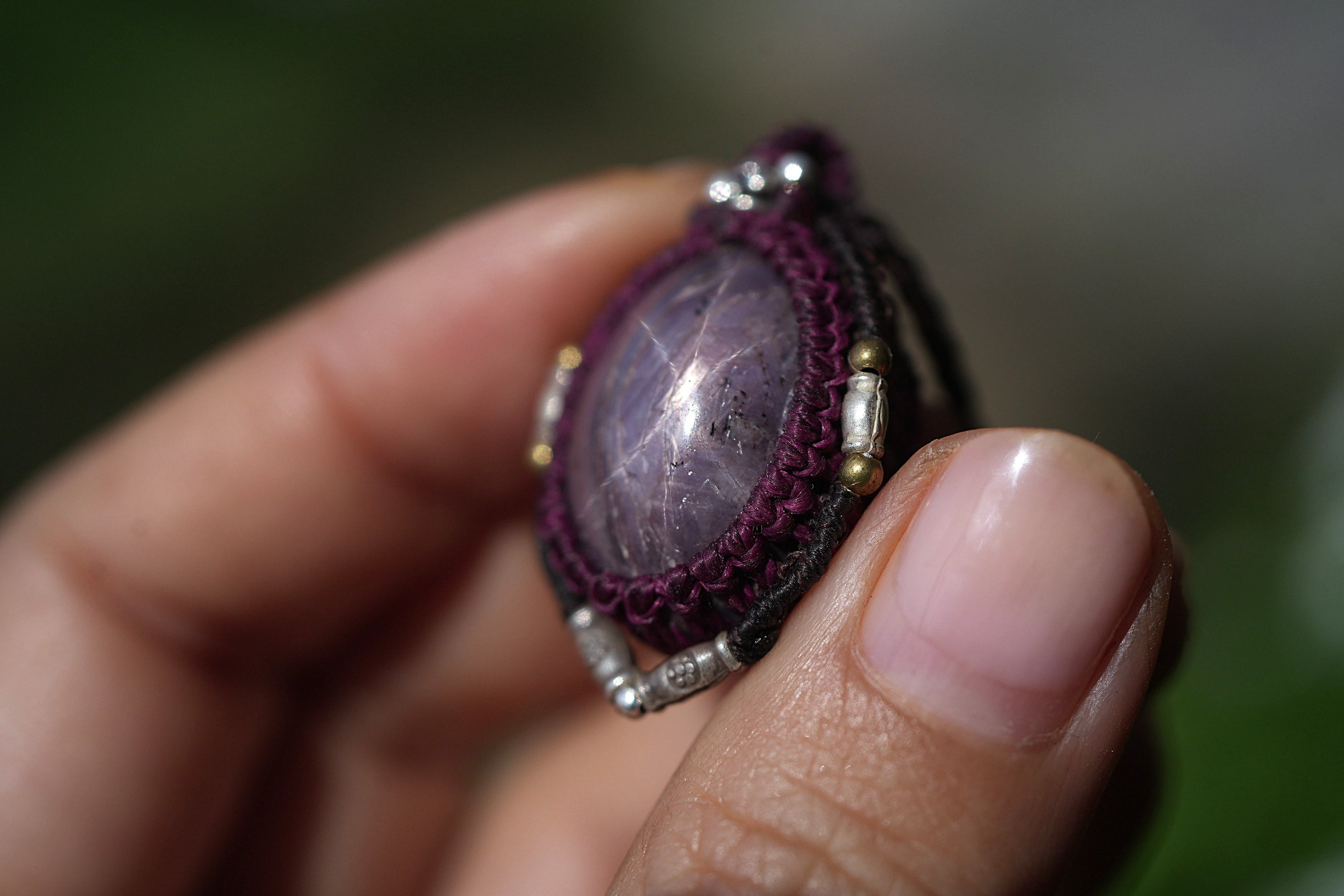◆このたびはボルドー、ダークブラウン色の蝋引き糸を使用しマクラメ編み装飾を施しました。