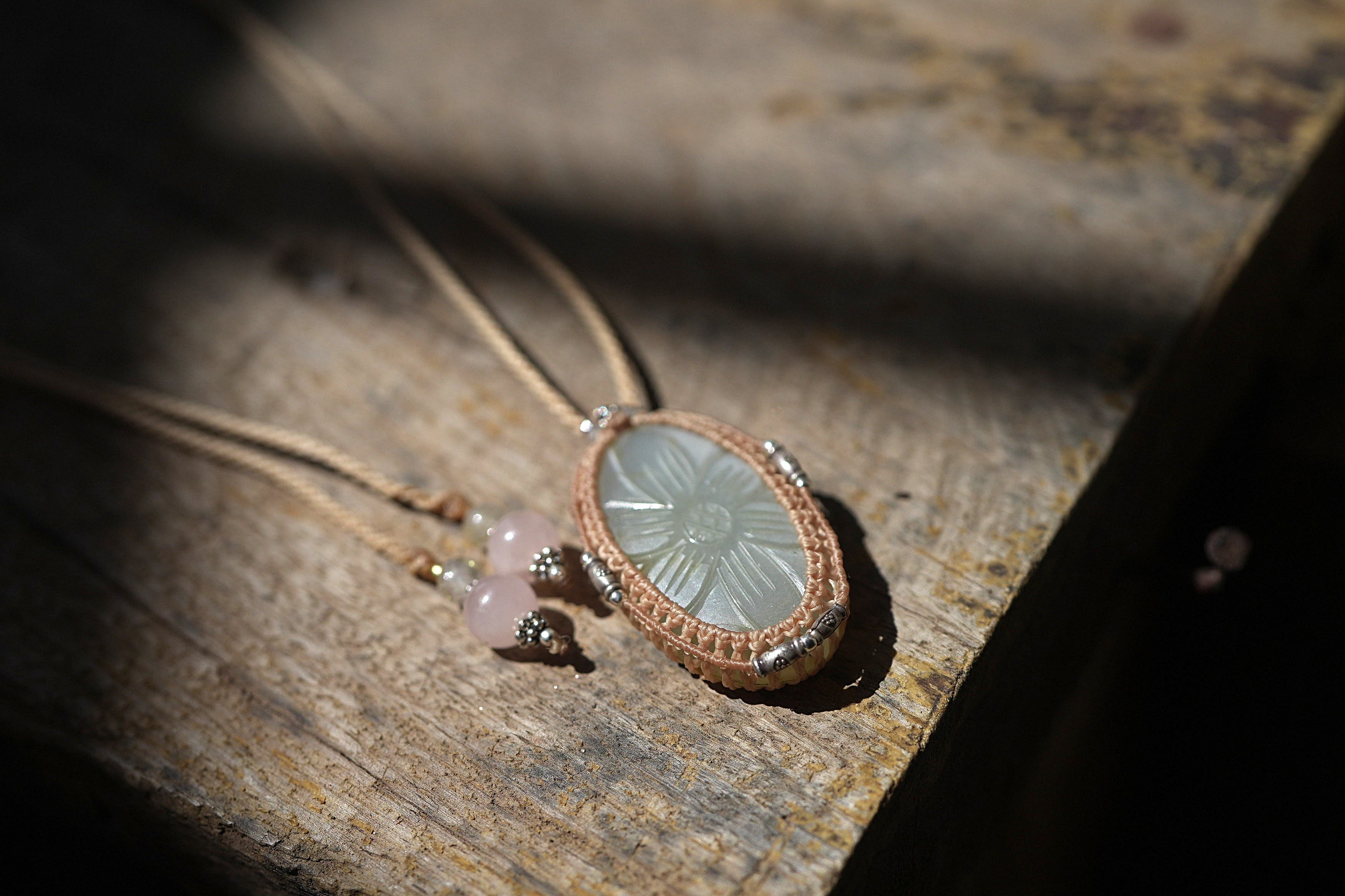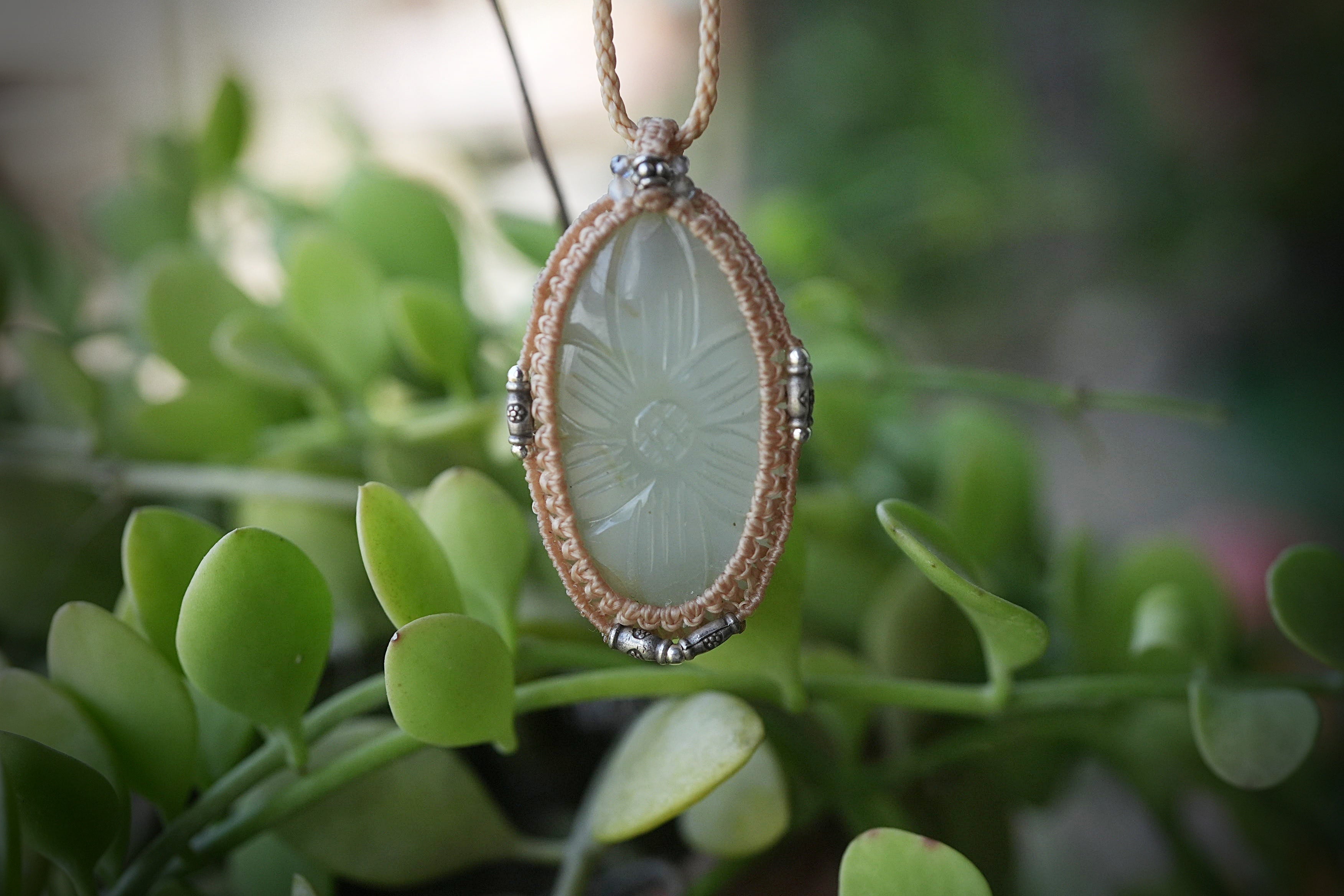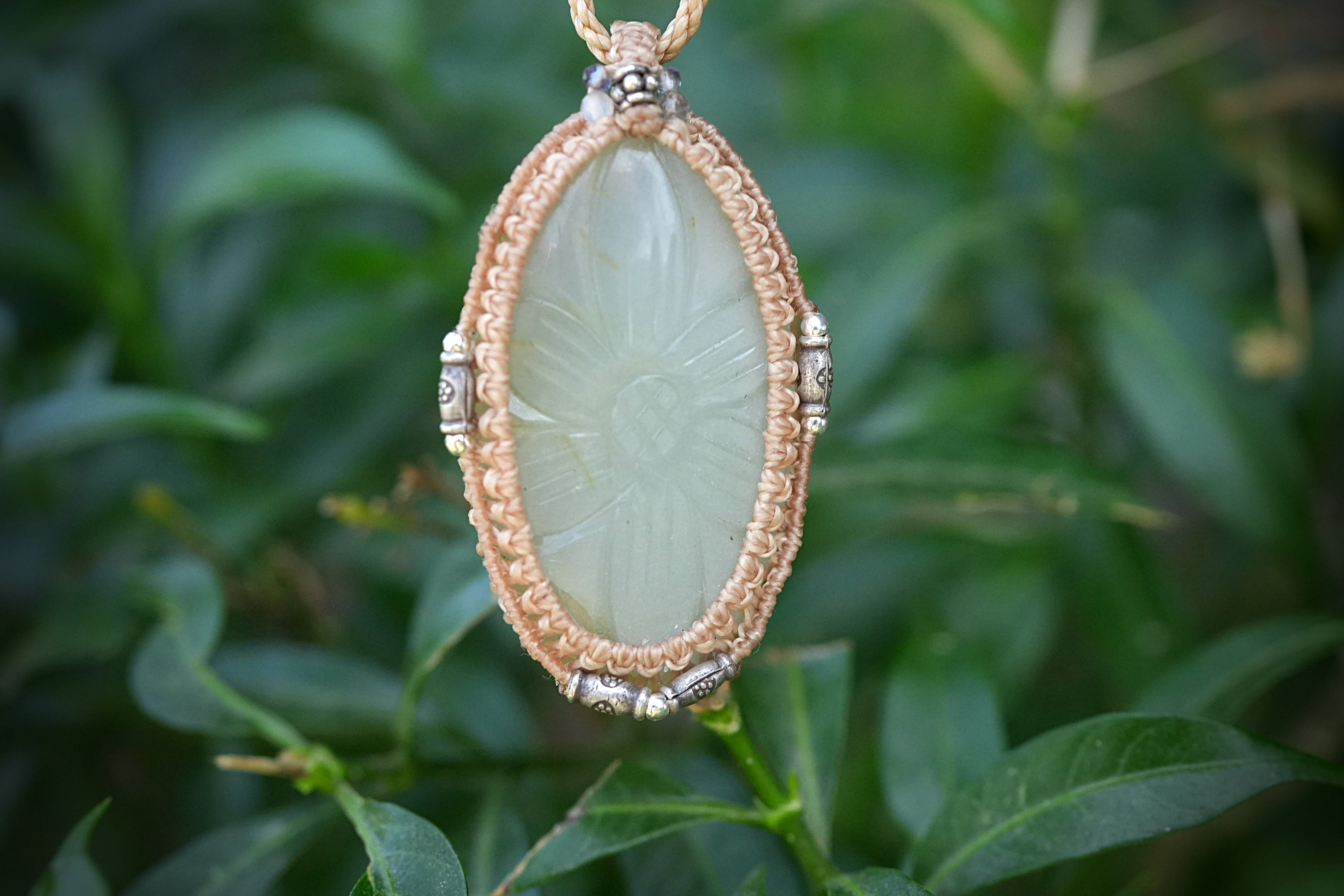 ◆このたびはキャラメル色の蝋引き糸を使用しマクラメ編み装飾を施しました