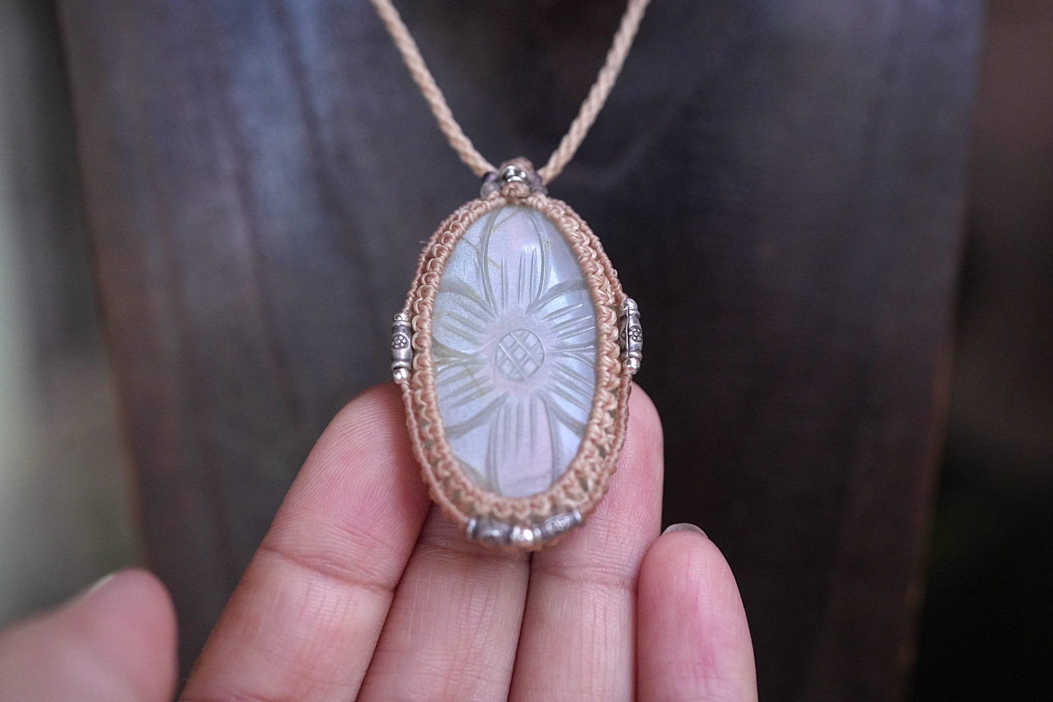 お花彫刻★ホワイトムーンストーン マクラメネックレス1879