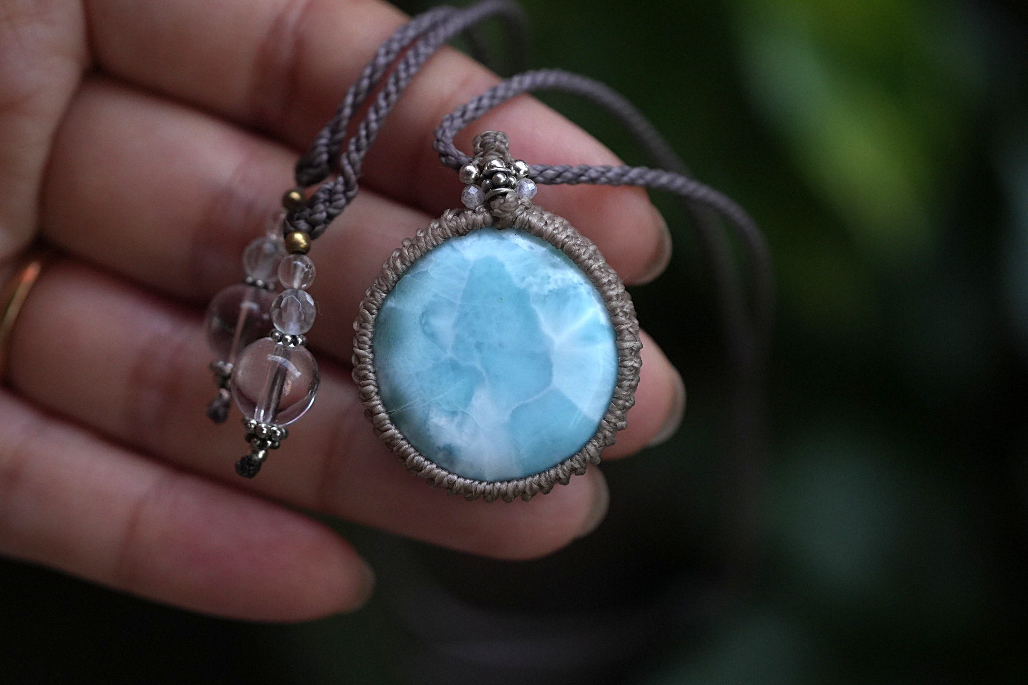 ◆このたびはキナリ、ダブグレイ色の蝋引き糸を使用しマクラメ編み装飾を施しました。