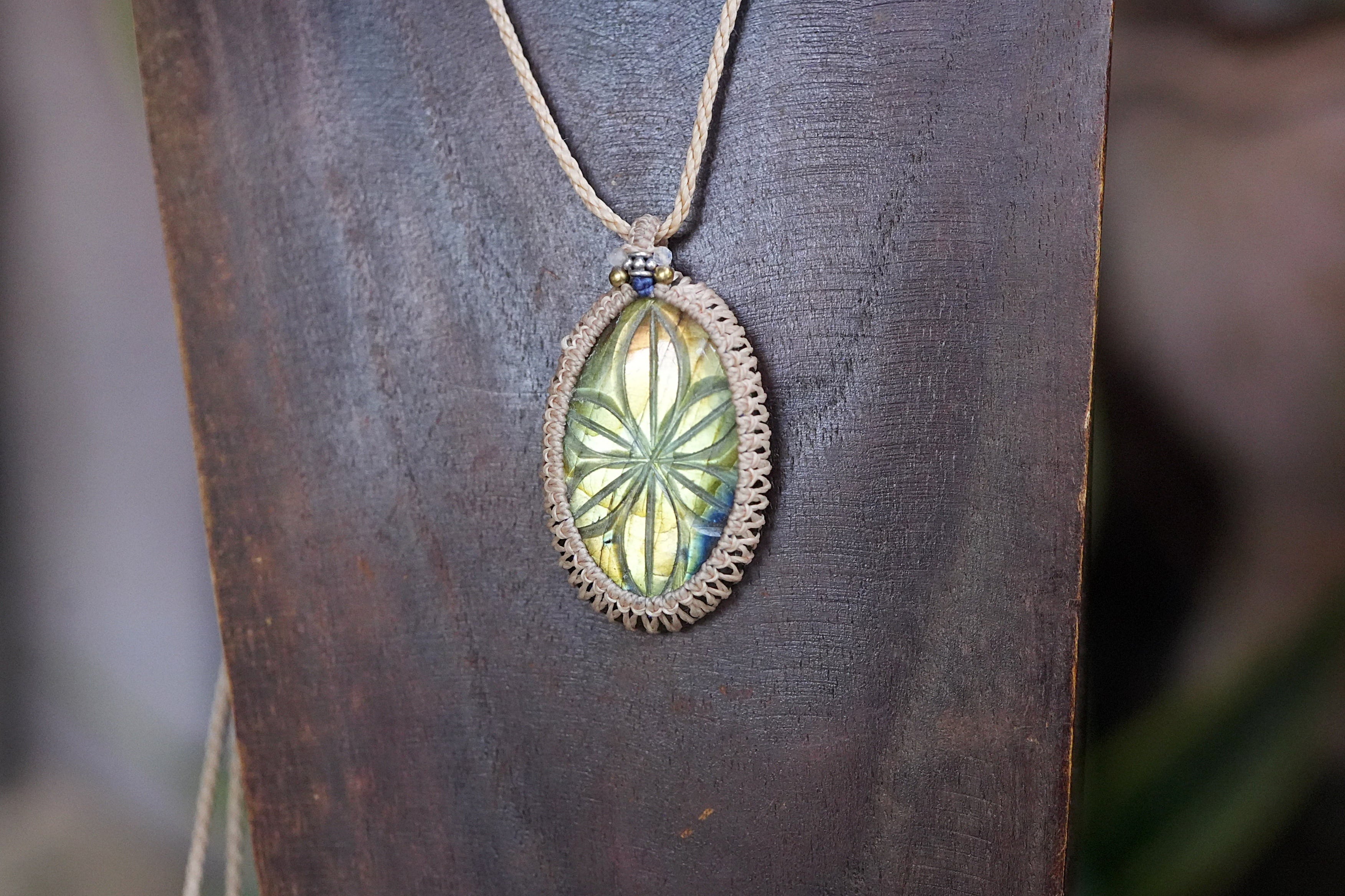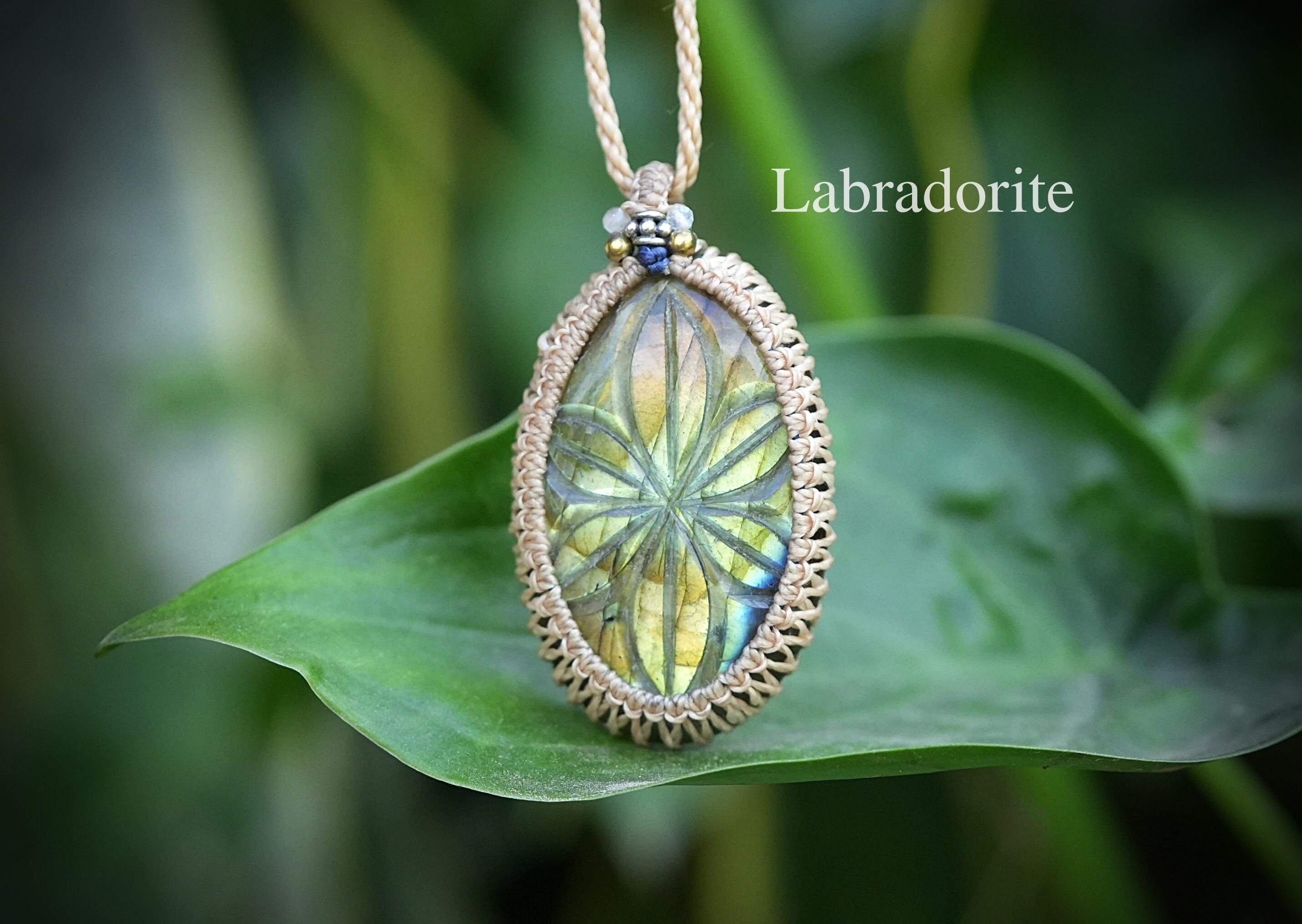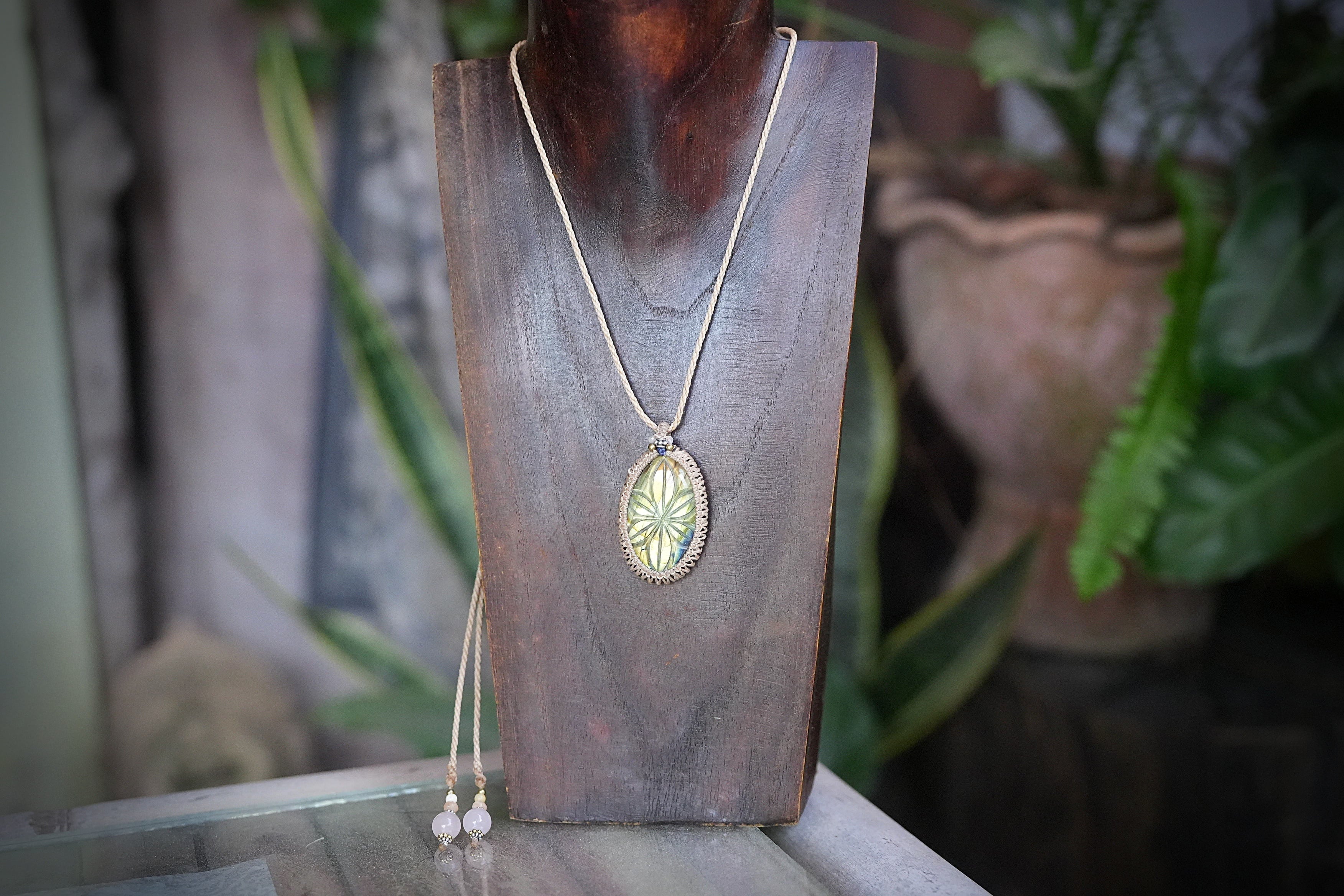 花彫刻★イエローマルチラブラドライト マクラメネックレス 1888