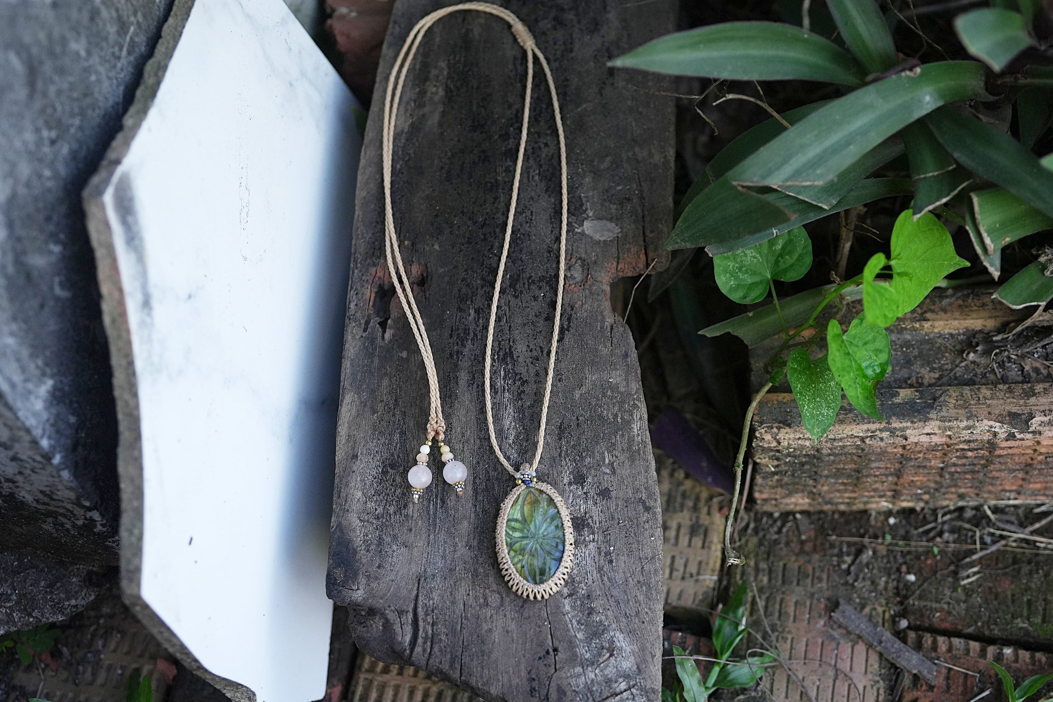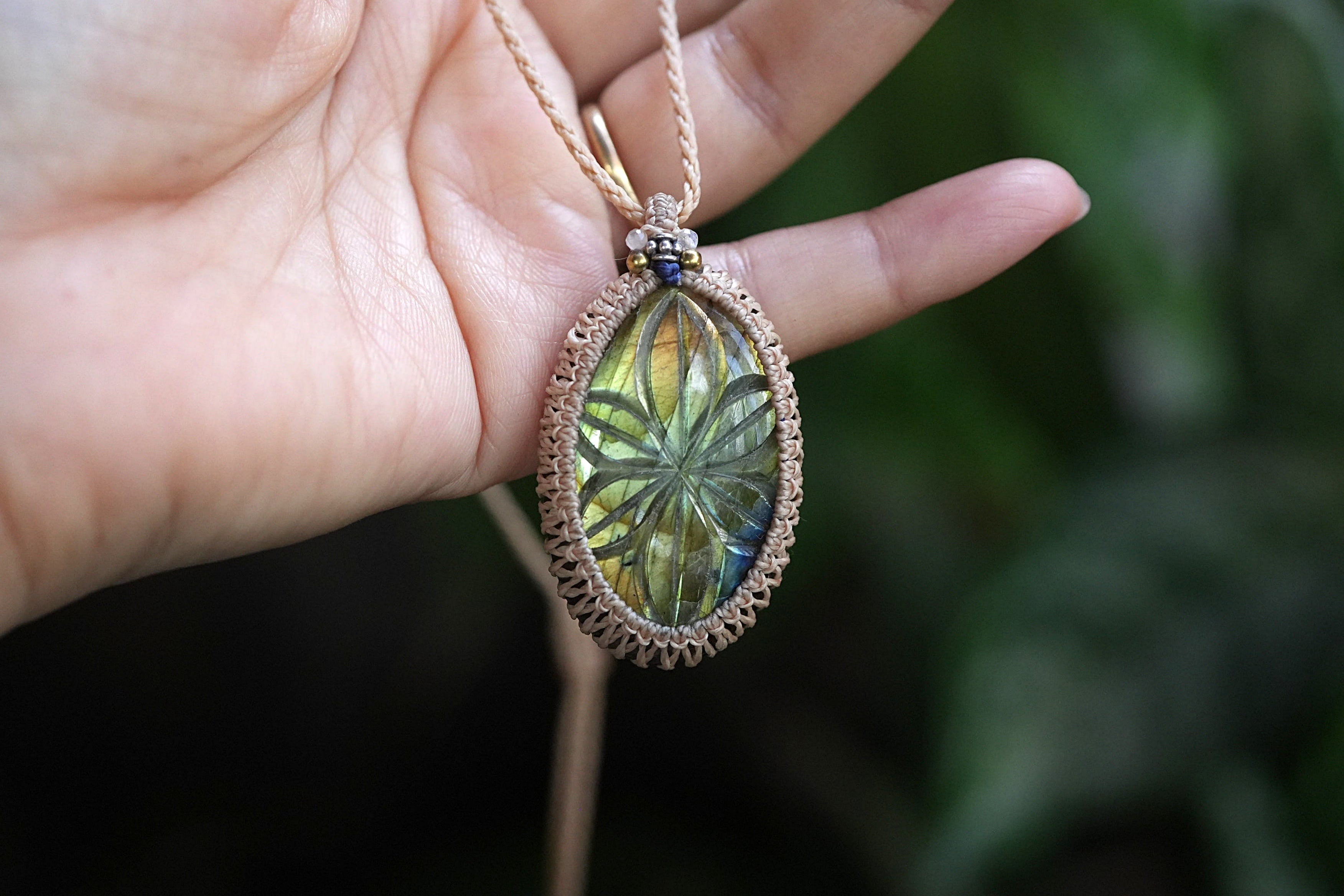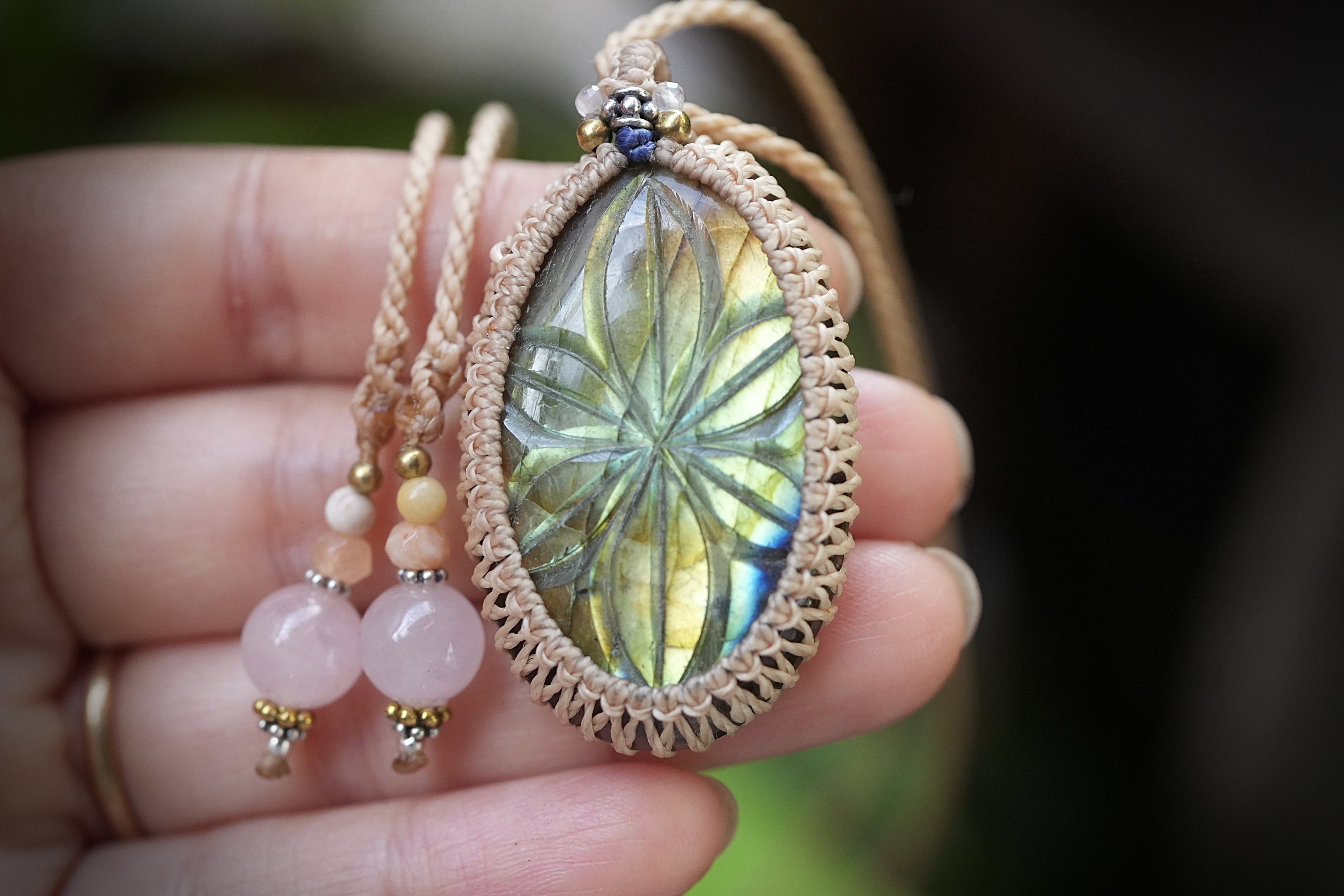 花彫刻★イエローマルチラブラドライト マクラメネックレス 1888
