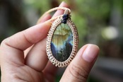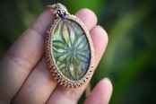 ラブラドライトの輝きにハンドメイドな彫刻の花が調和したもの