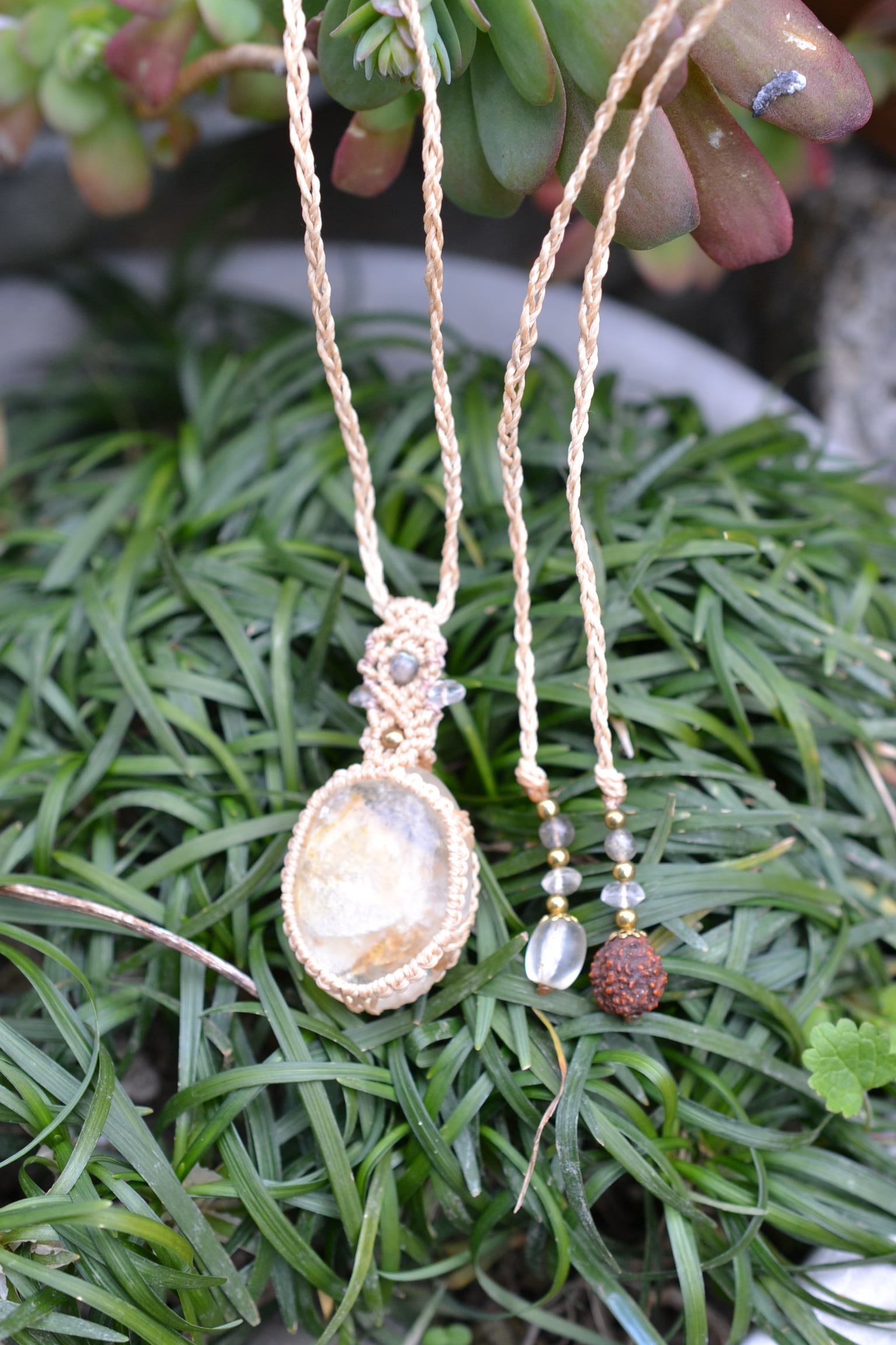 石の厚みと世界観を楽しめるようにマクラメ編み装飾を施しました。
