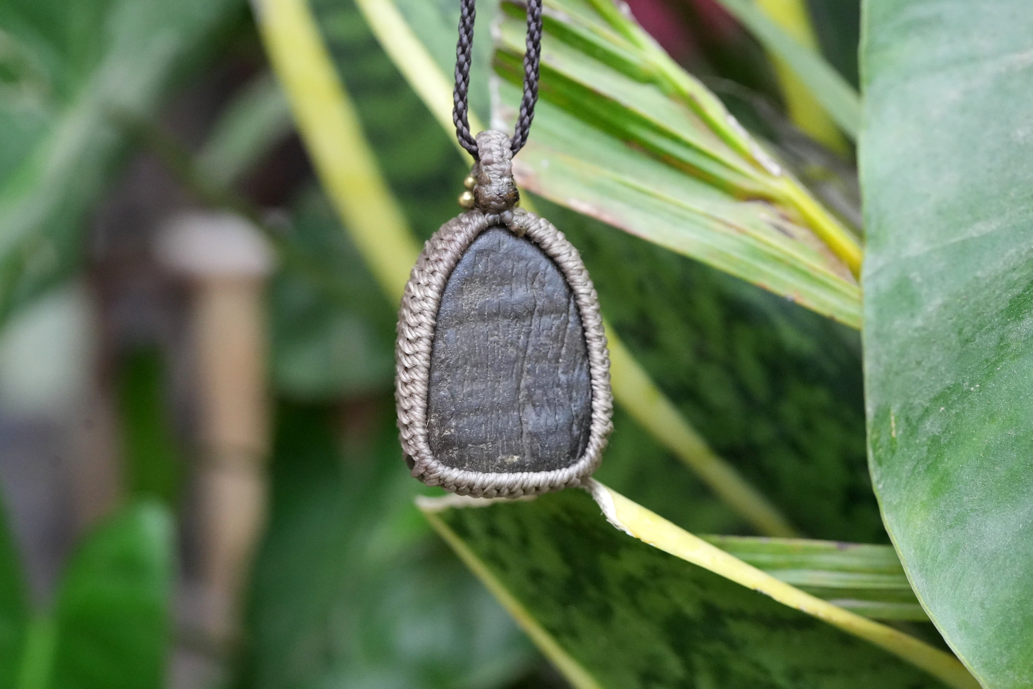 ◆このたびはヘンプ、ダークブラウン色の蝋引き糸を使用しマクラメ編み装飾を施しました。