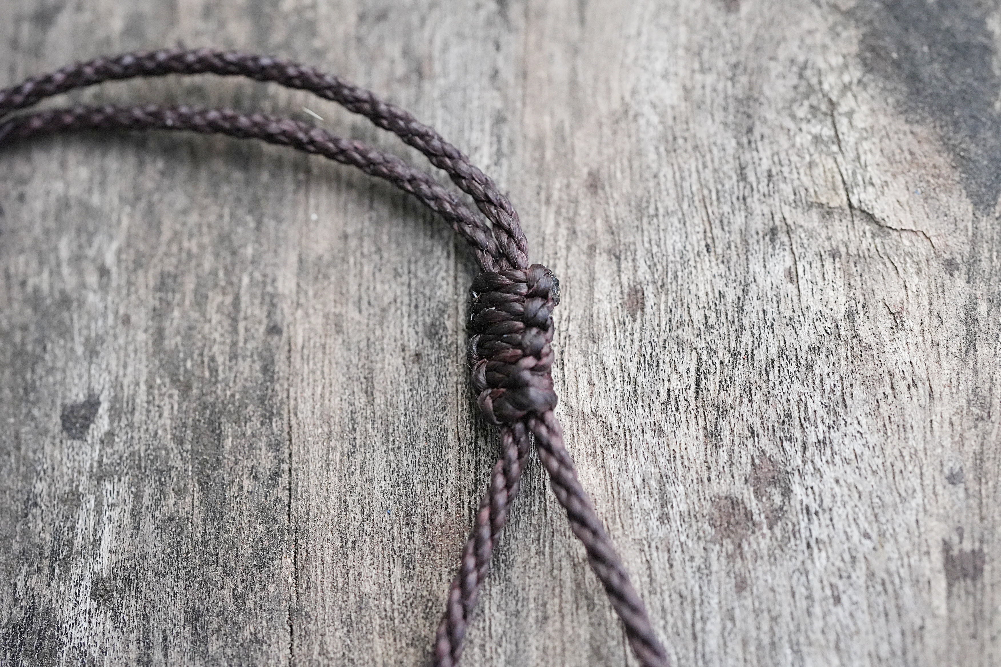 ◆このたびはカフェオレ、ダークブラウン色の蝋引き糸を使用しマクラメ編み装飾を施しました。