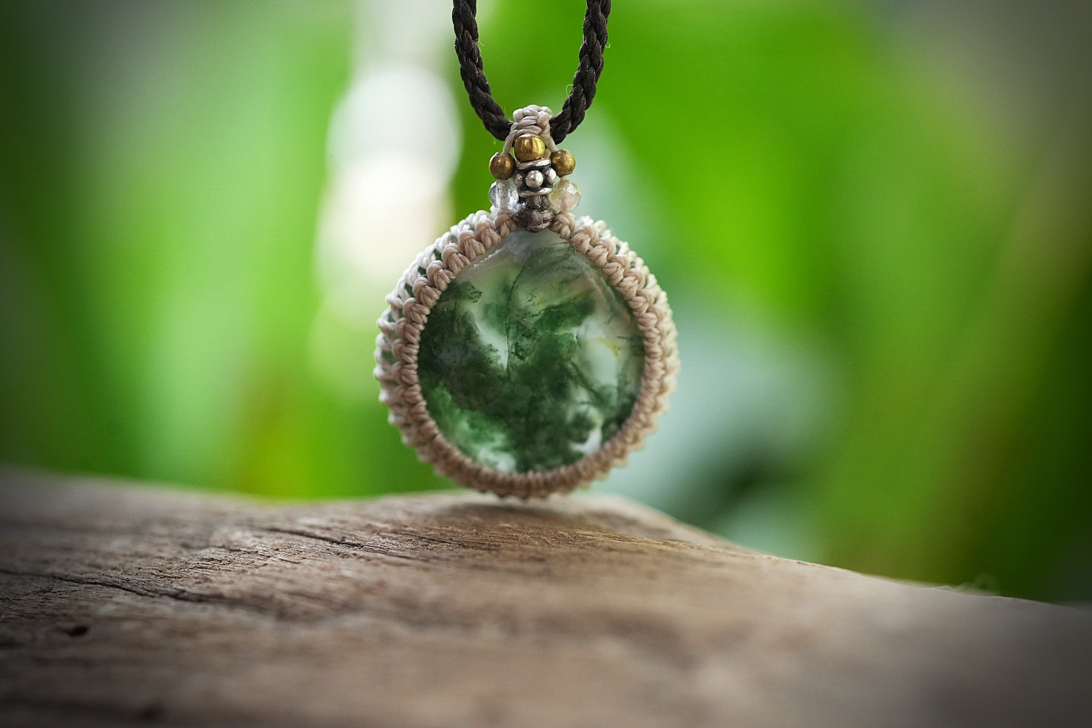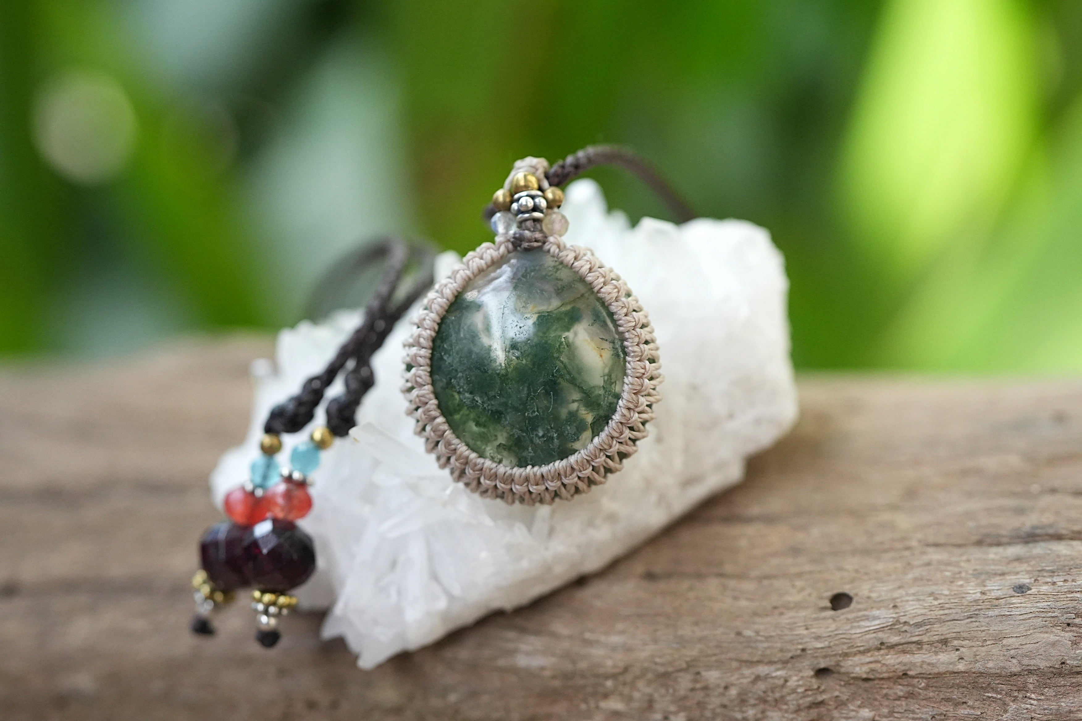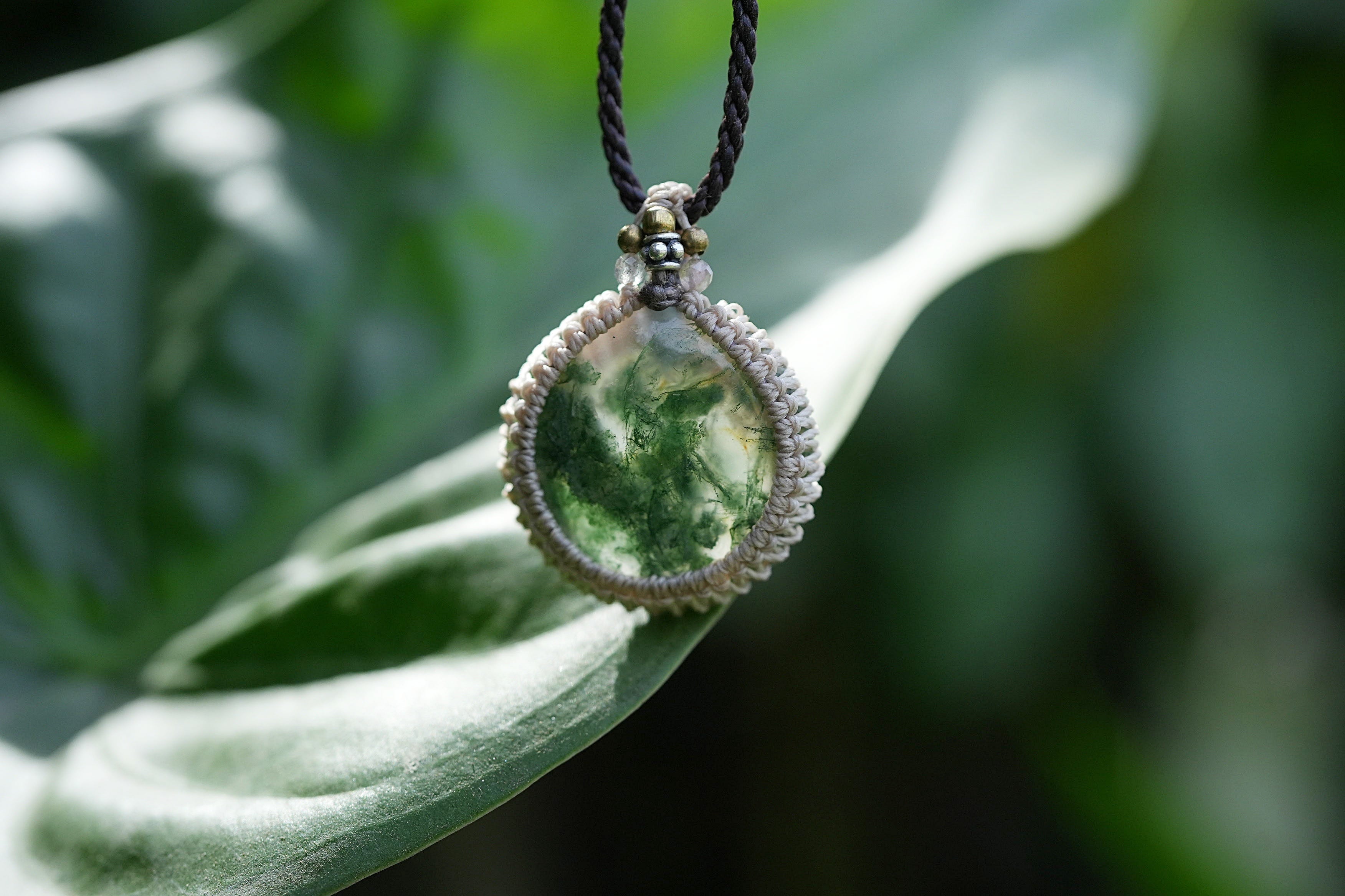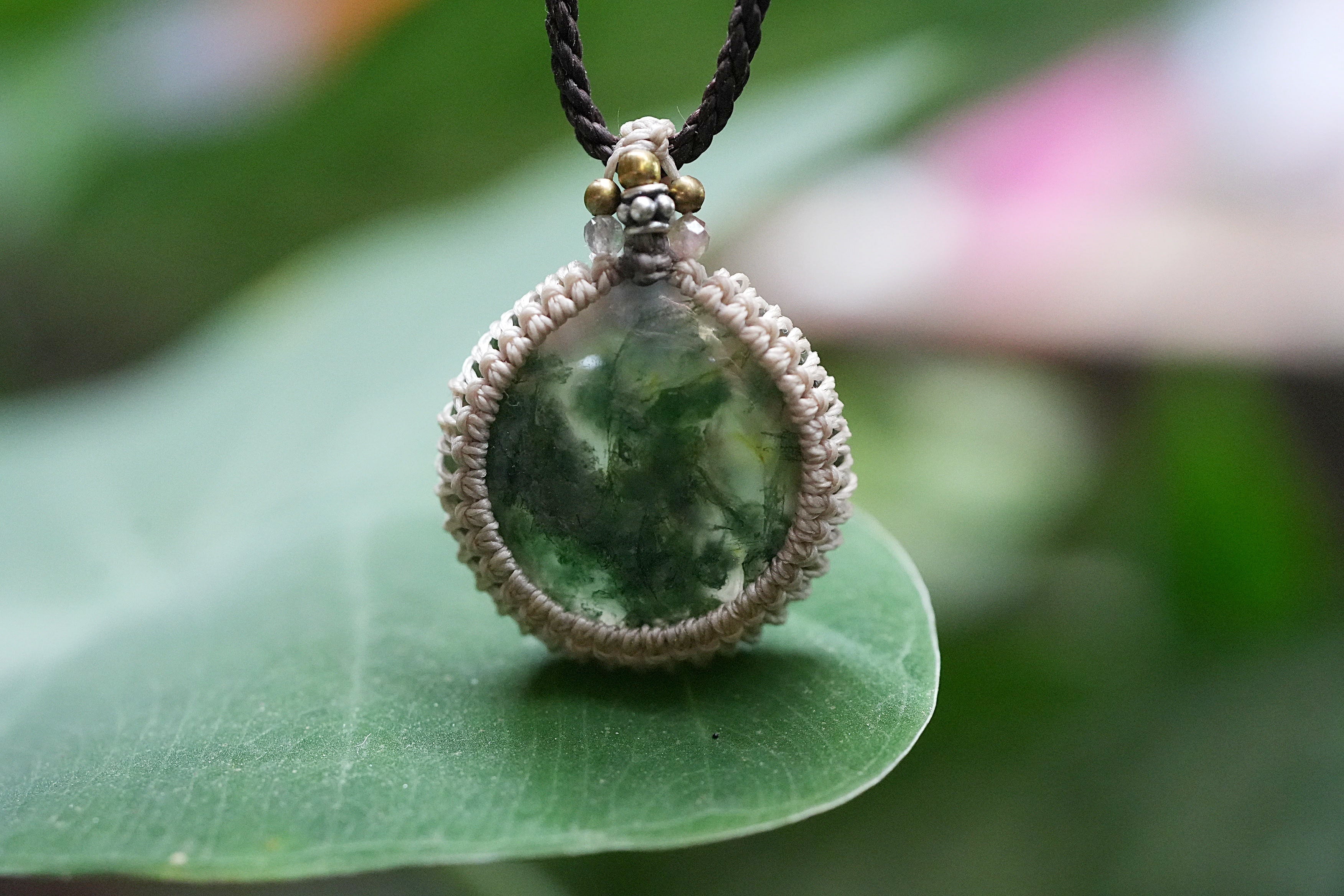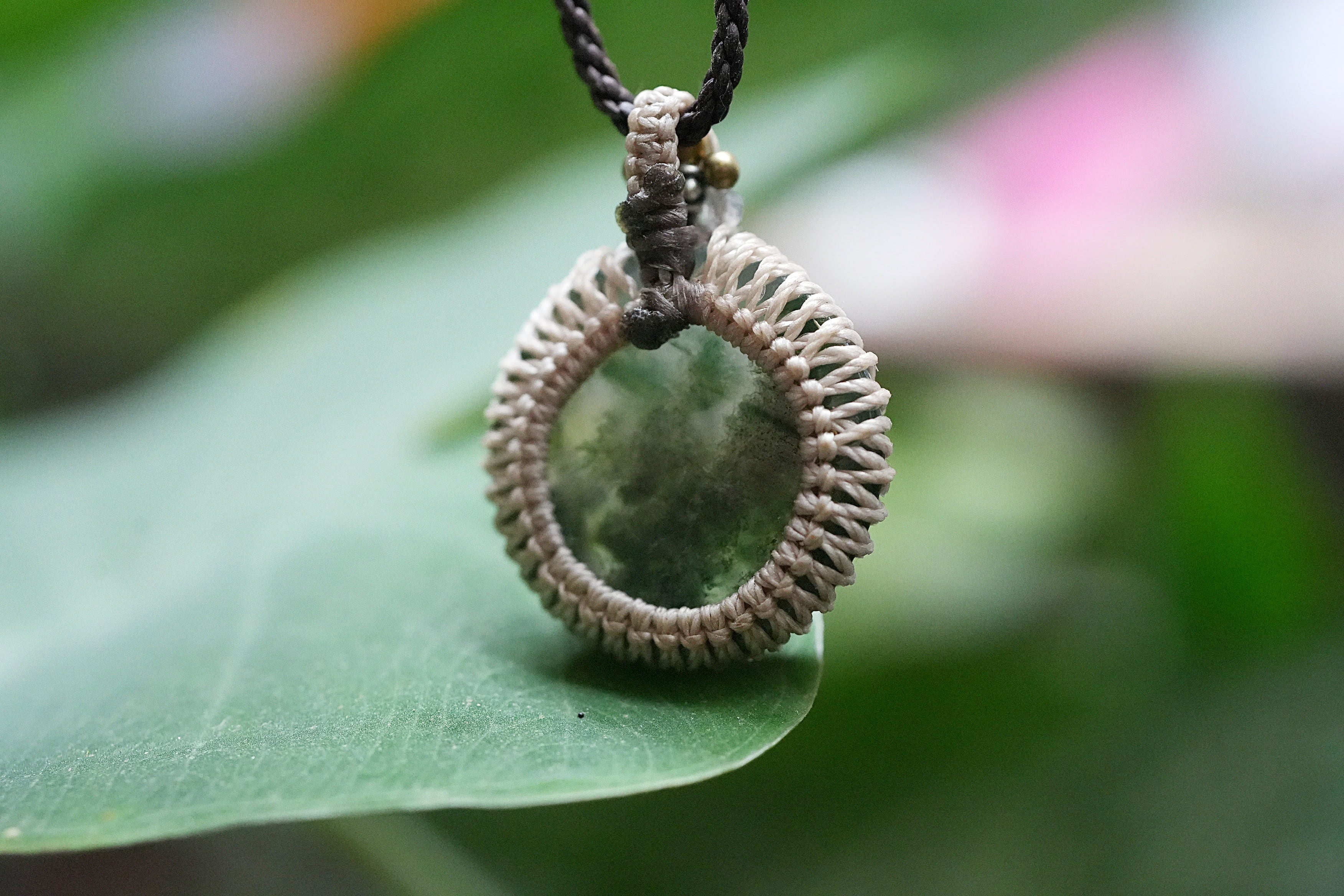シンプルなマクラメ編みが石の魅力を引き立てます。