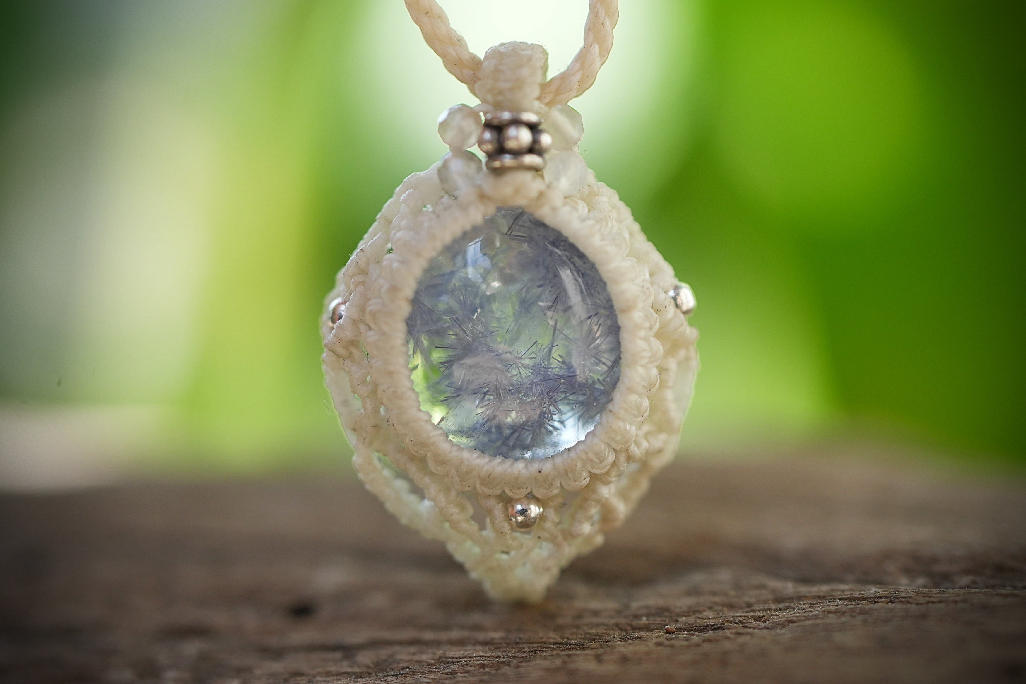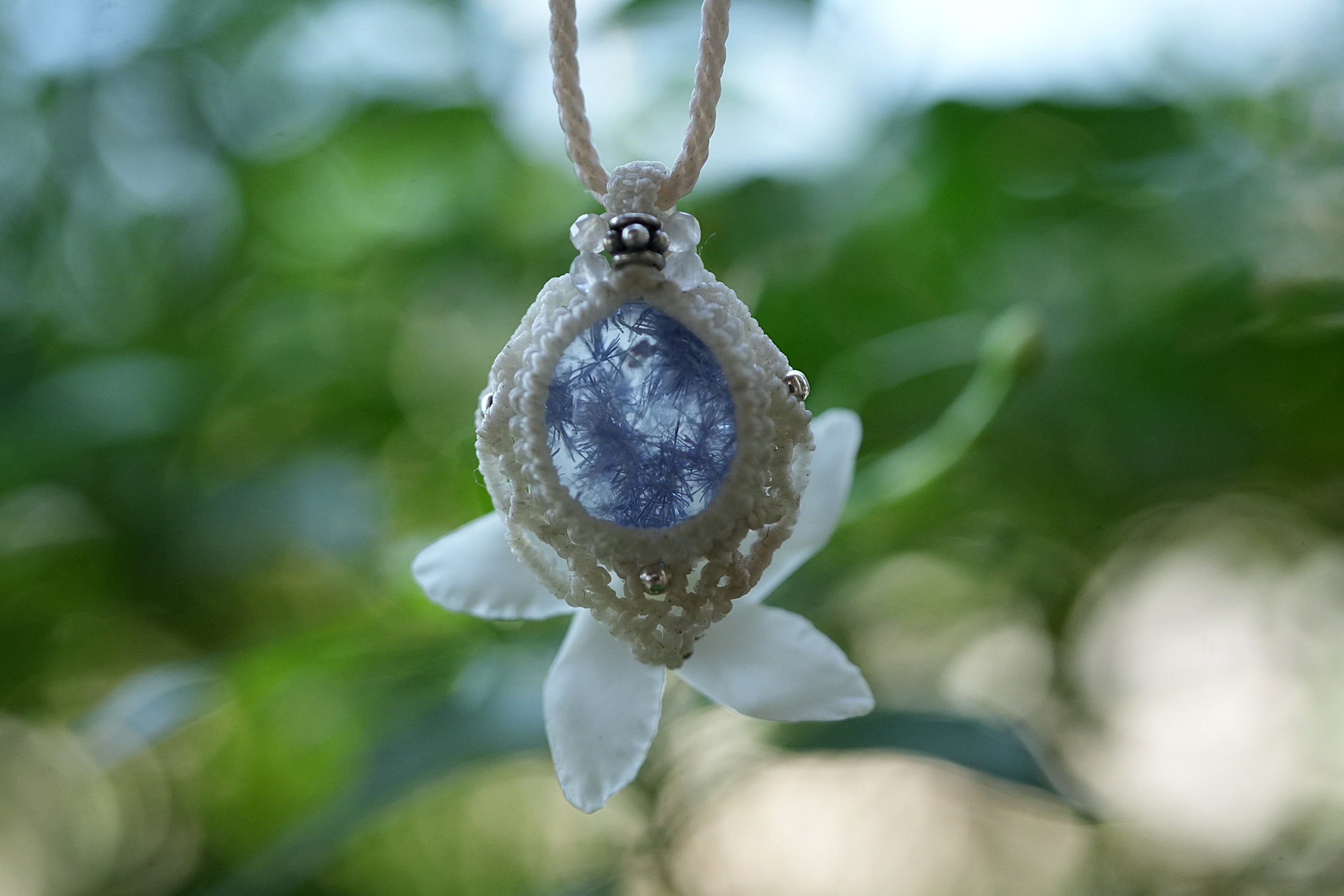 ◆このたびはナチュラルホワイト、ホワイト色の蝋引き糸を使用しマクラメ編み装飾を施しました。