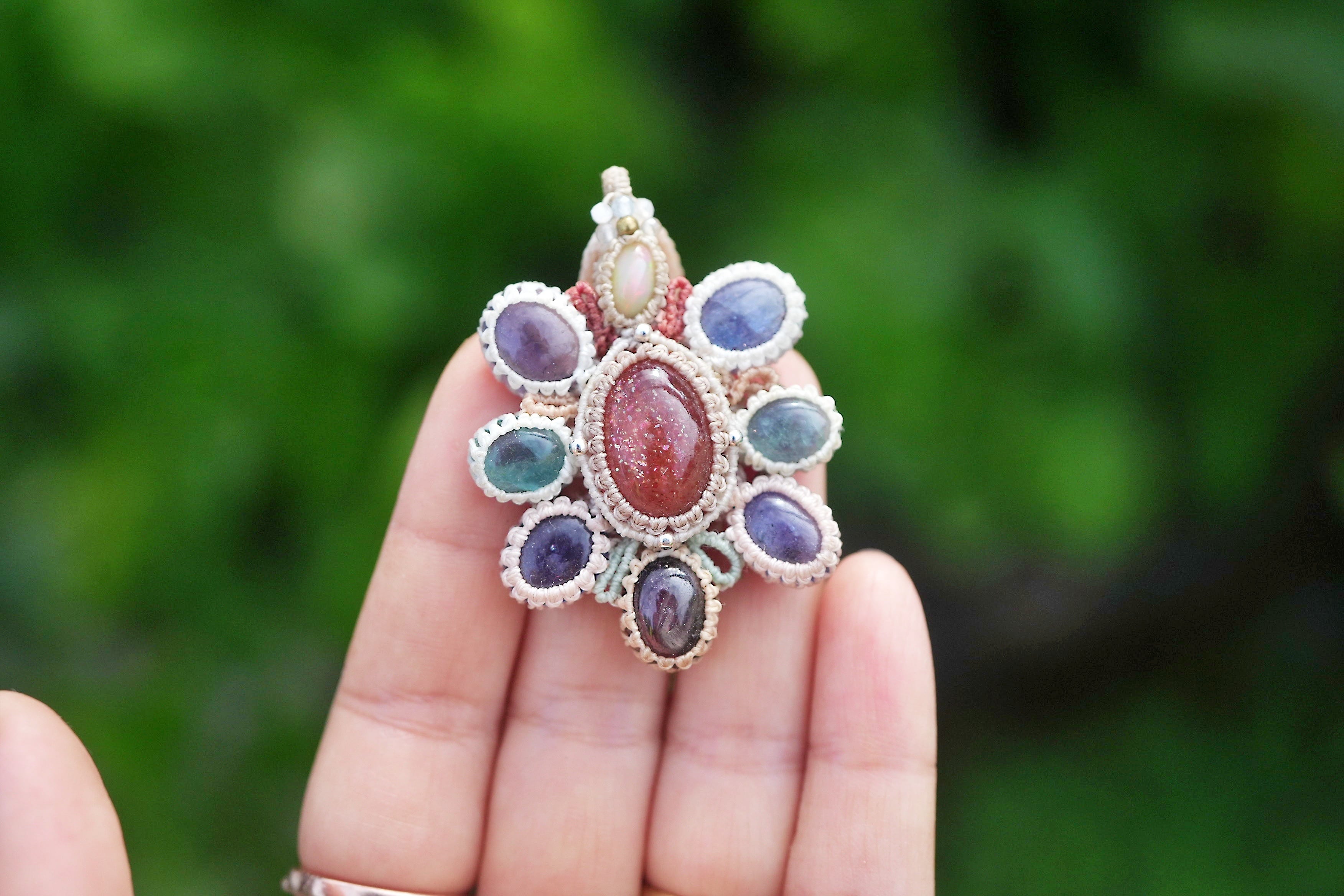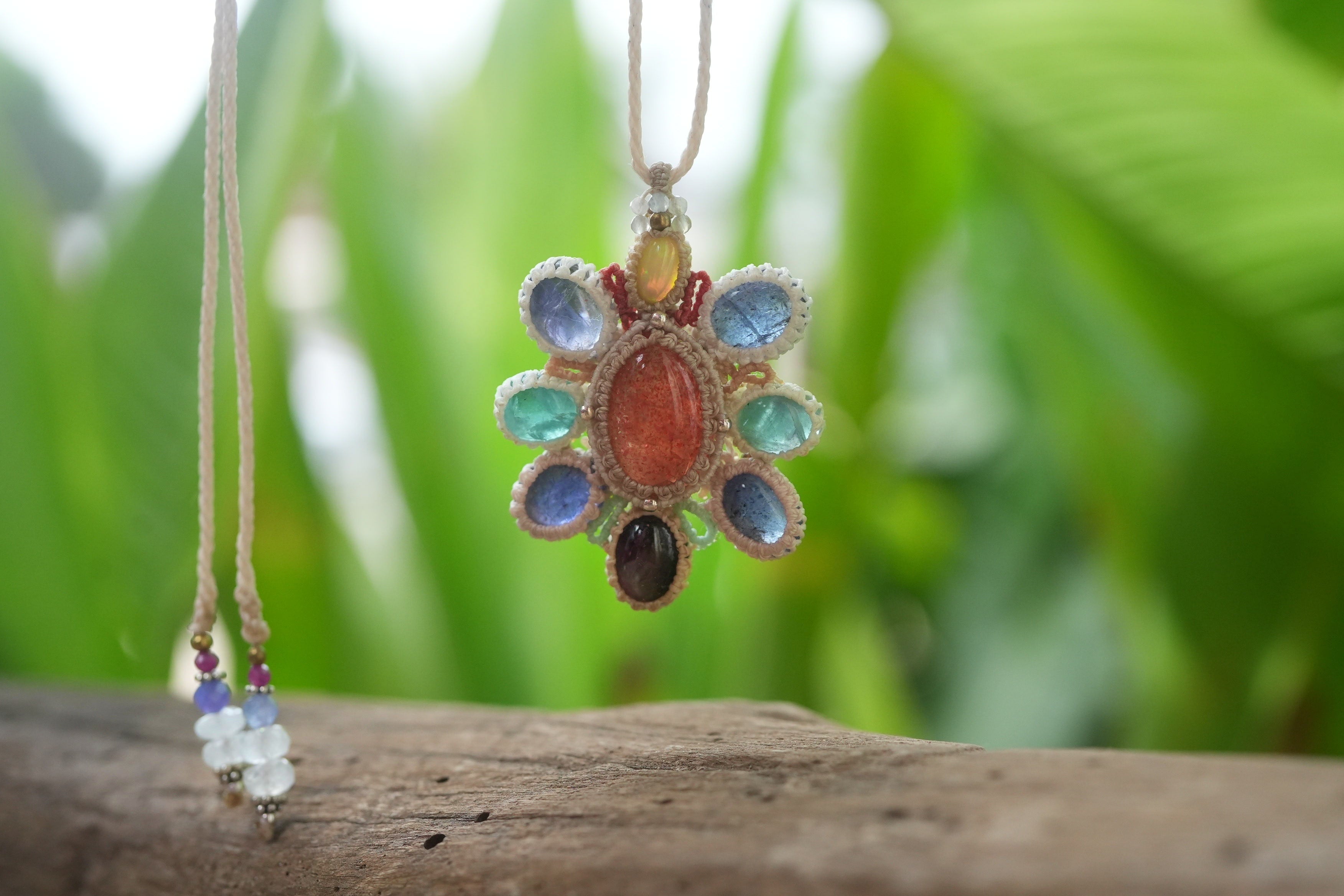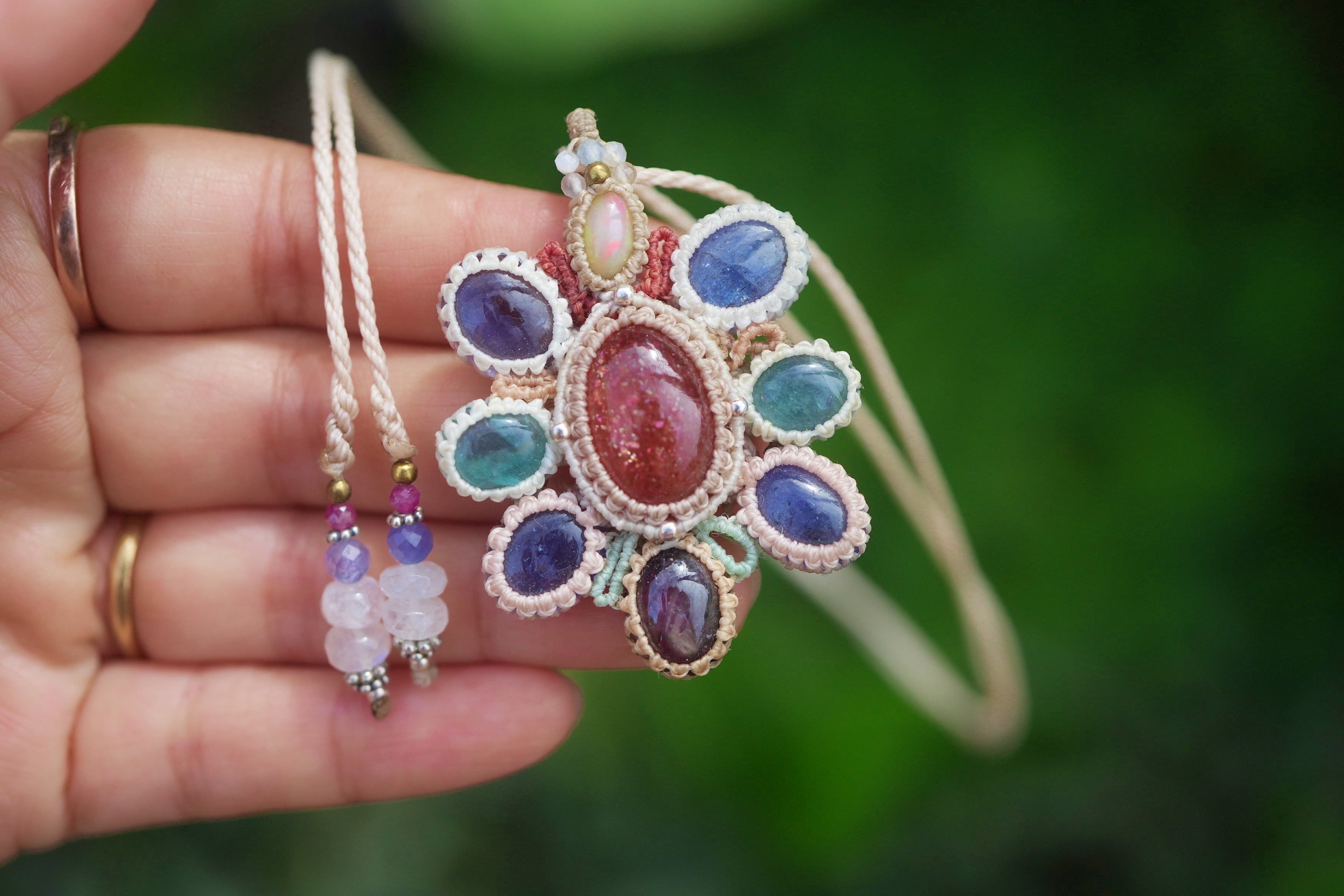 ◆このたびはキャラメル、ブルー、ホワイト、ナチュラルホワイト、ミント、サンセット色の蝋引き糸を使用しマクラメ編み装飾を施しました。