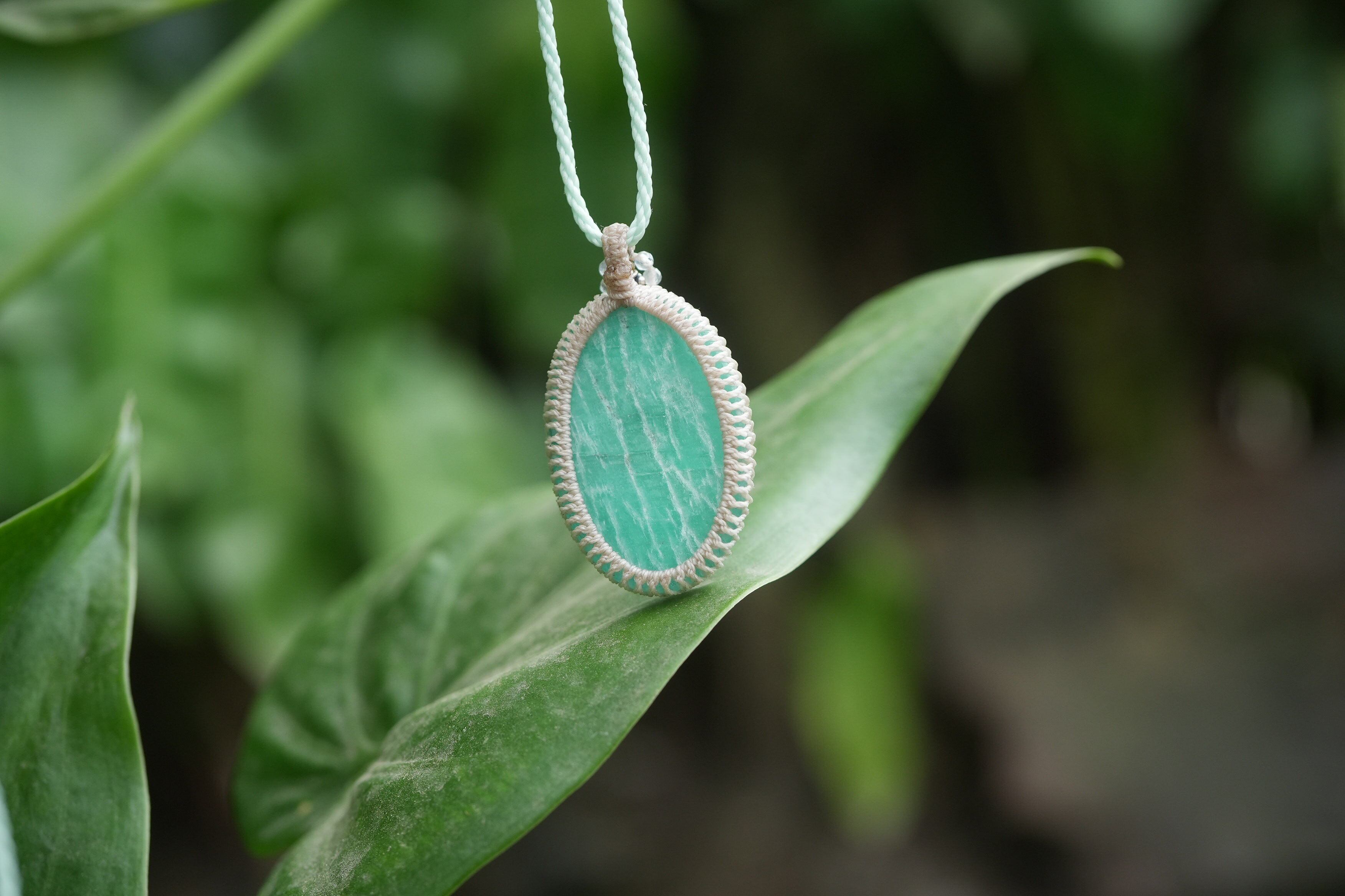 ◆このたびはナチュラルホワイト、ミント色の蝋引き糸を使用しマクラメ編み装飾を施しました。