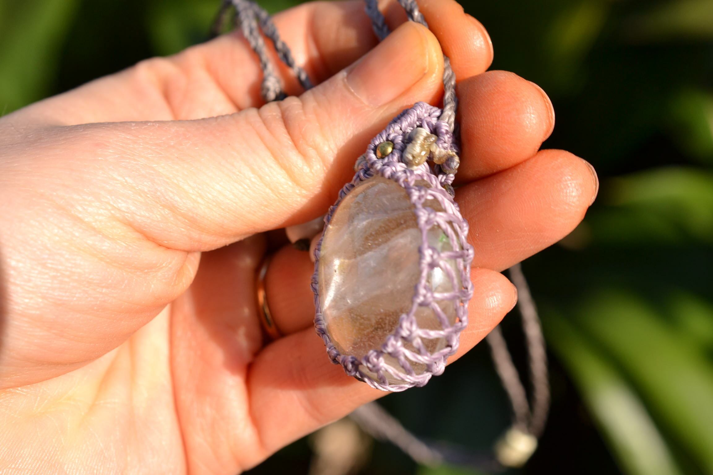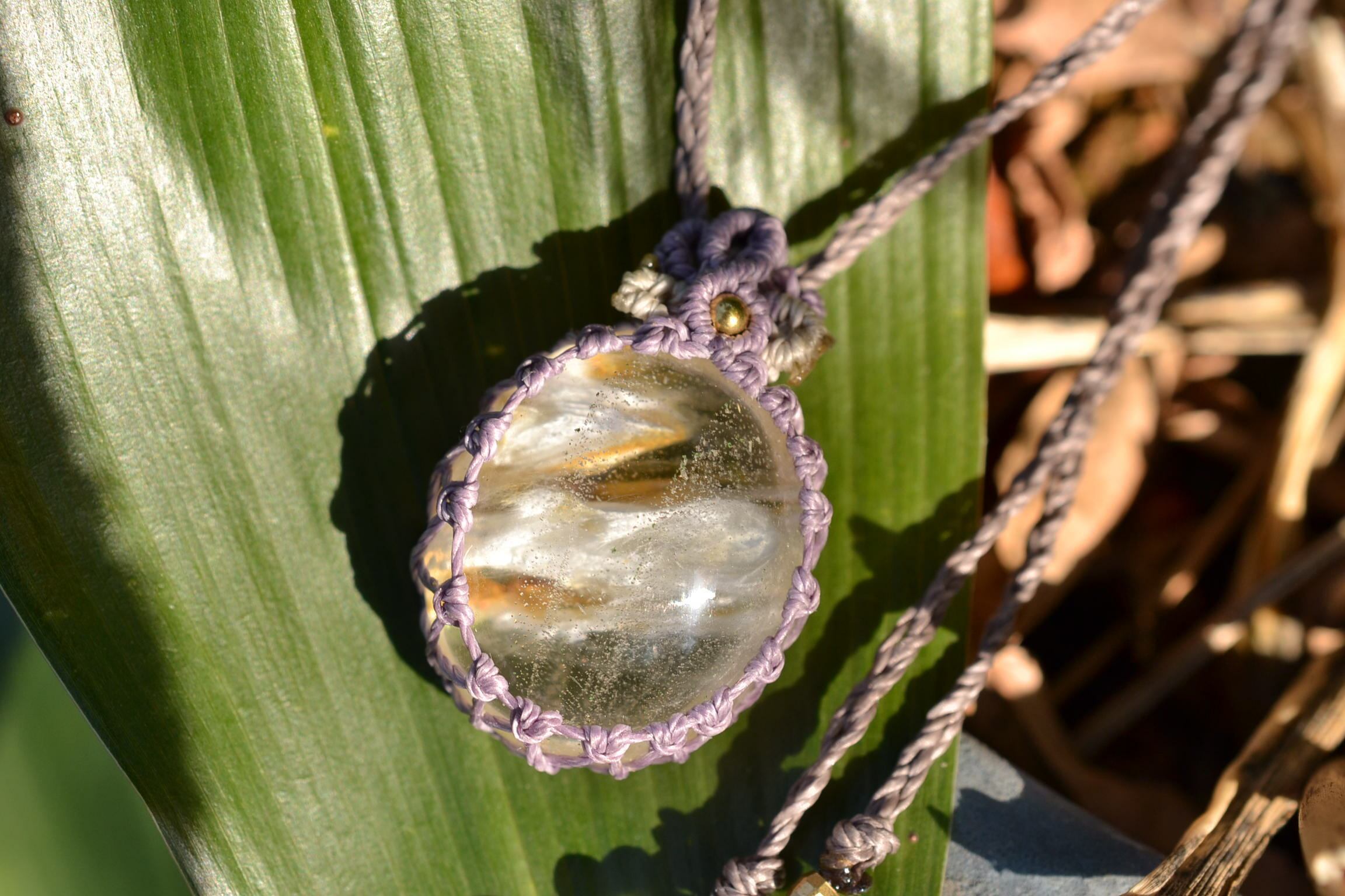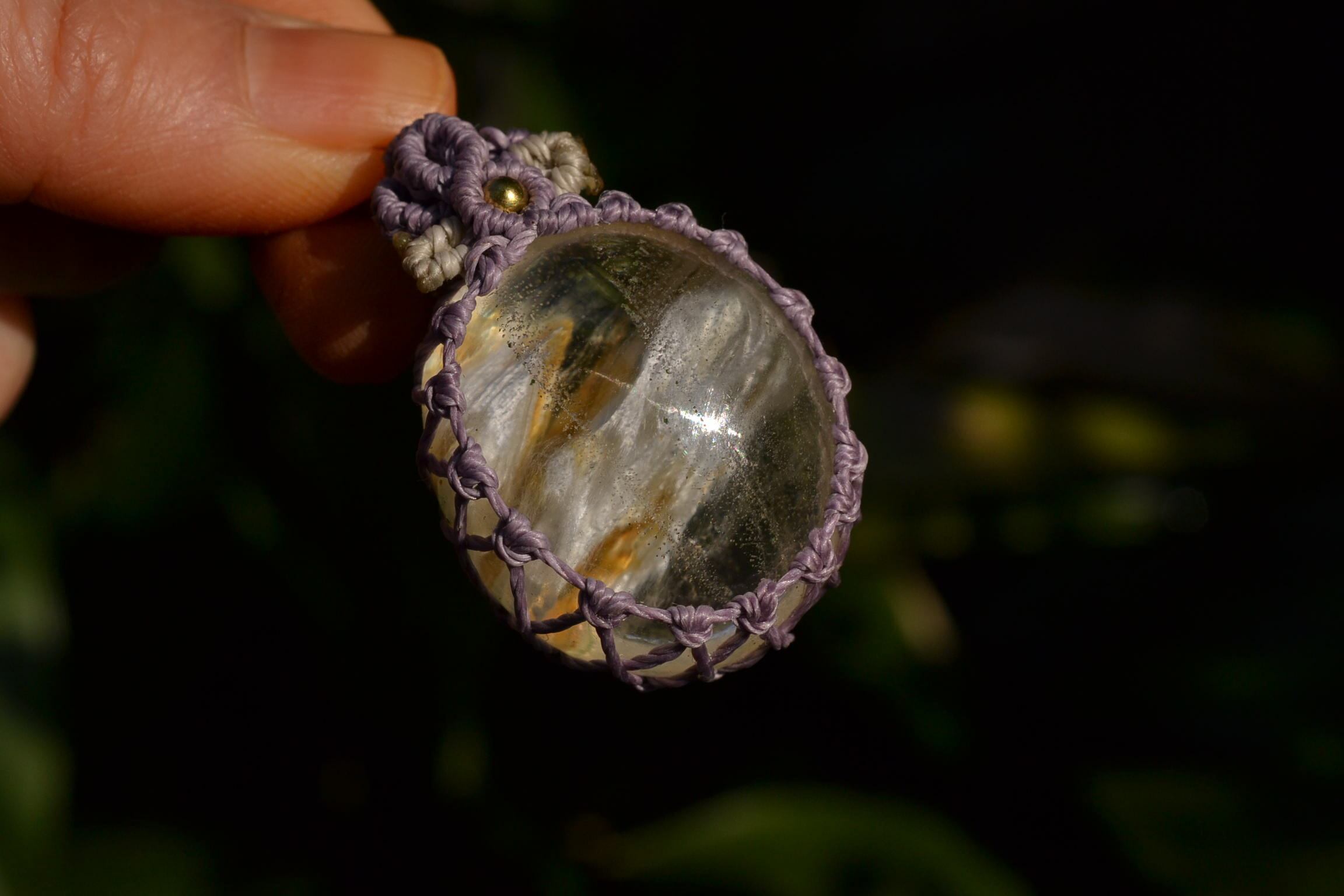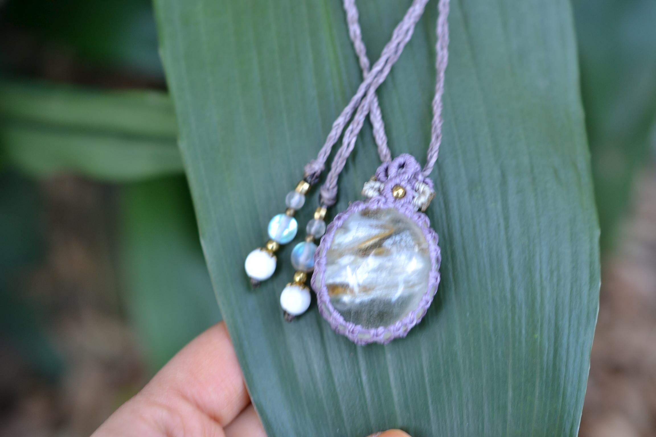 気泡と白い煙が入り混じるホワイトガーデンクォーツをパープルカラーの蝋引き糸メインでマクラメ編み装飾を施してペンダントに仕上げました。
