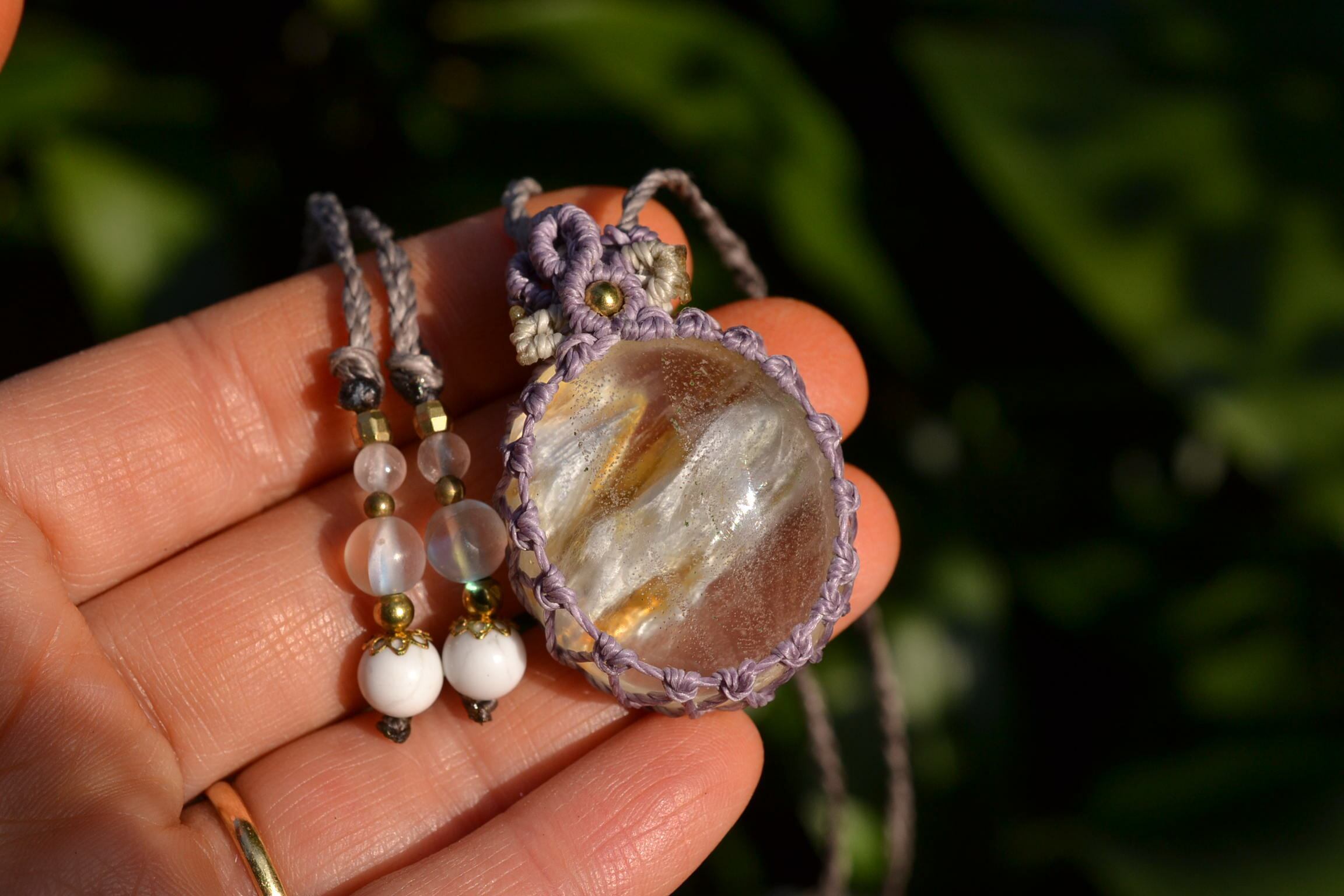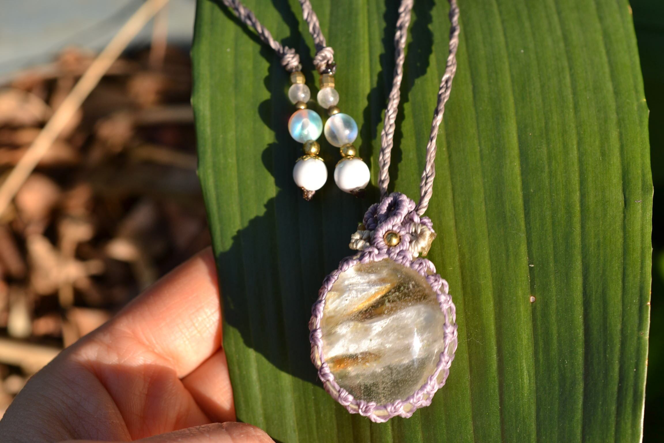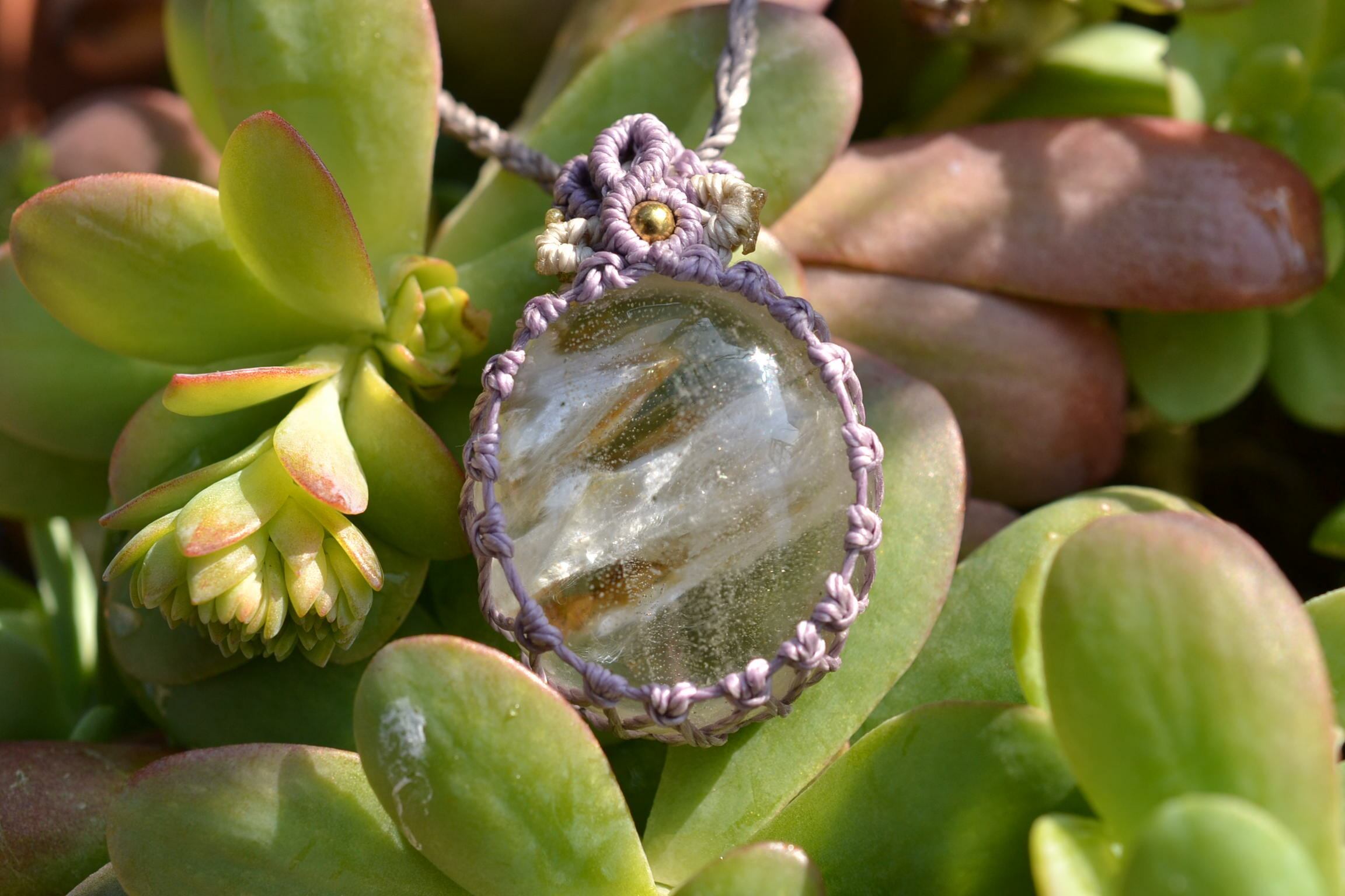 気泡と白い煙が入り混じるホワイトガーデンクォーツをパープルカラーの蝋引き糸メインでマクラメ編み装飾を施してペンダントに仕上げました。
