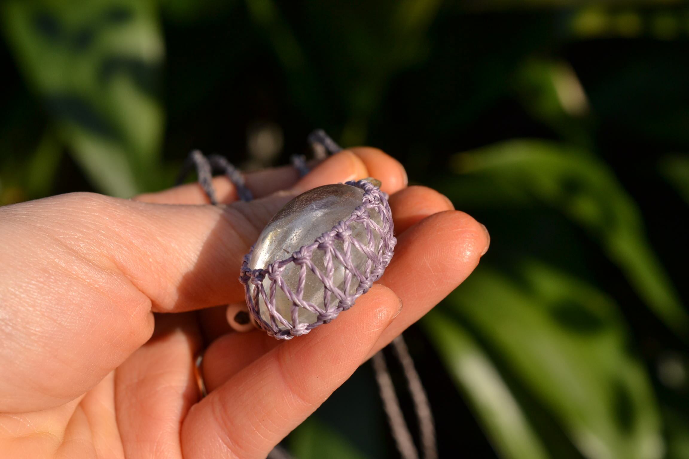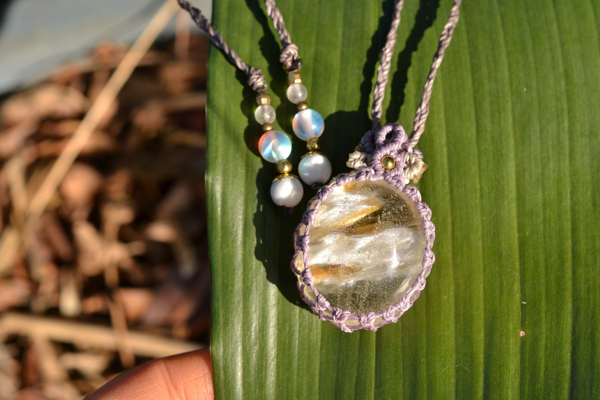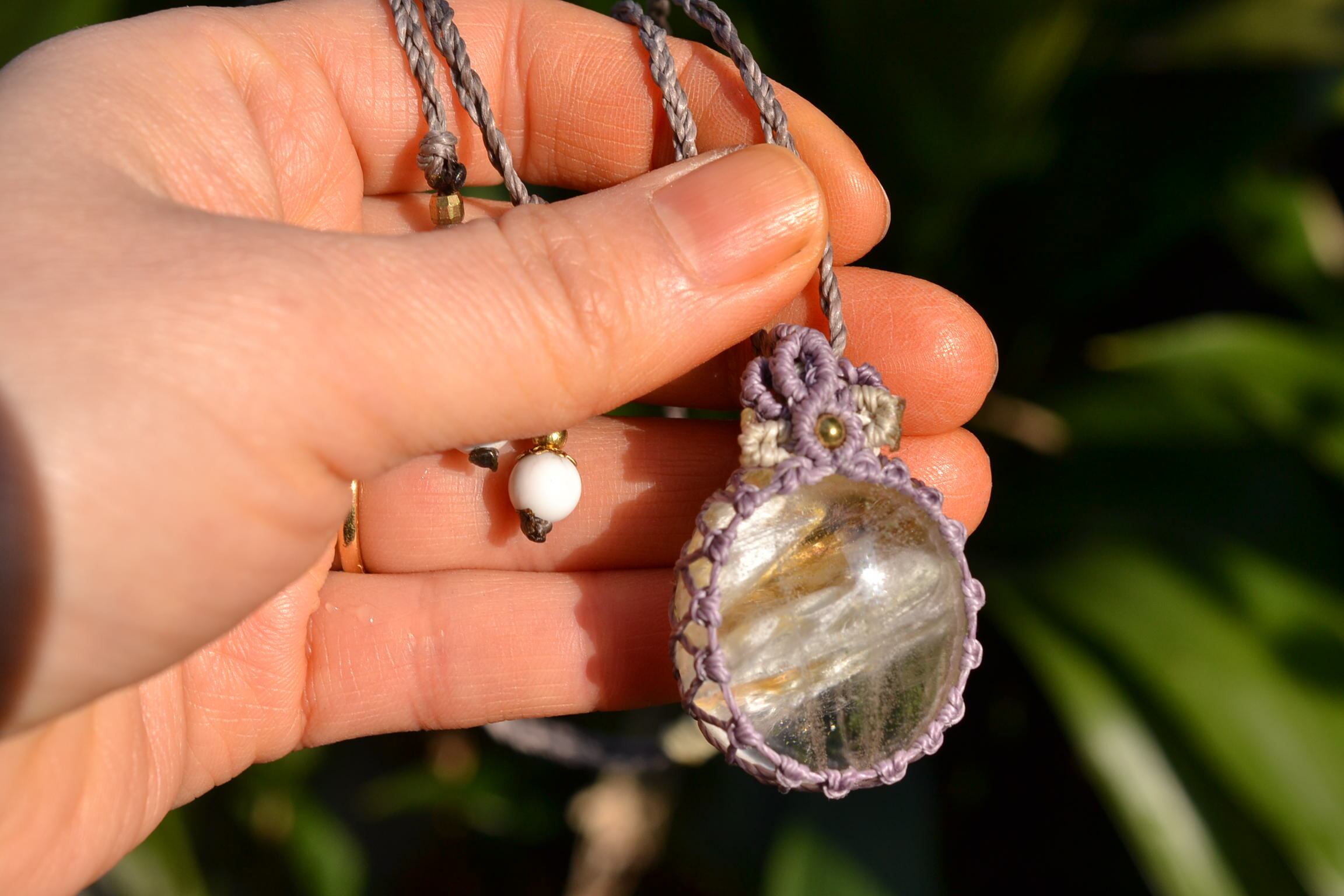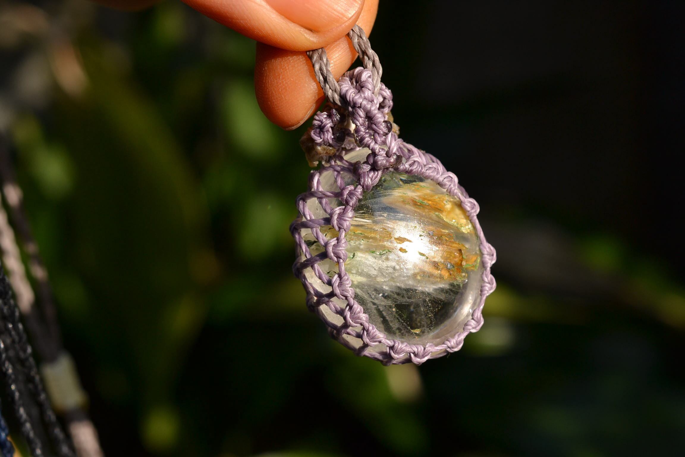 気泡と白い煙が入り混じるホワイトガーデンクォーツをパープルカラーの蝋引き糸メインでマクラメ編み装飾を施してペンダントに仕上げました。