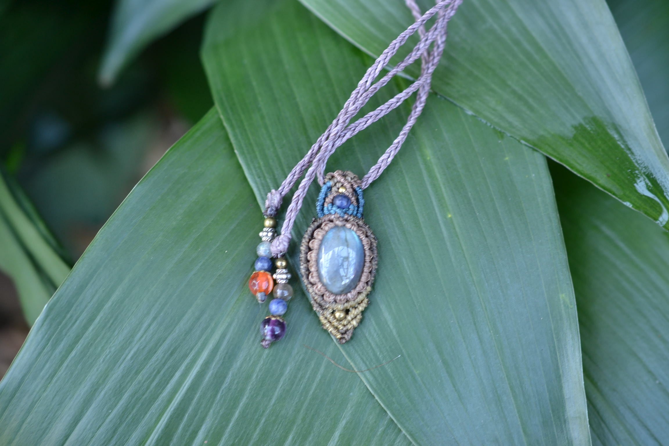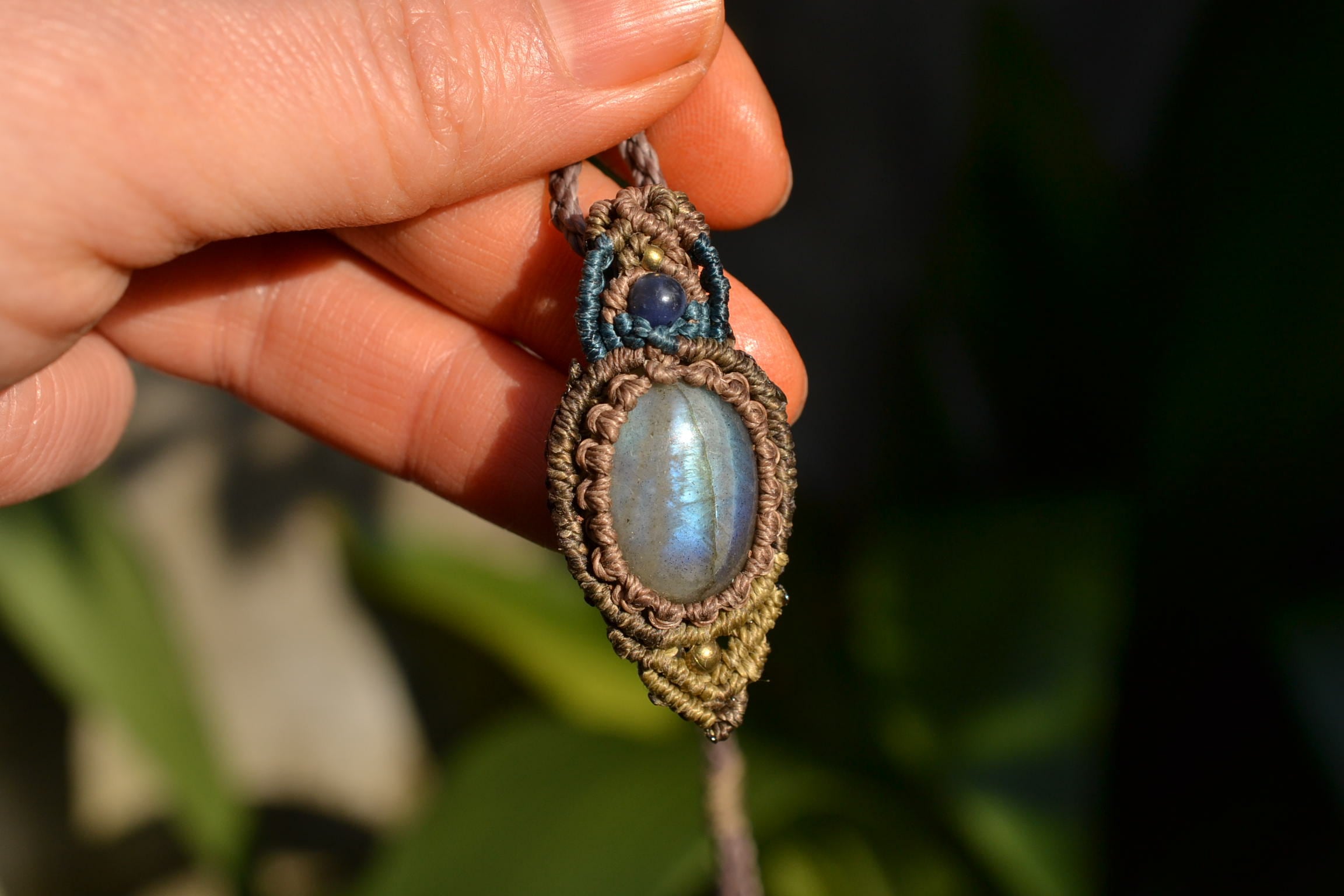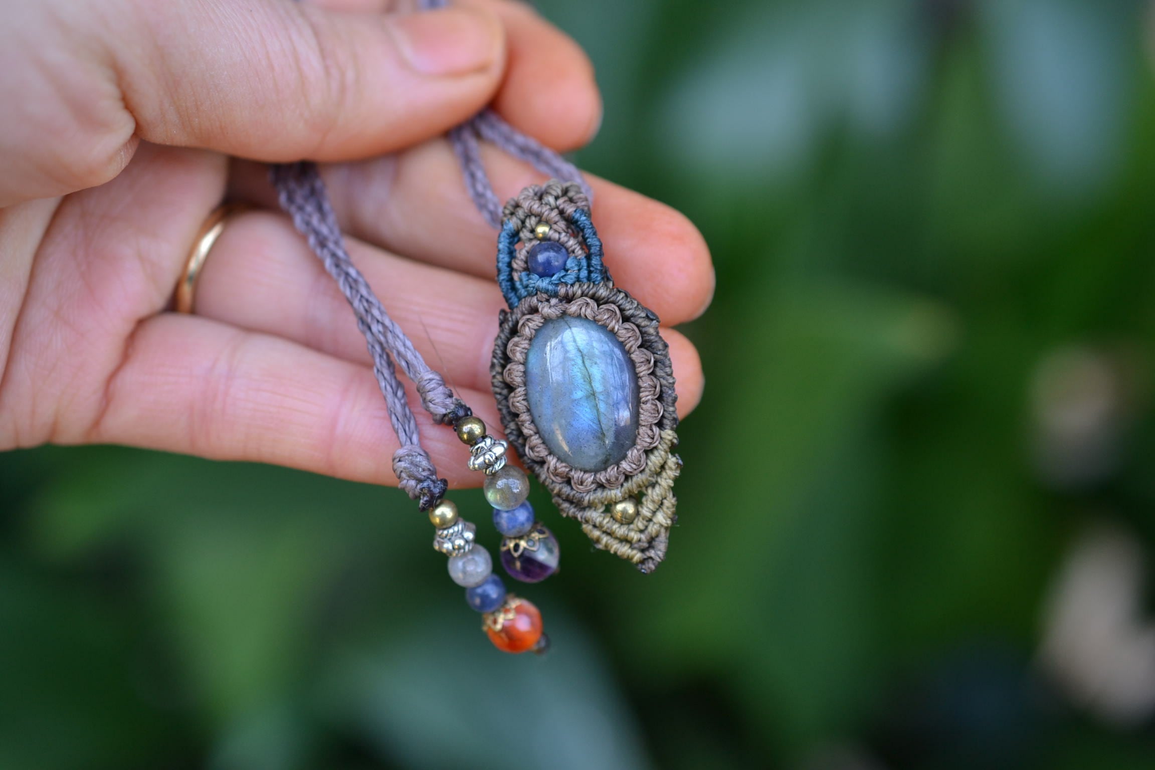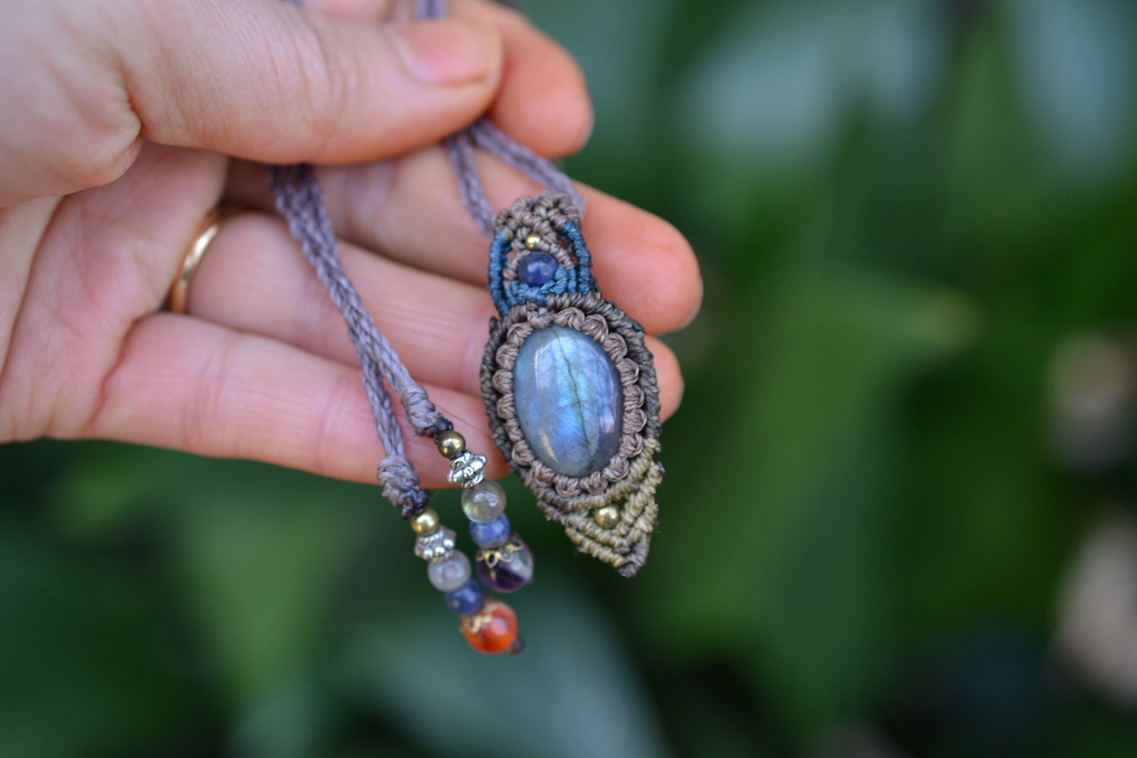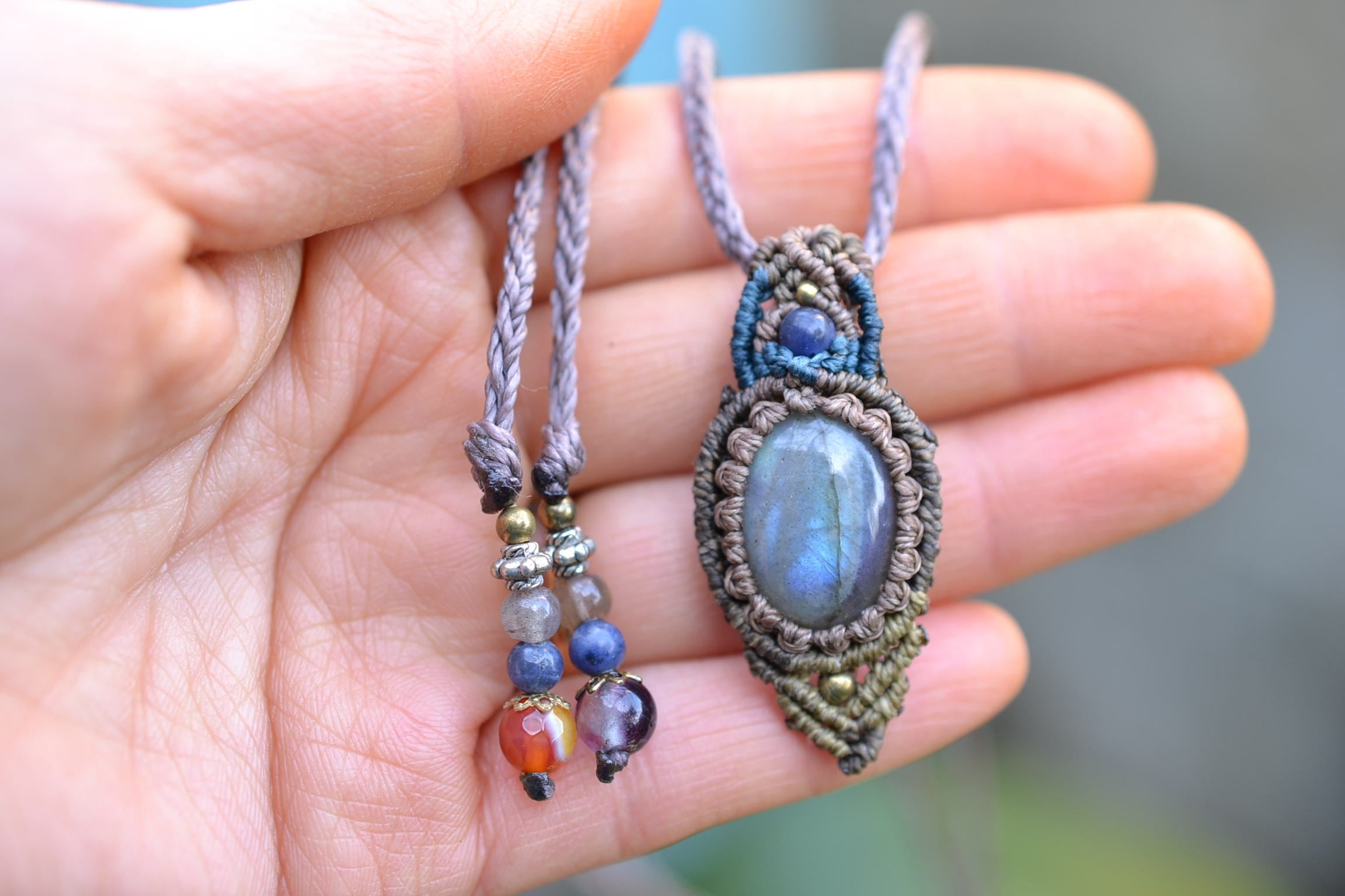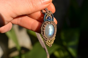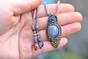 小ぶりながらもしっかりとしたブルーを輝かせてくれるこのたびのラブラドライト。 たくさんのビーズストーンと一緒にマクラメペンダントに仕上げました。