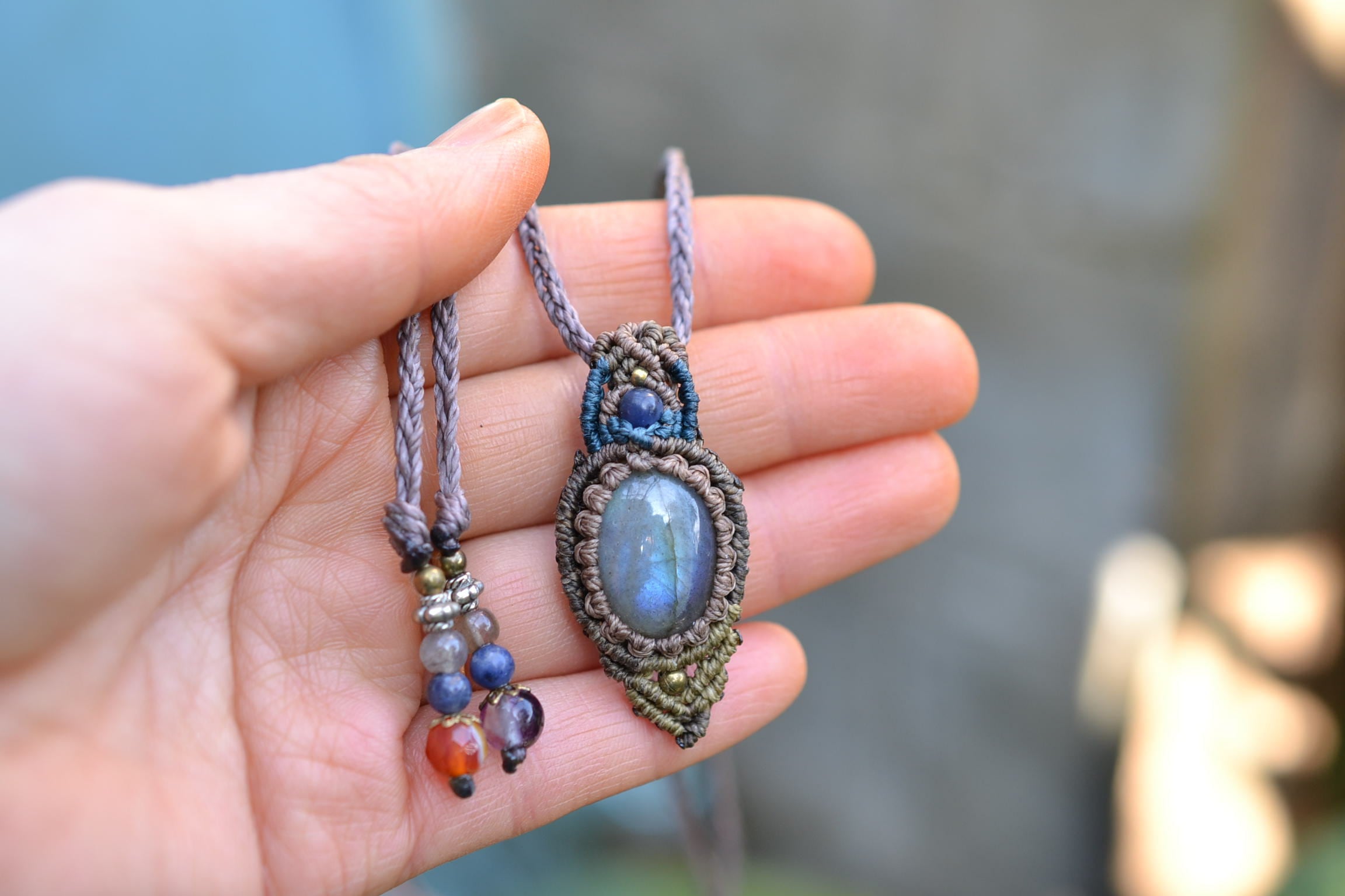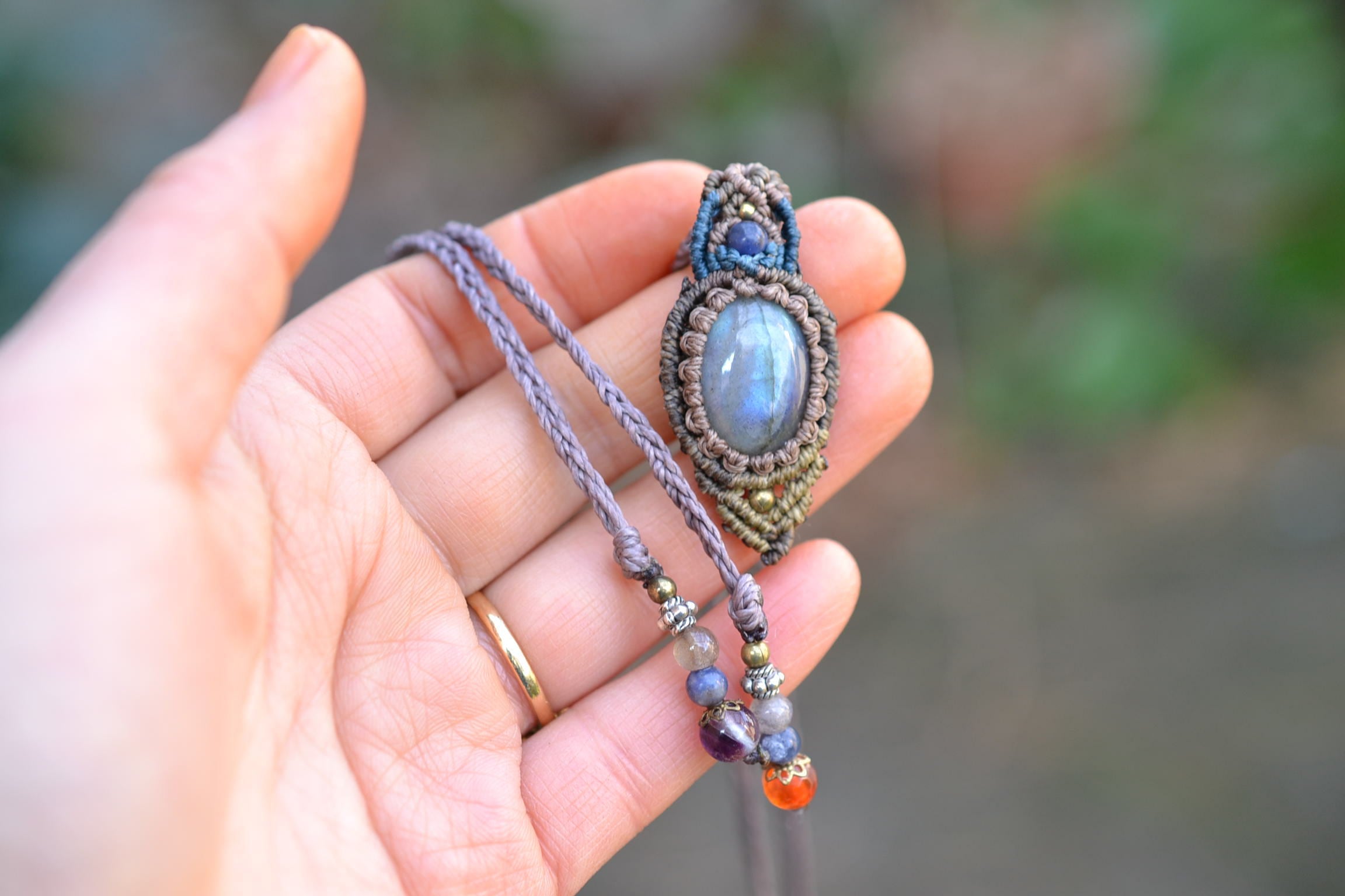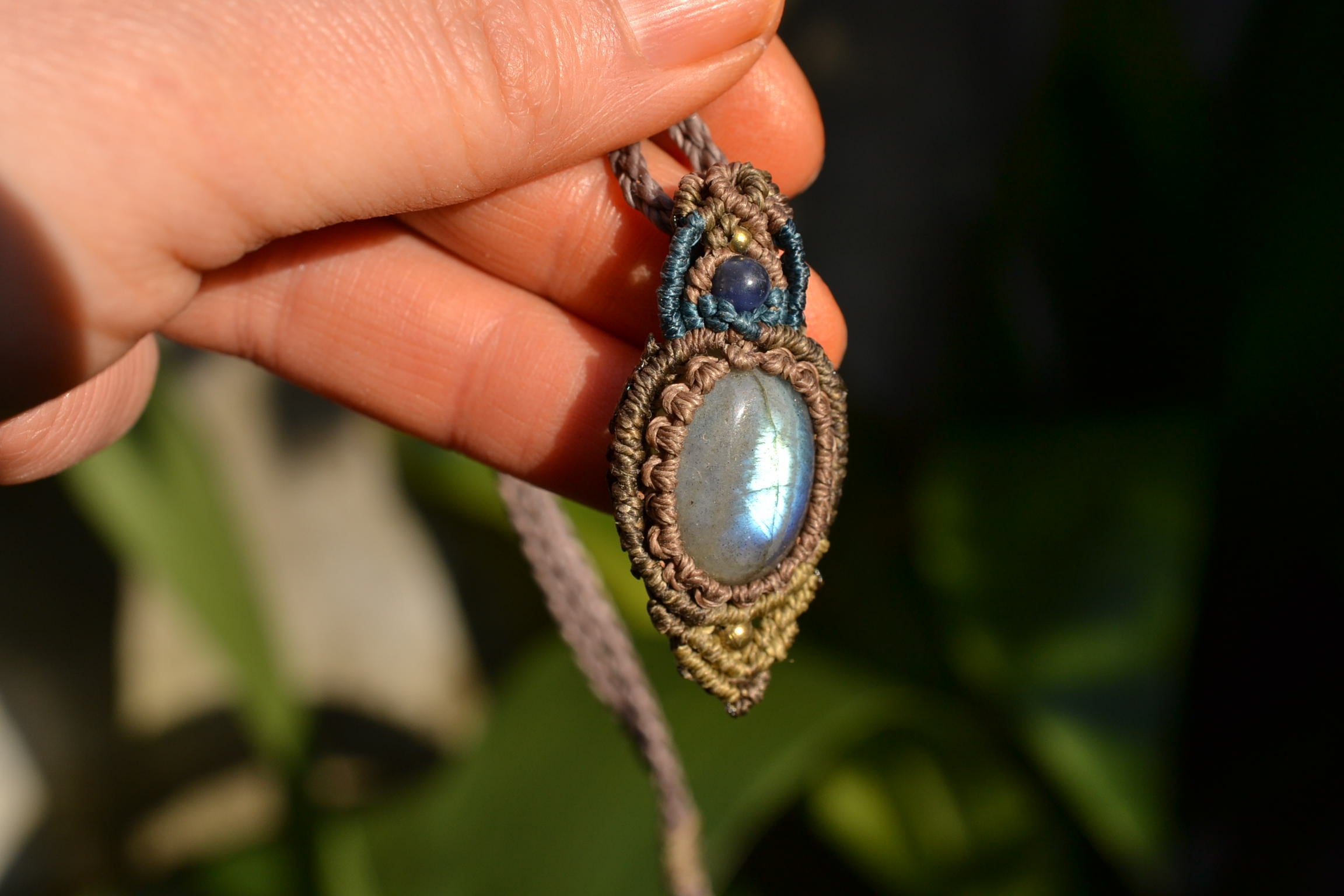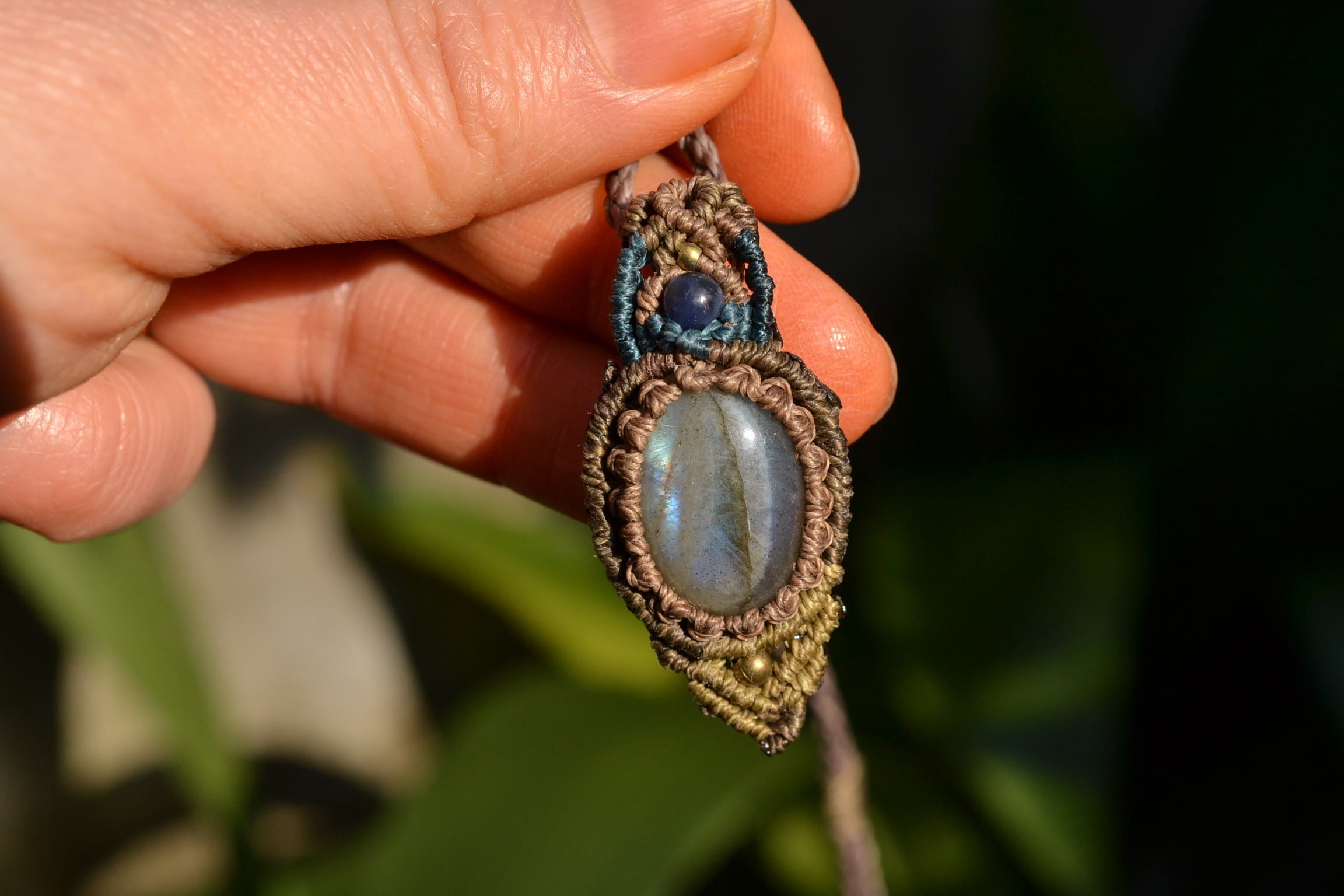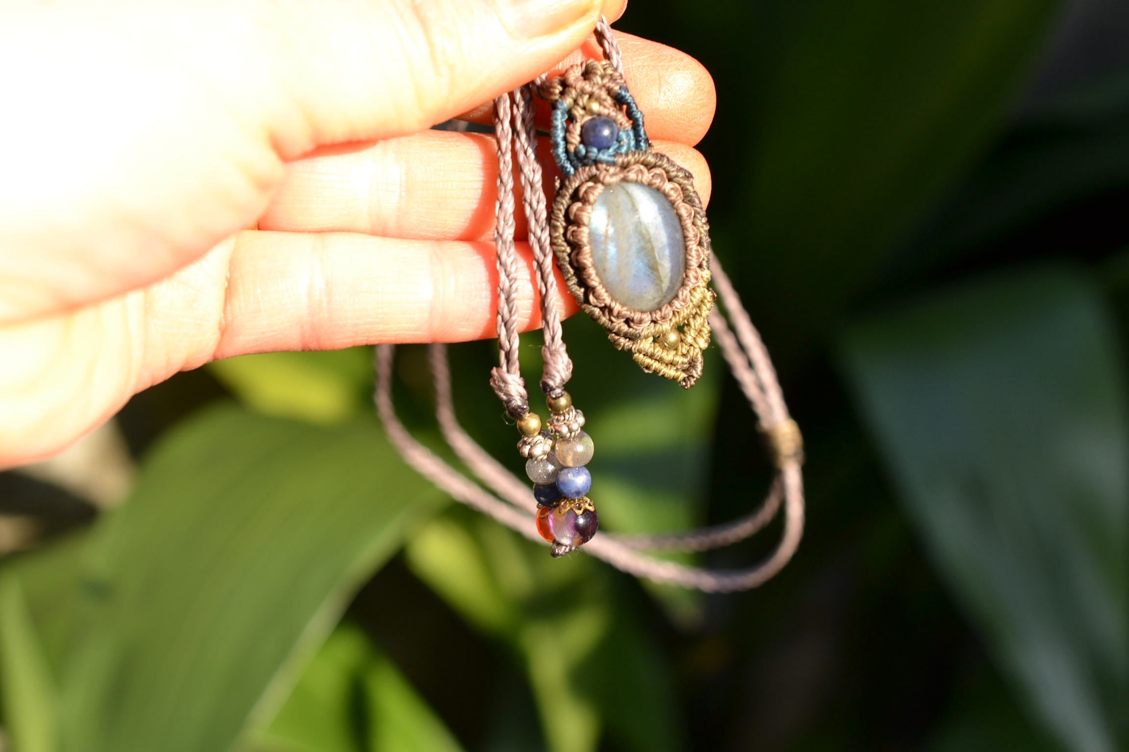 小ぶりながらもしっかりとしたブルーを輝かせてくれるこのたびのラブラドライト。 たくさんのビーズストーンと一緒にマクラメペンダントに仕上げました。
