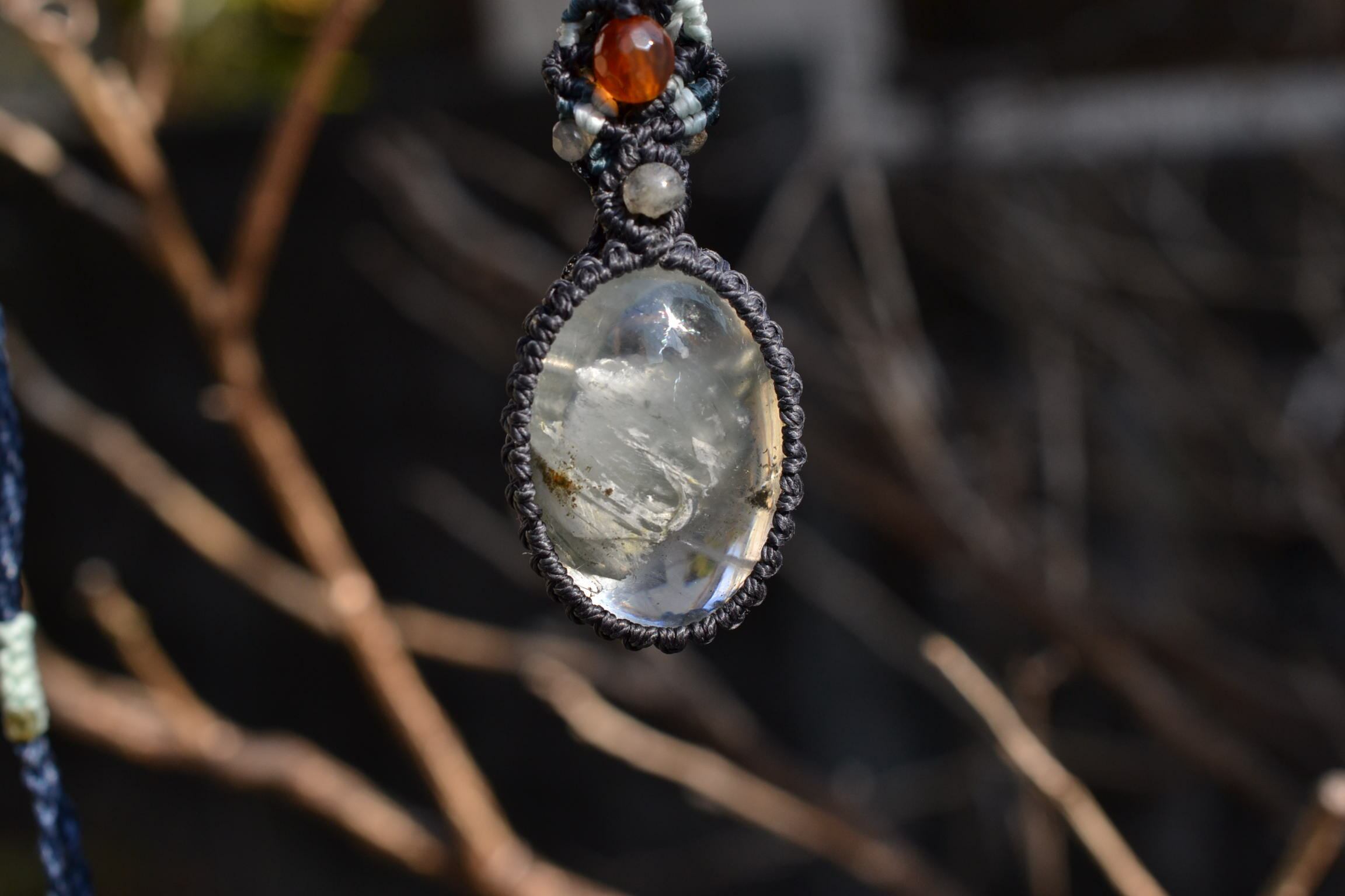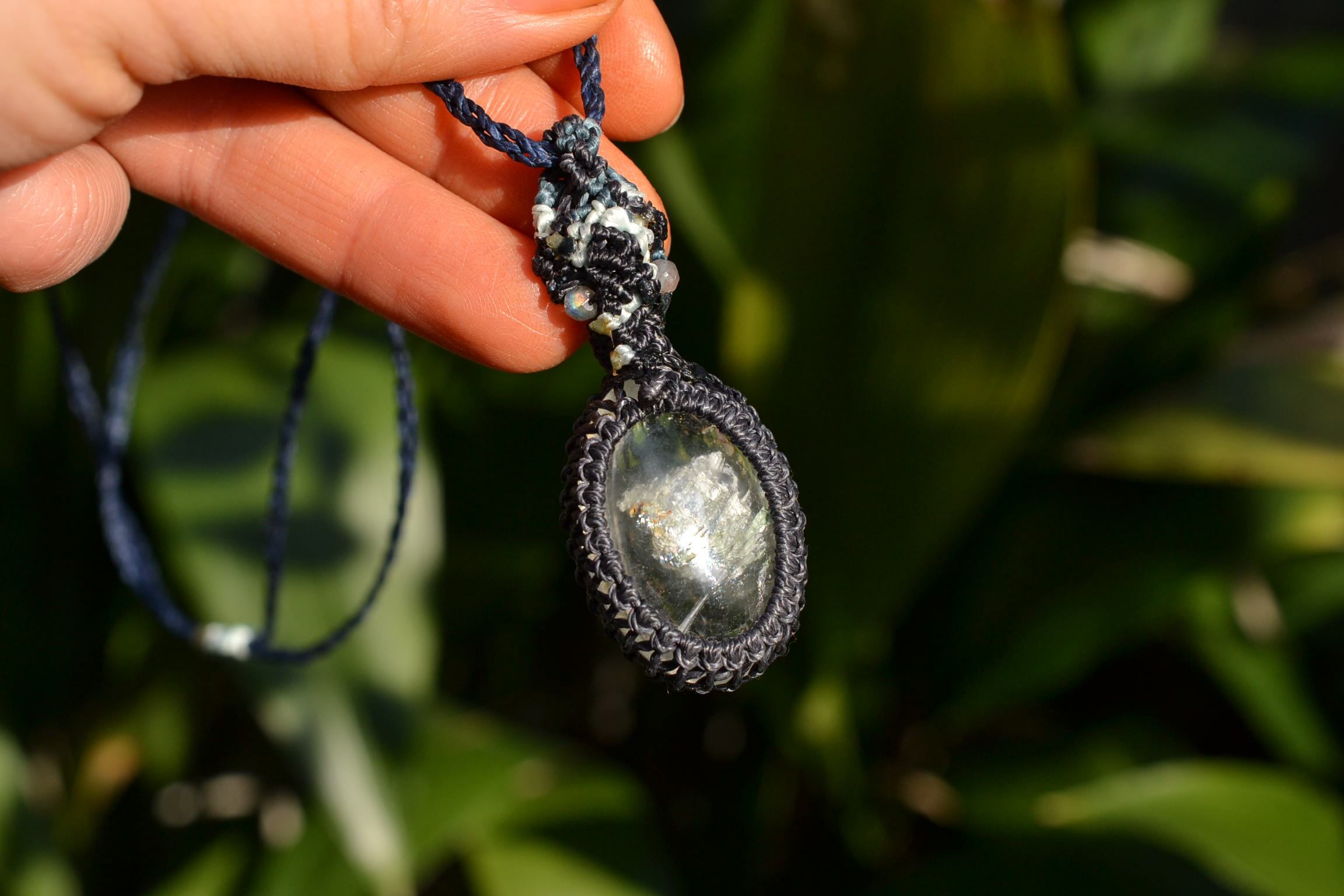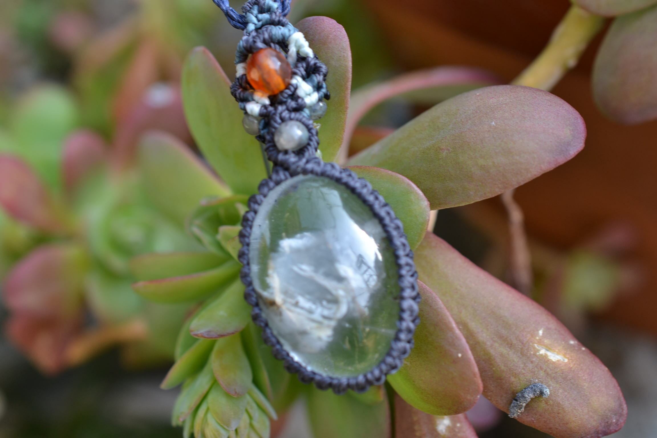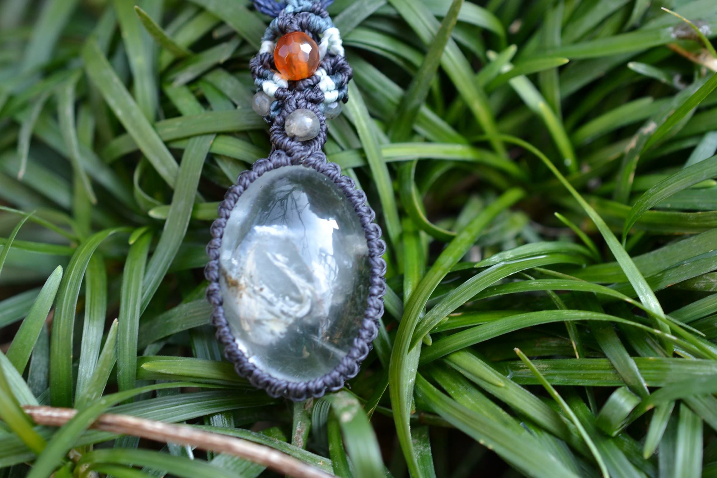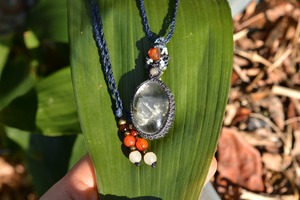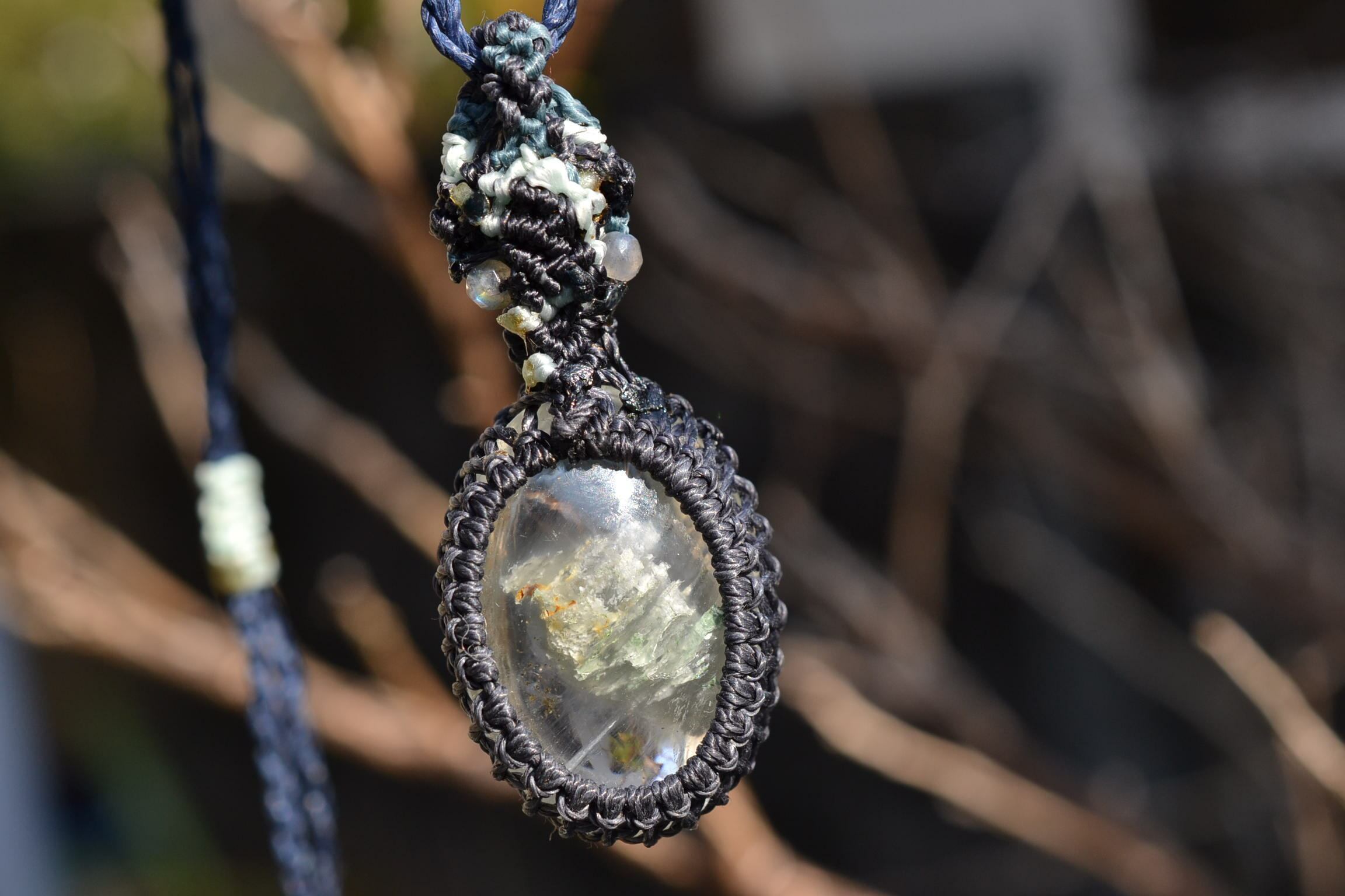 非常に不思議なアートが描かれているガーデンクォーツをペンダントにマクラメ編み装飾して仕上げました。