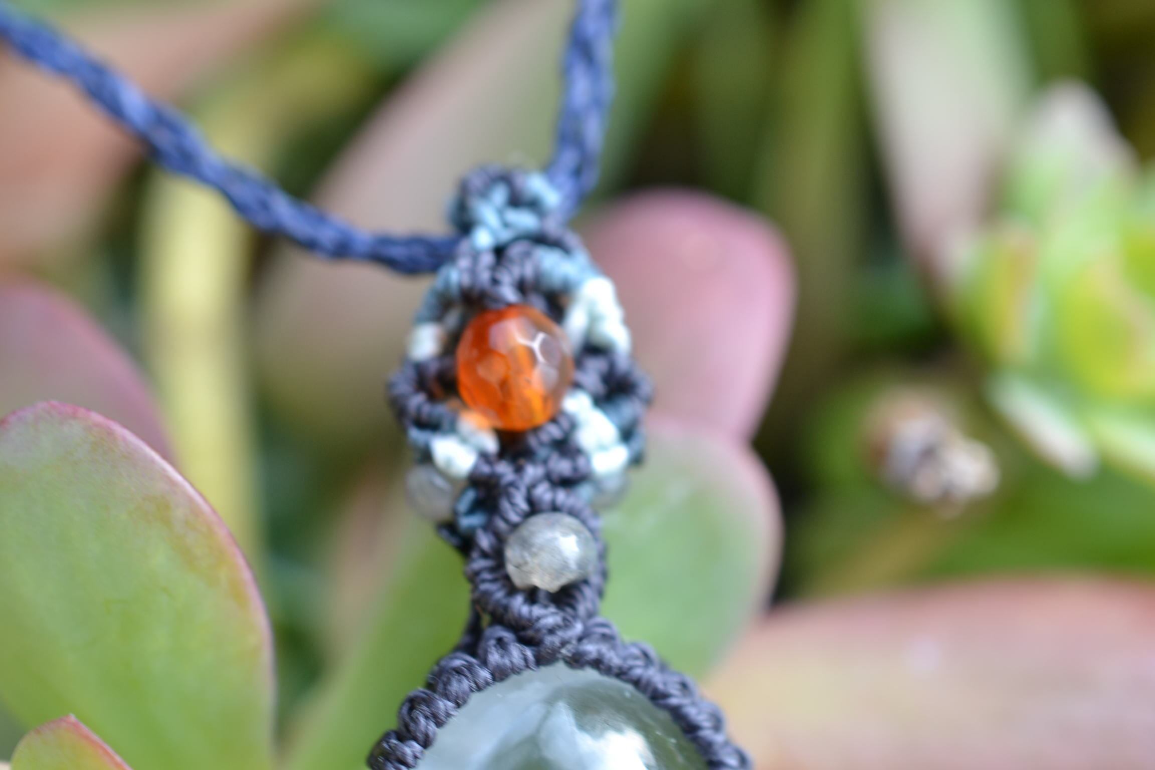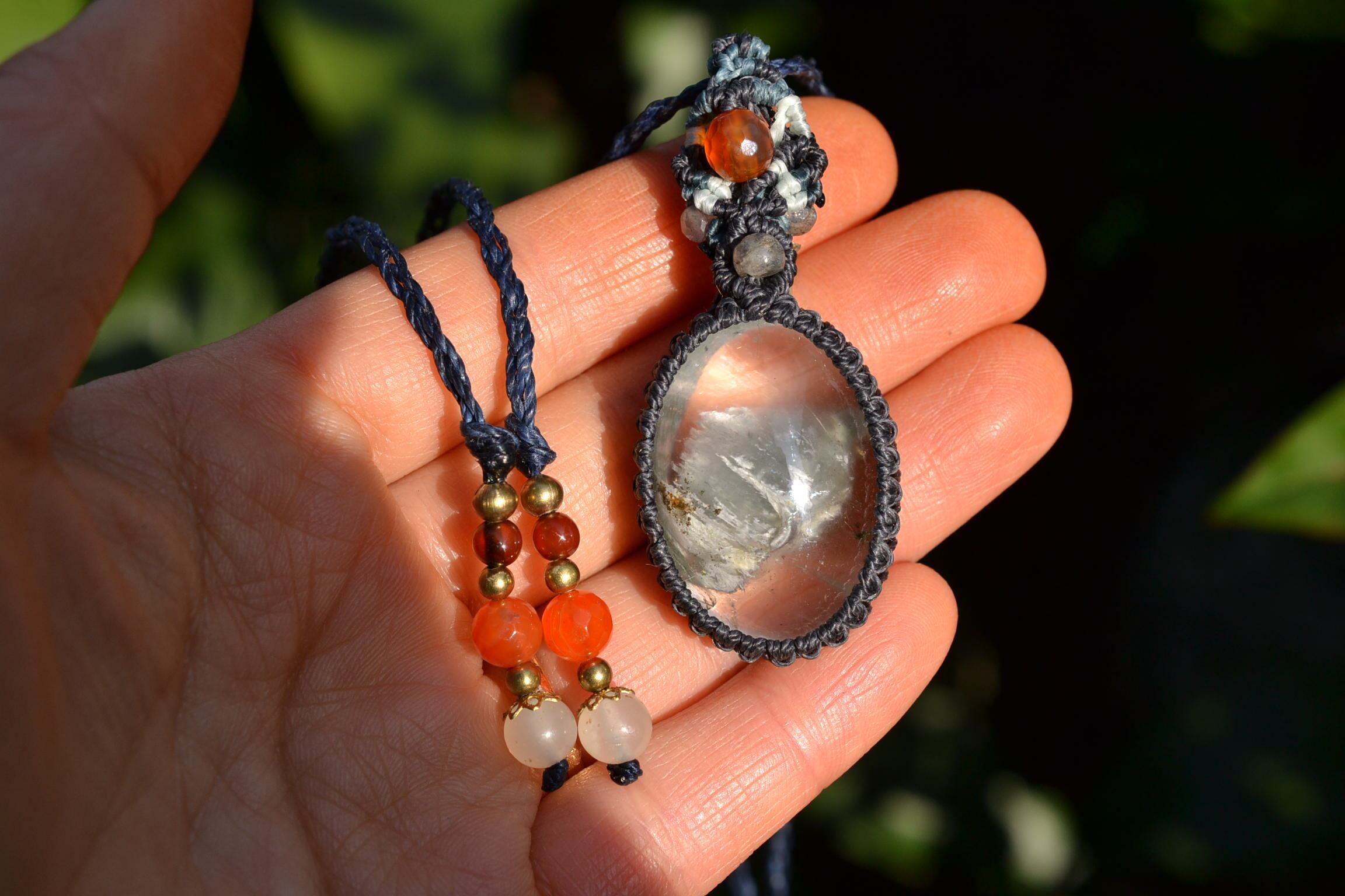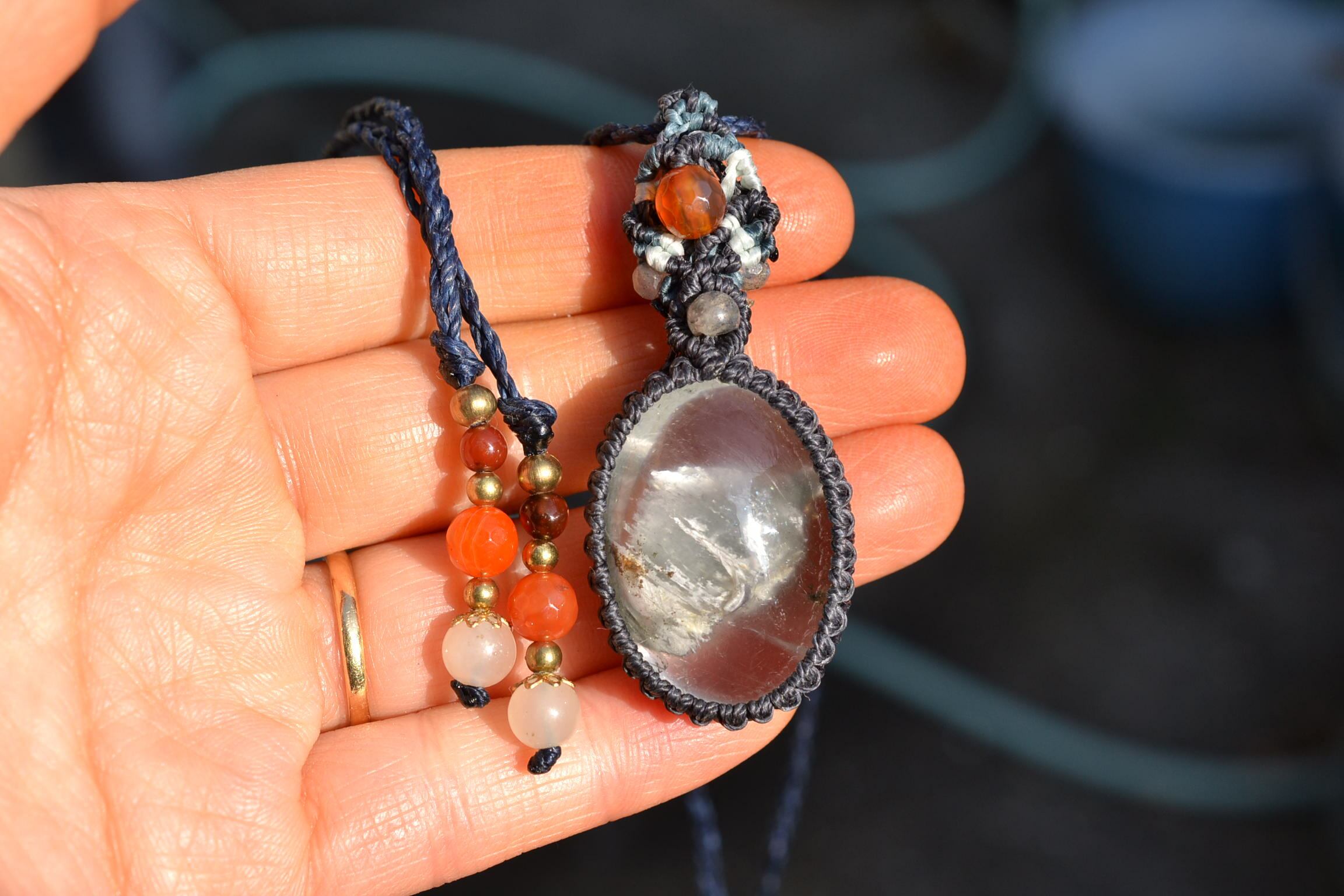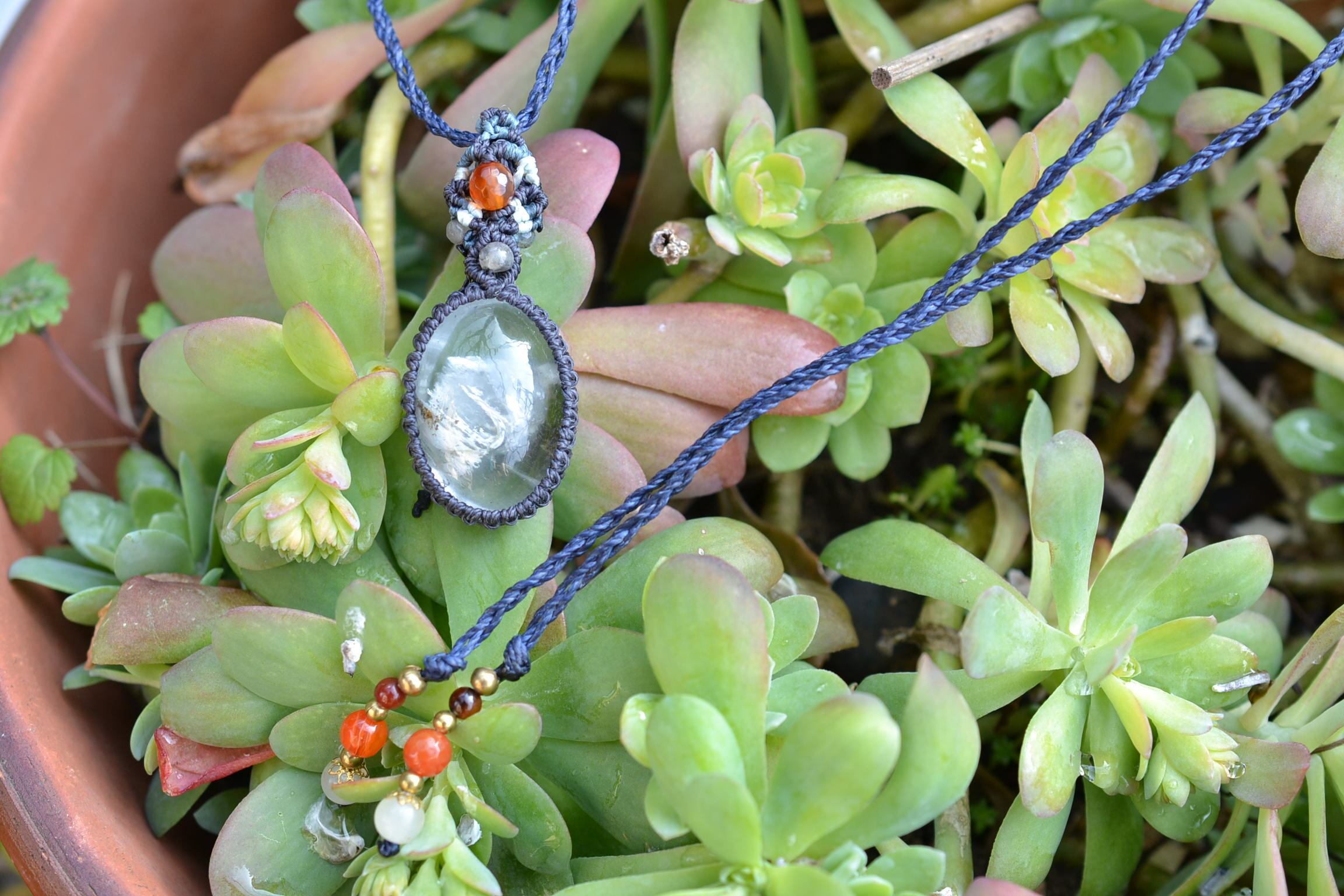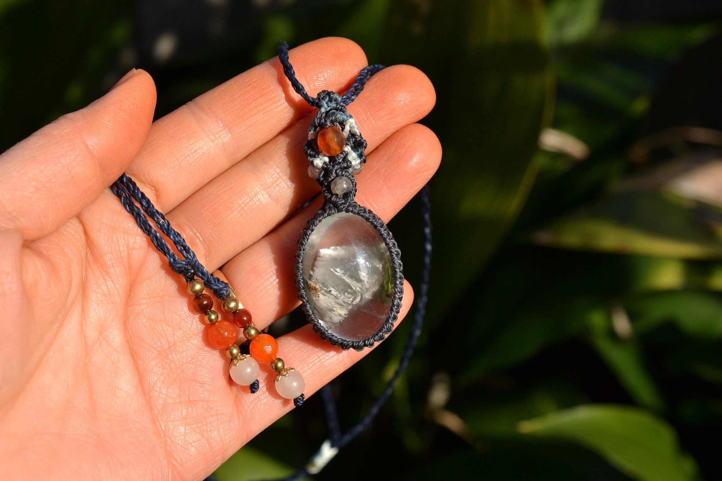 非常に不思議なアートが描かれているガーデンクォーツをペンダントにマクラメ編み装飾して仕上げました。
