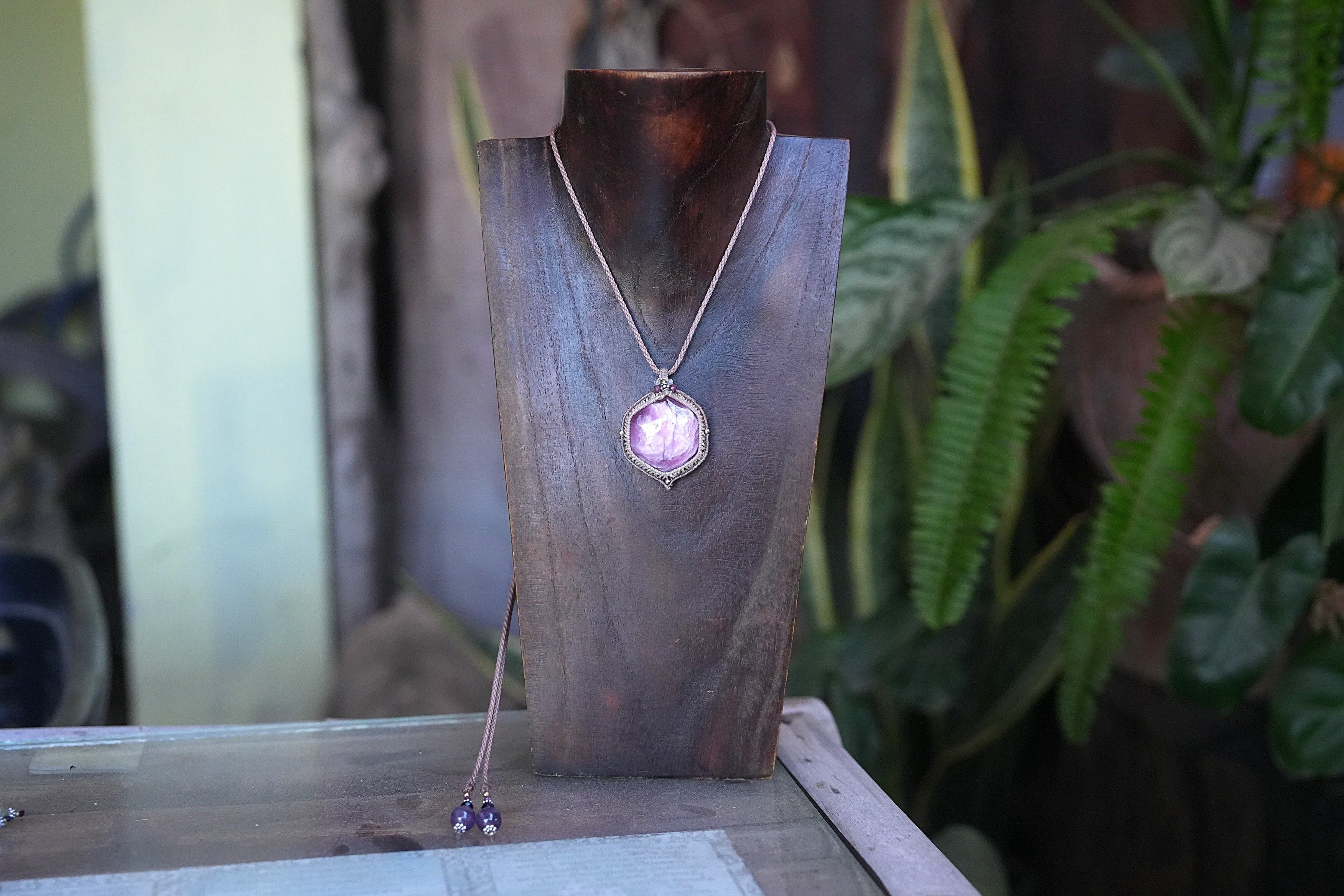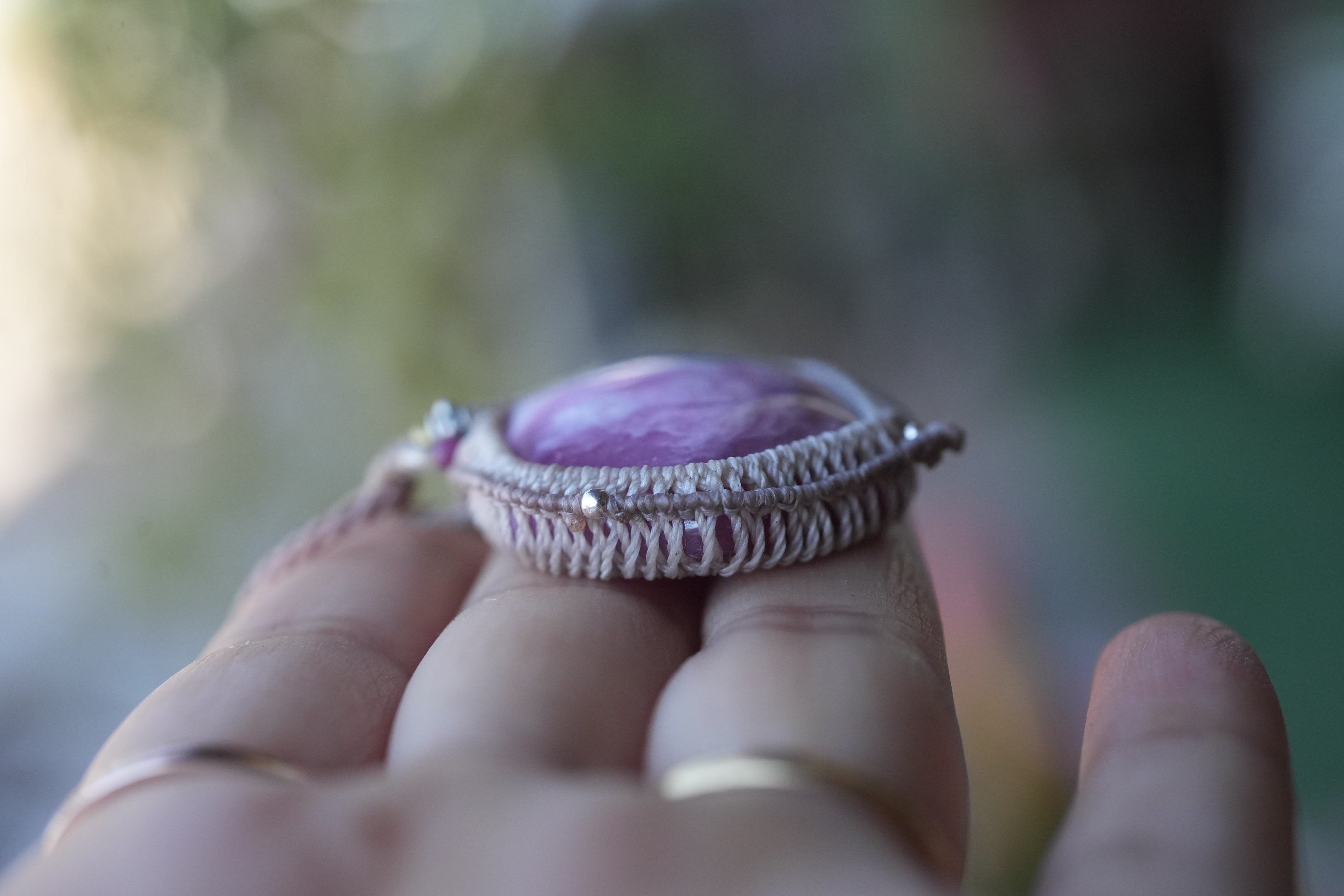 ◆このたびはキナリ、カフェオレ色の蝋引き糸を使用しマクラメ編み装飾を施しました。