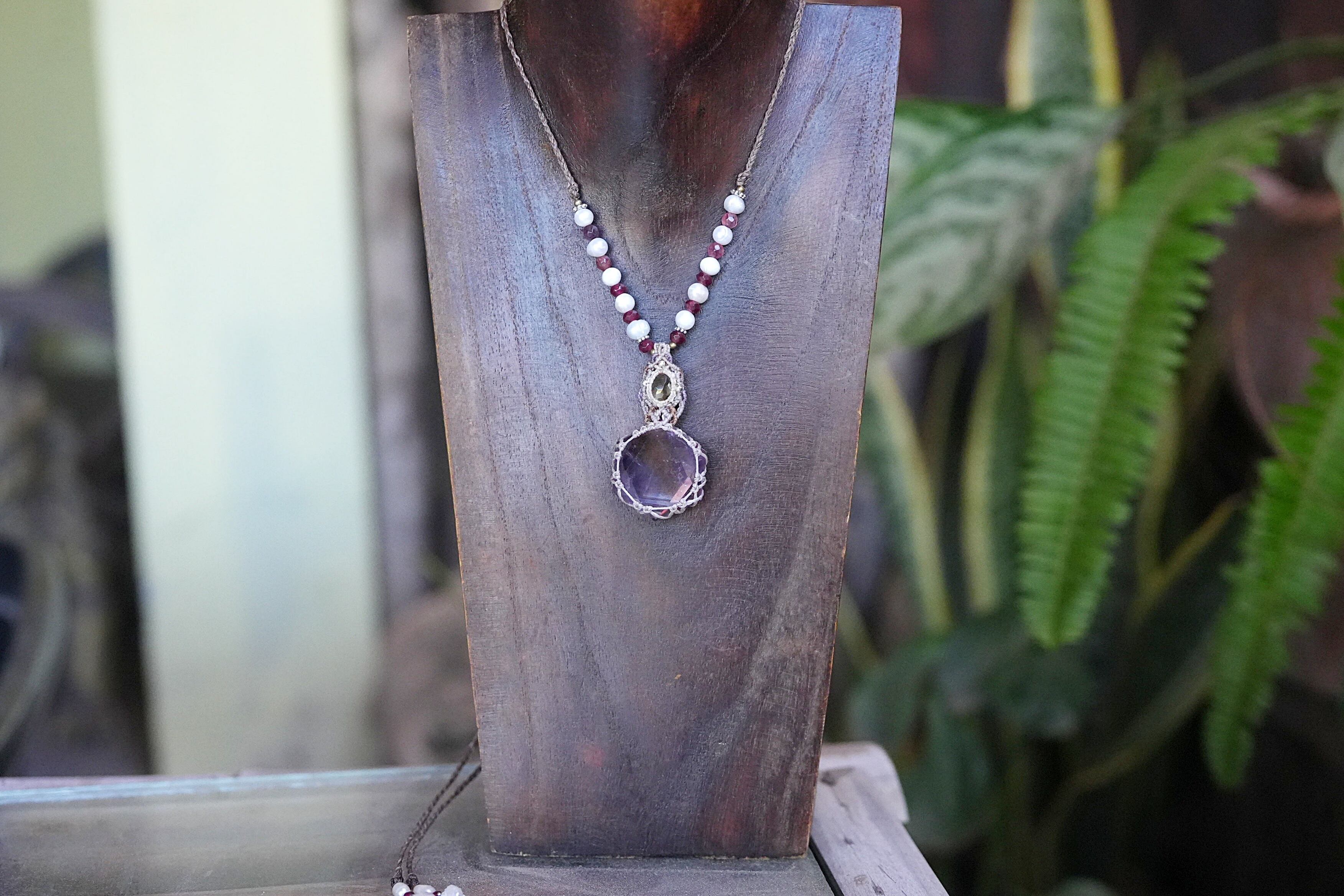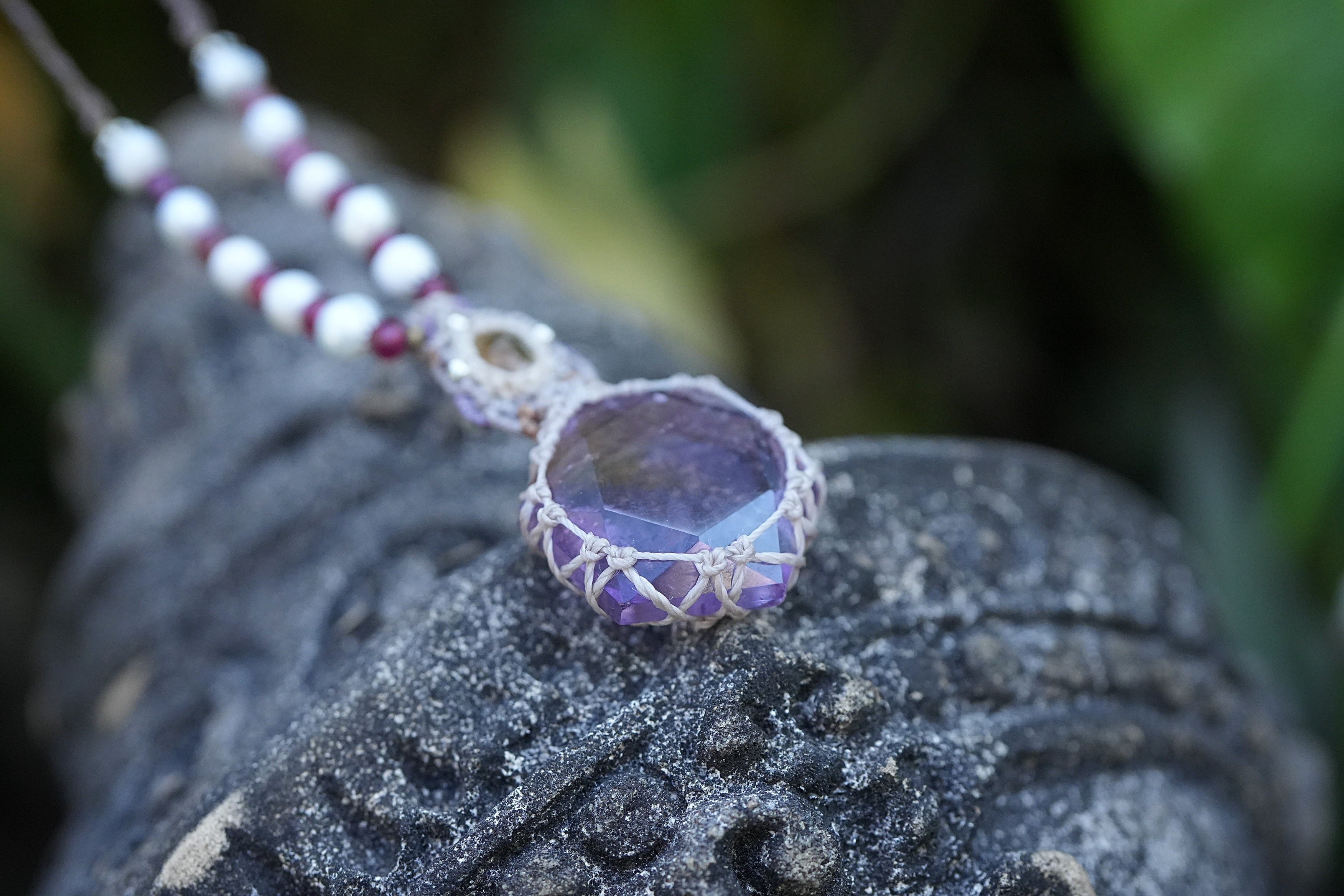 ◆このたびはキナリ、ナチュラルホワイト、パープル、テディベアブラウン、ゴールドブラウン色の蝋引き糸を使用しマクラメ編み装飾を施しました。