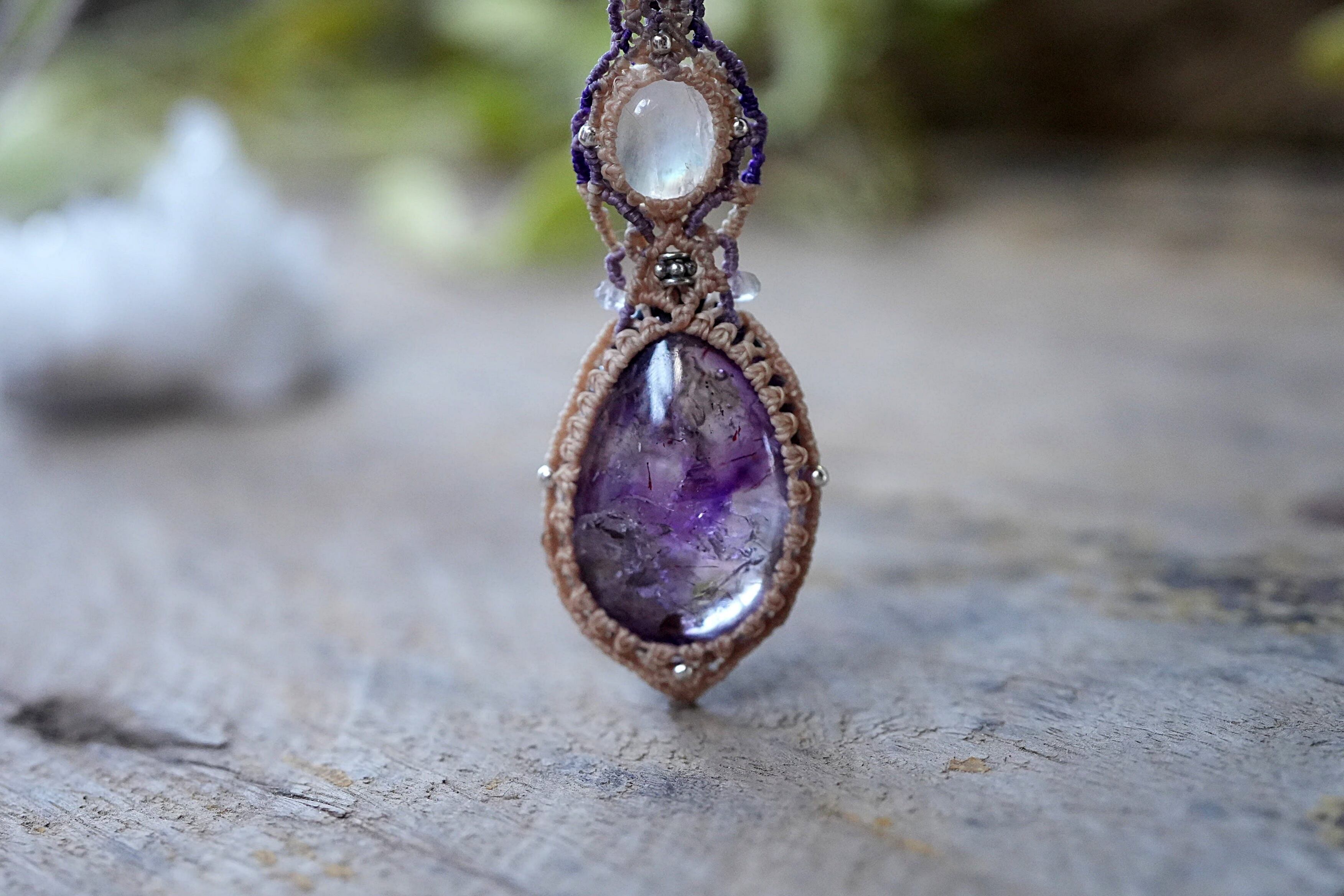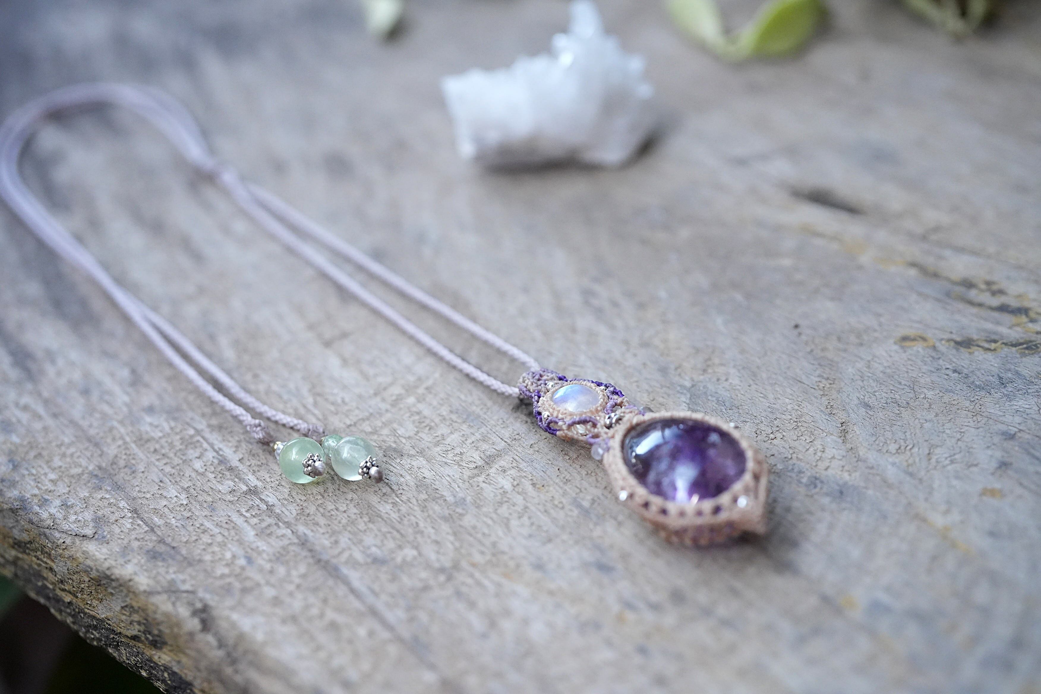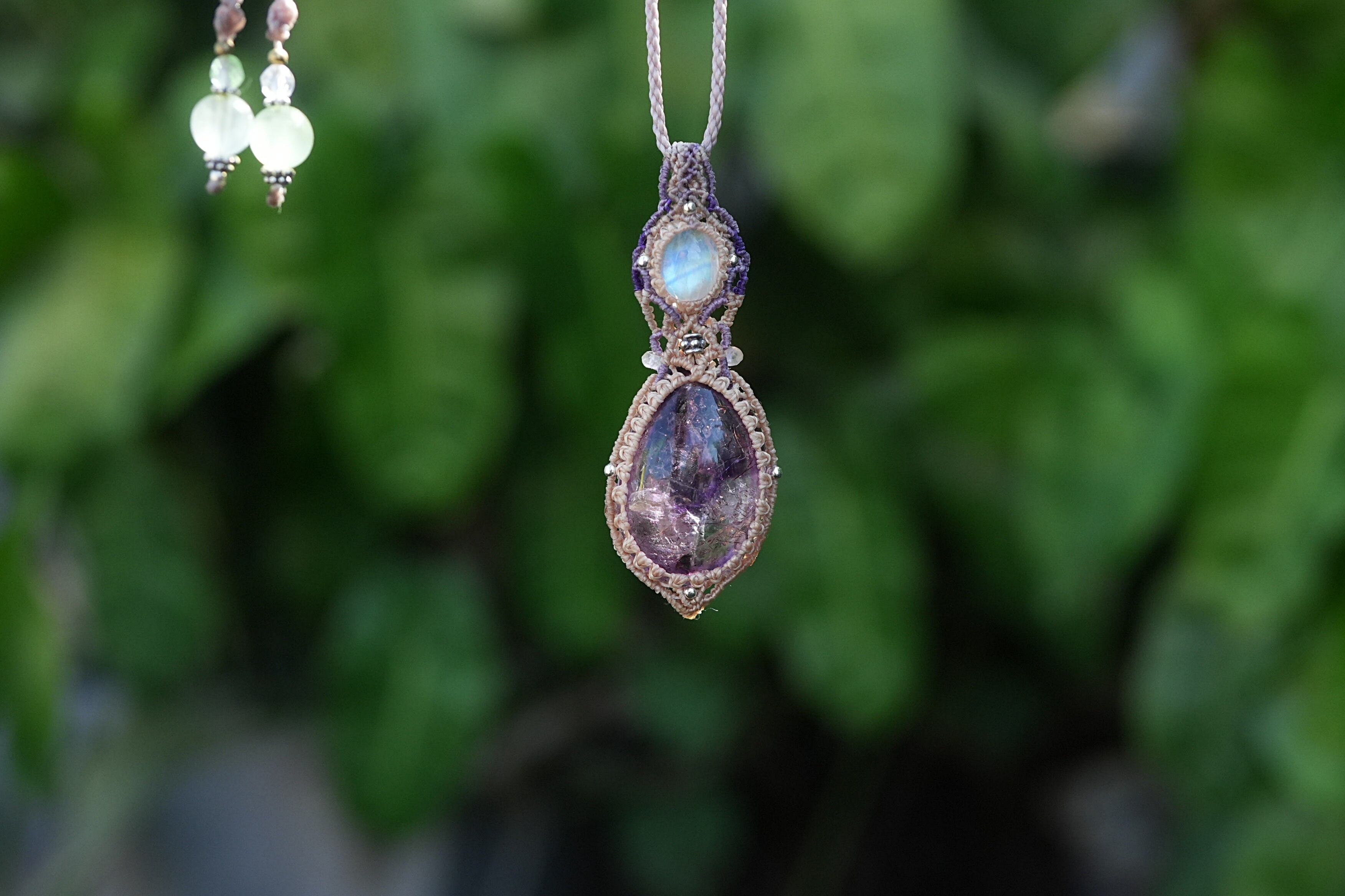 アメジストエンハイドロ(水入り水晶)moonstone マクラメネックレス1949