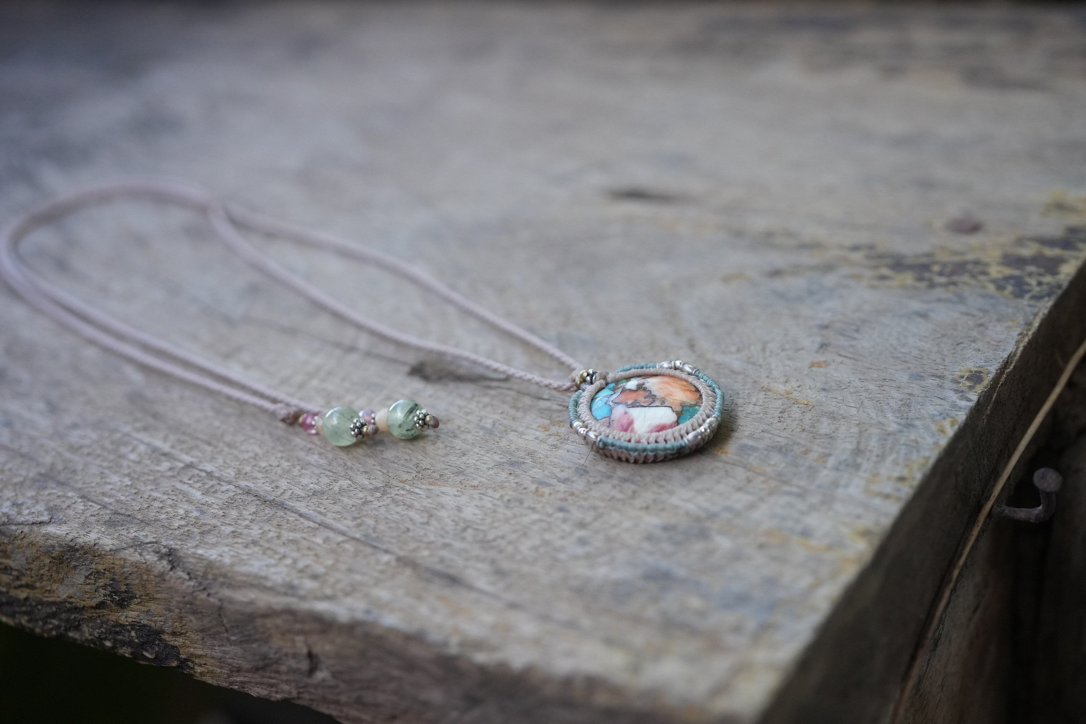 ◆このたびはナチュラルホワイト、ブルー、ミルクココア色の蝋引き糸を使用しマクラメ編み装飾を施しました。